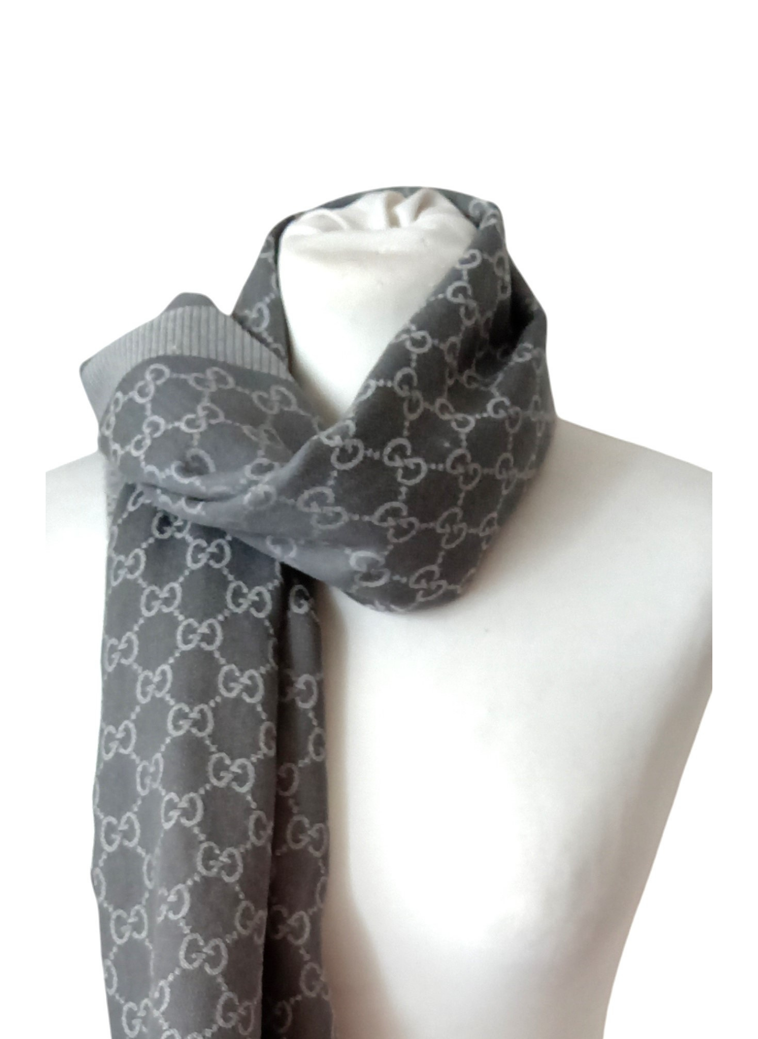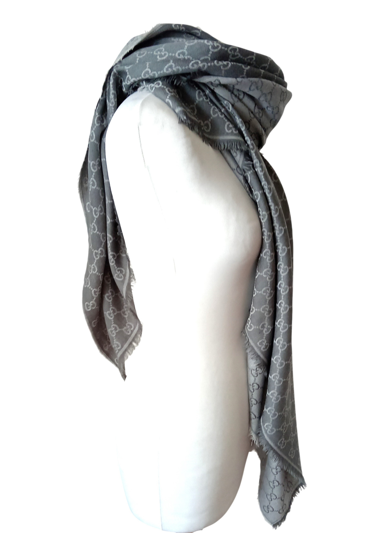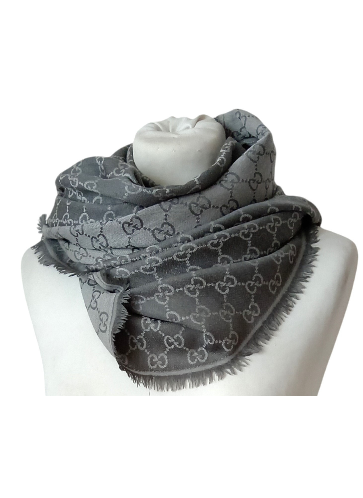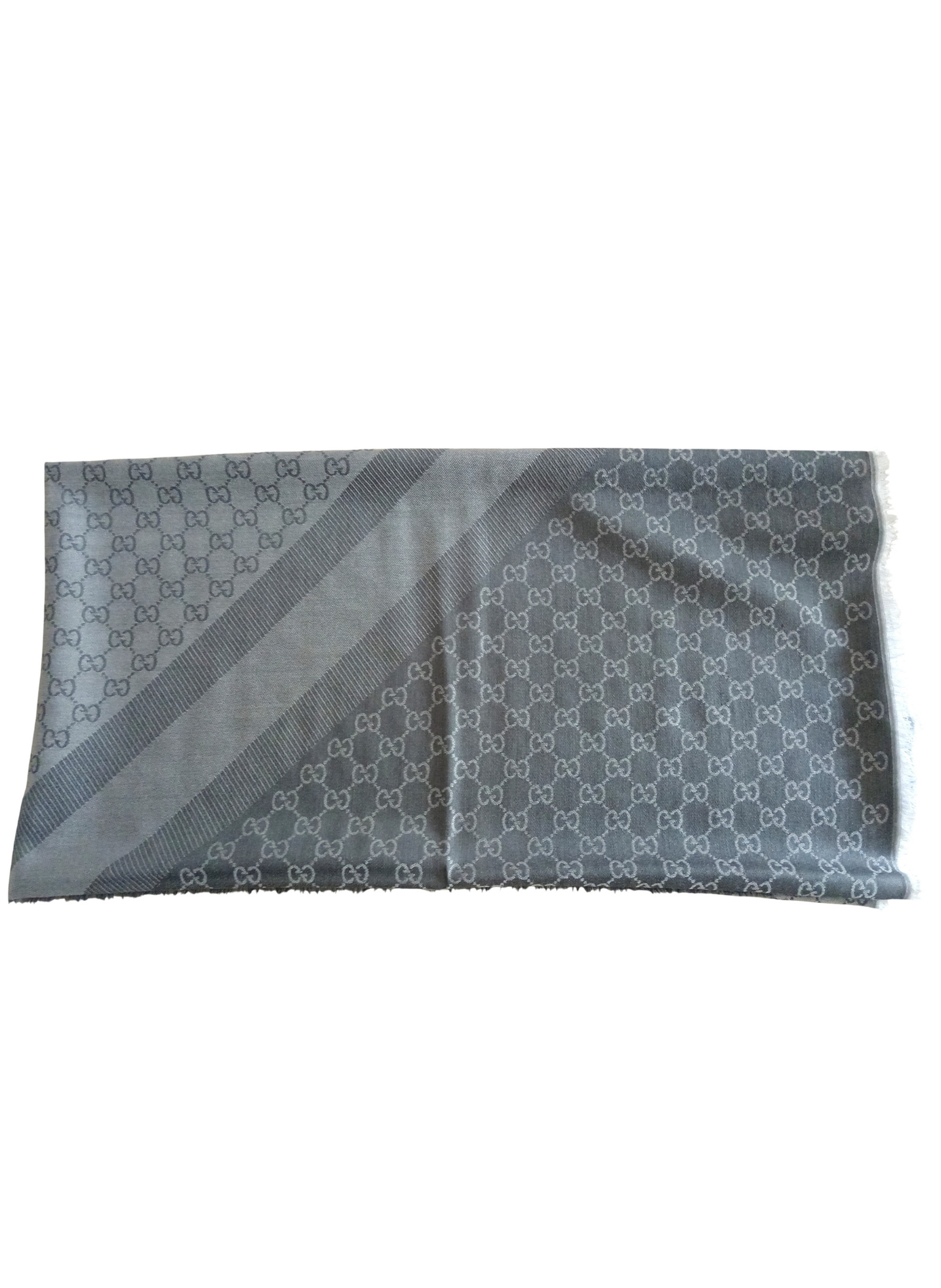 Pañuelo grande o Bufanda de Gucci,de lana gris monogram GG.en dos tonos de gris.Esta en muy buen estado.Medidas: 135 cms x  135 cms.