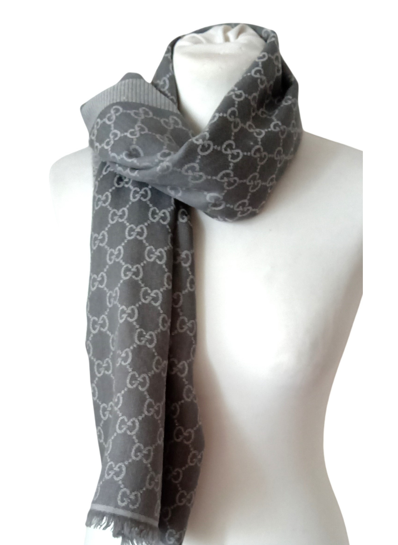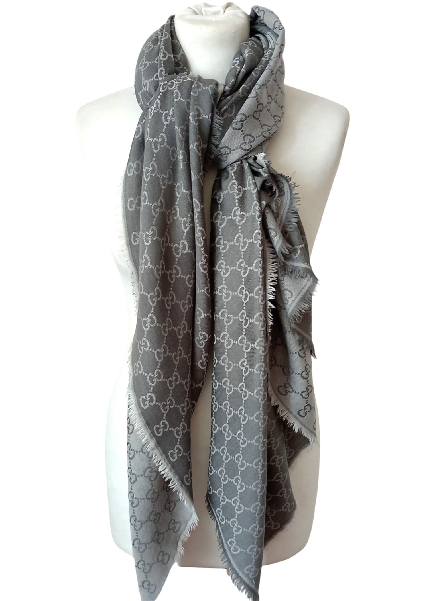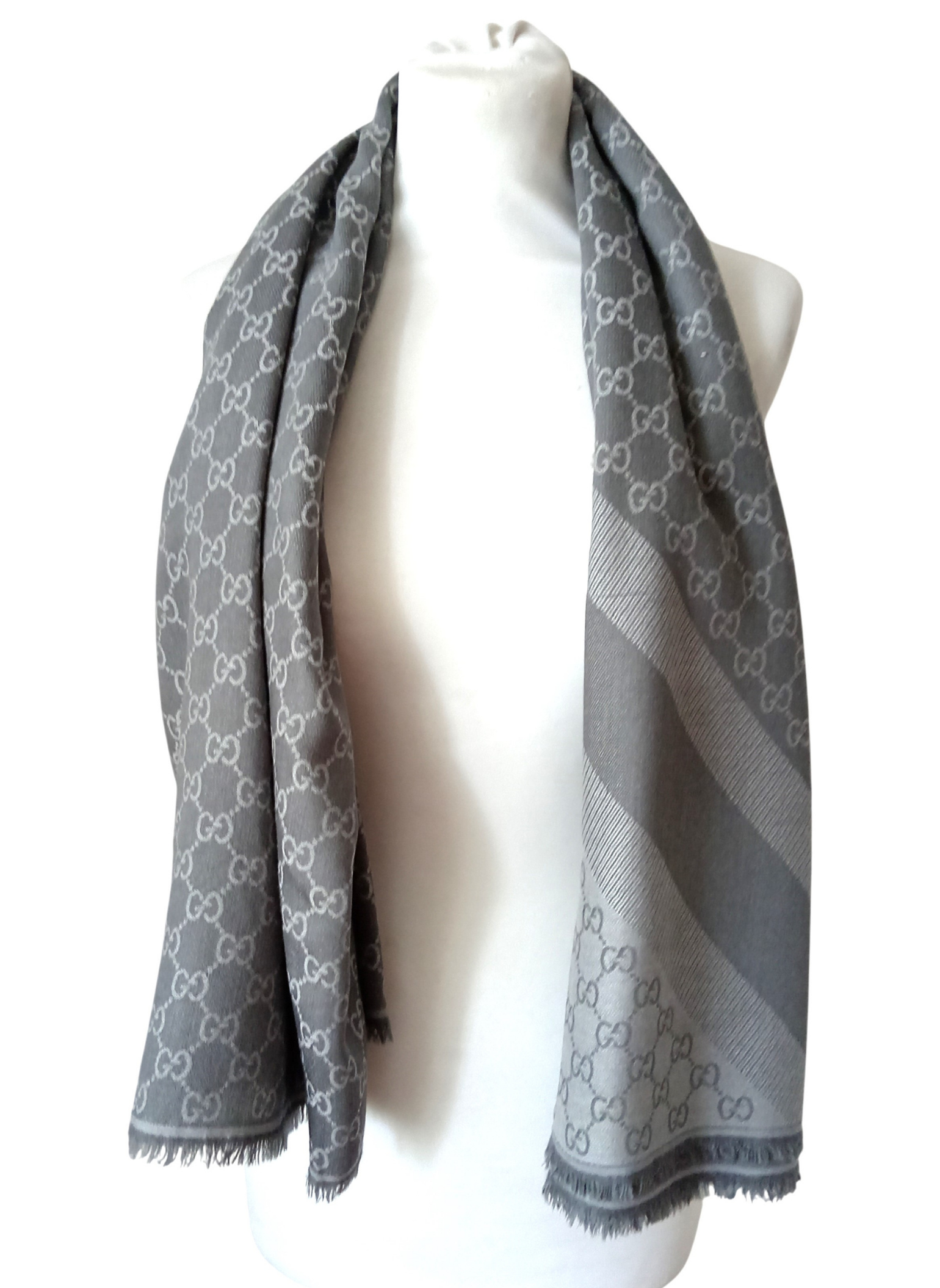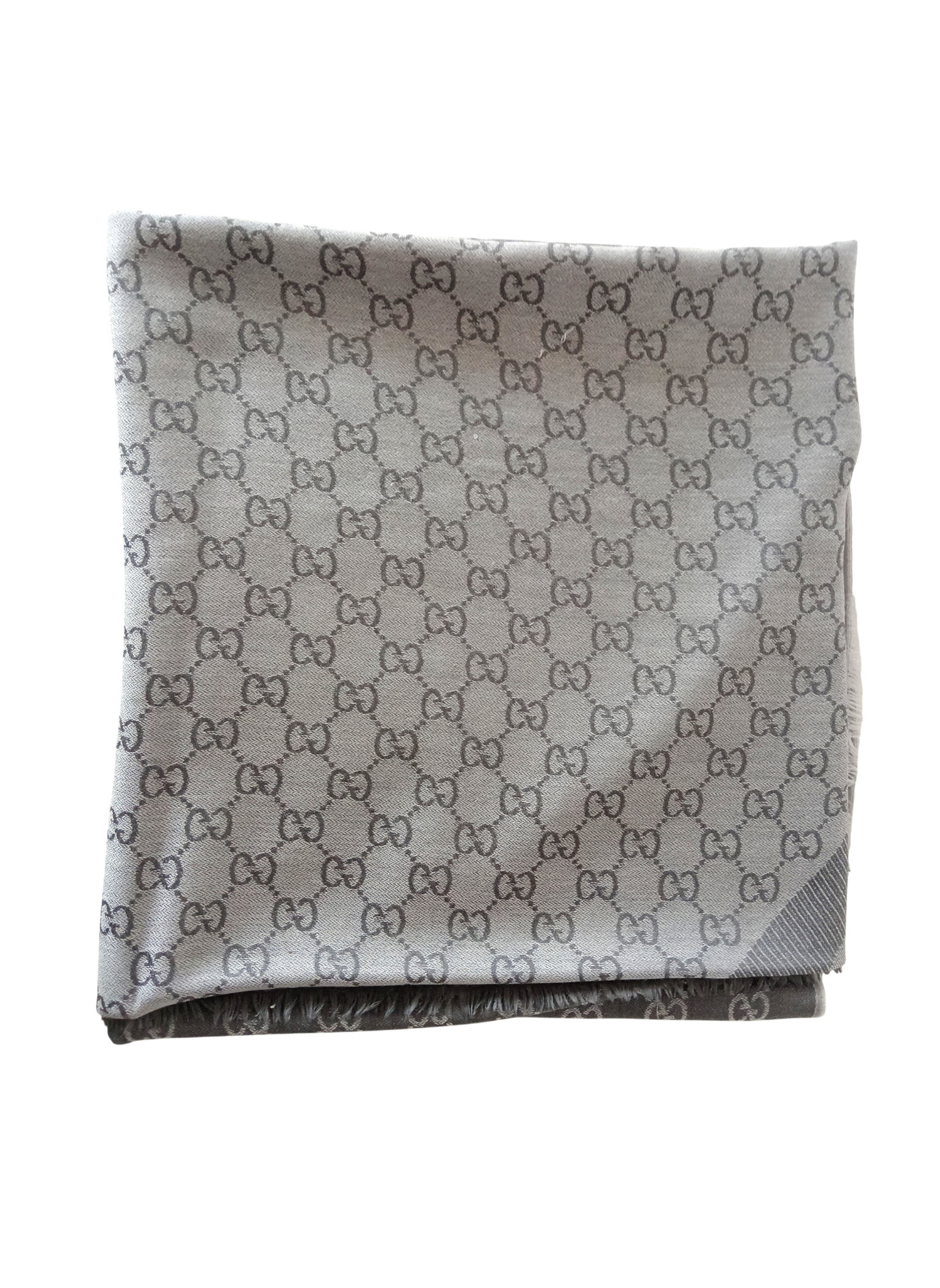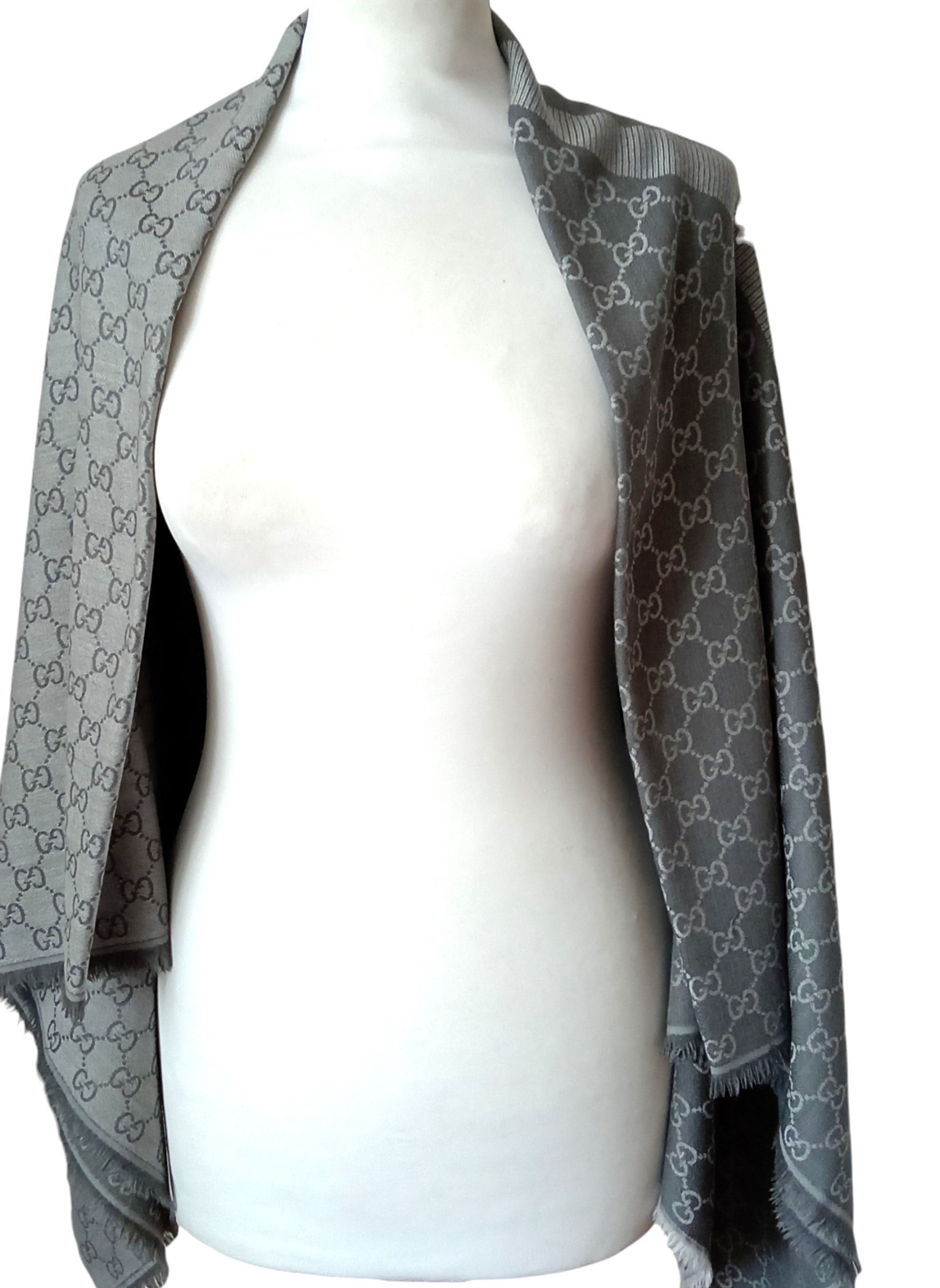 Pañuelo grande o Bufanda de Gucci,de lana gris monogram GG.en dos tonos de gris.Esta en muy buen estado.Medidas: 135 cms x  135 cms.