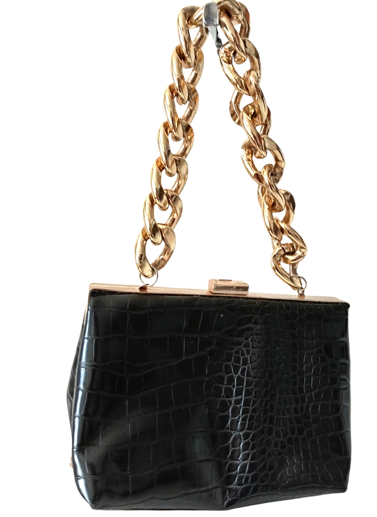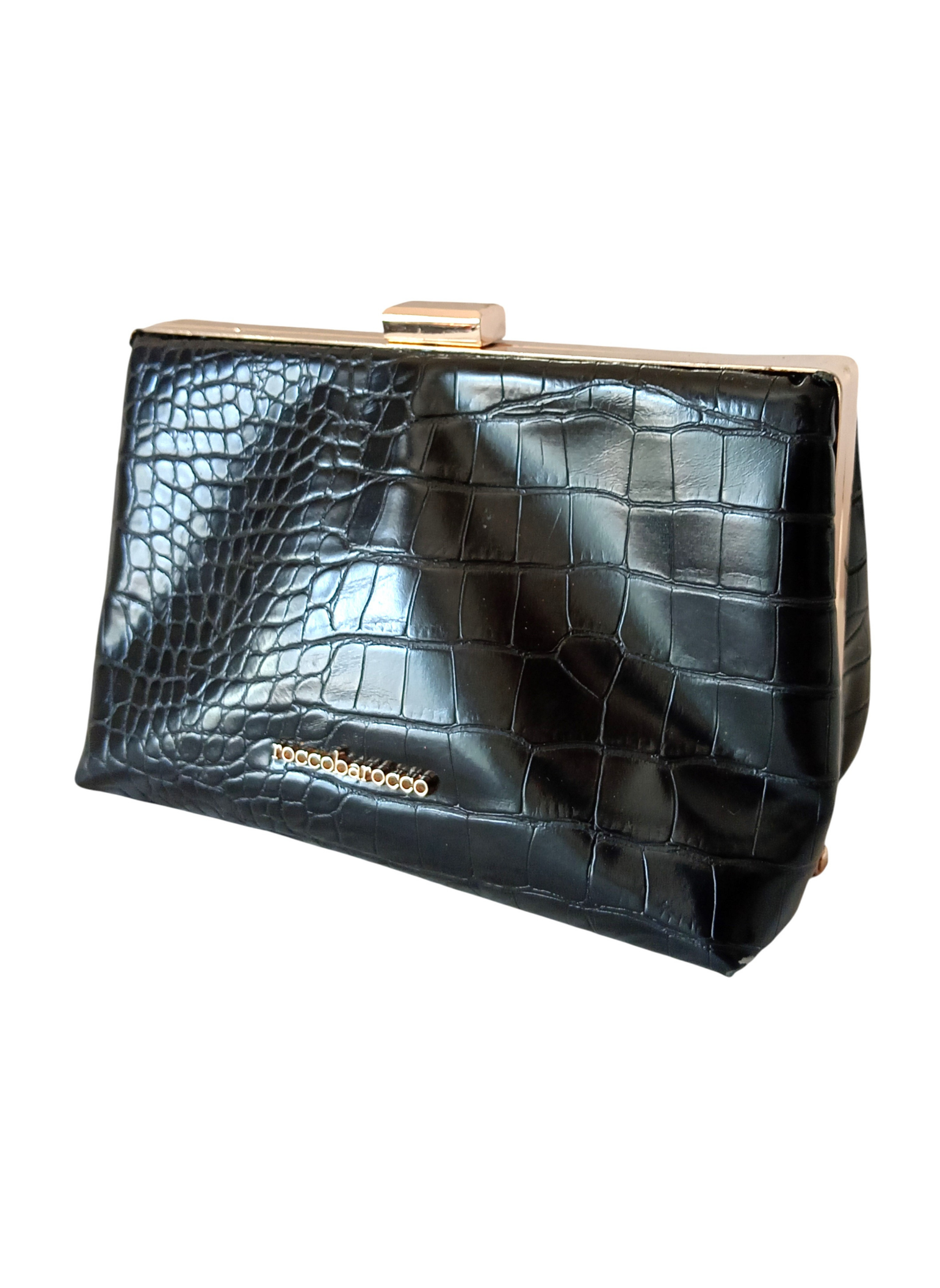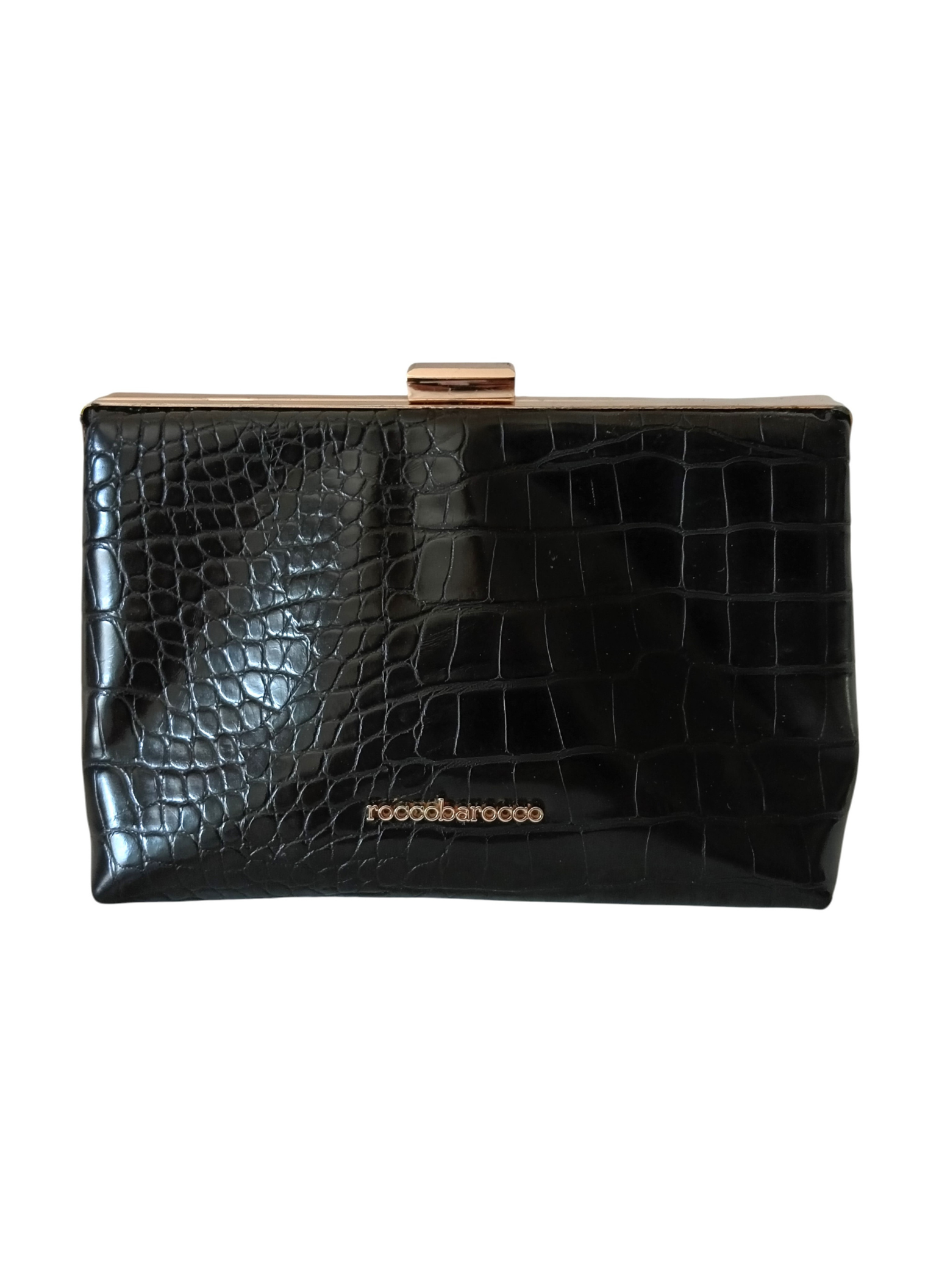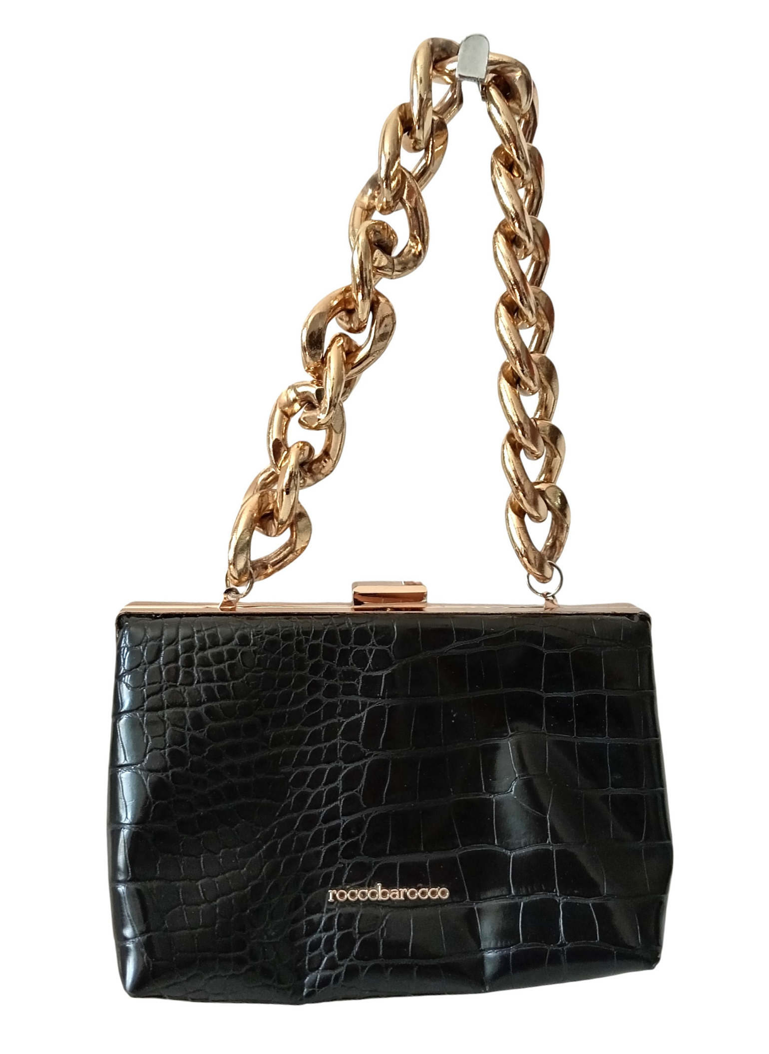 Bolso de fiesta de mano de Roccobarocco,color negro de piel efecto cocodrilo,con cadena gruesa dorada corta de eslabones.Cierre a presion,interior con dos departamentos y bolsillo central con cremallera.Muy buen estado.Medidas : 12 cms de alto x 17 cms de ancho x 10 cms de profundidad.