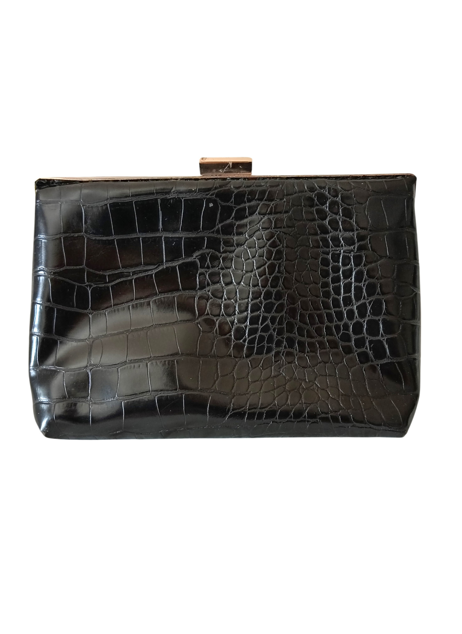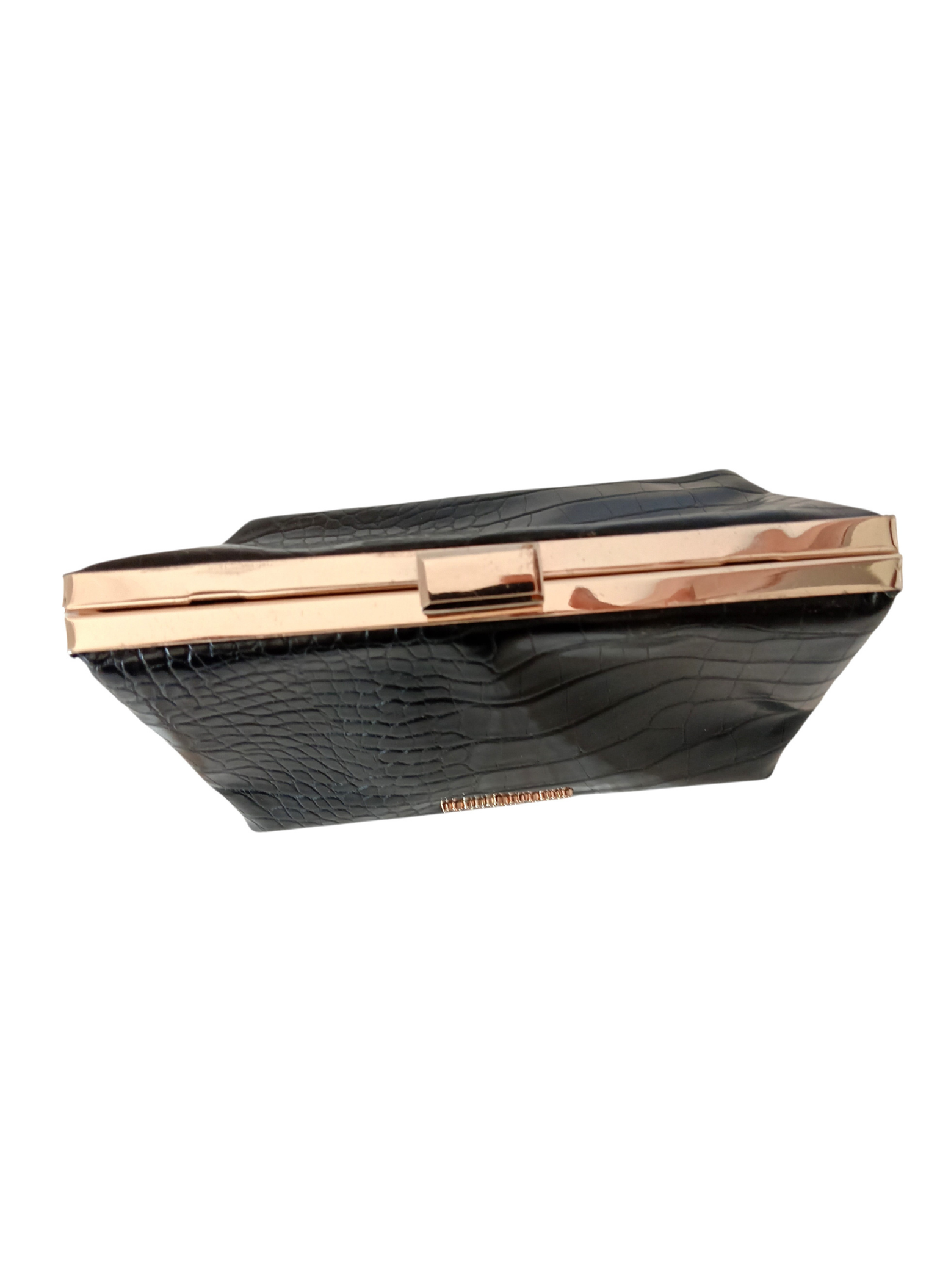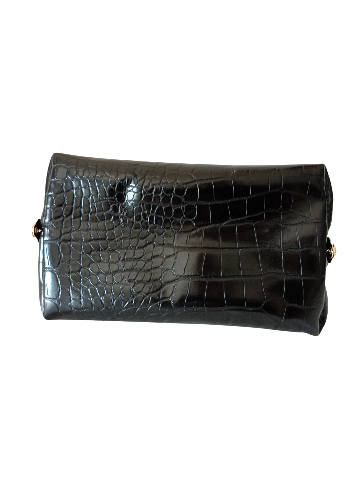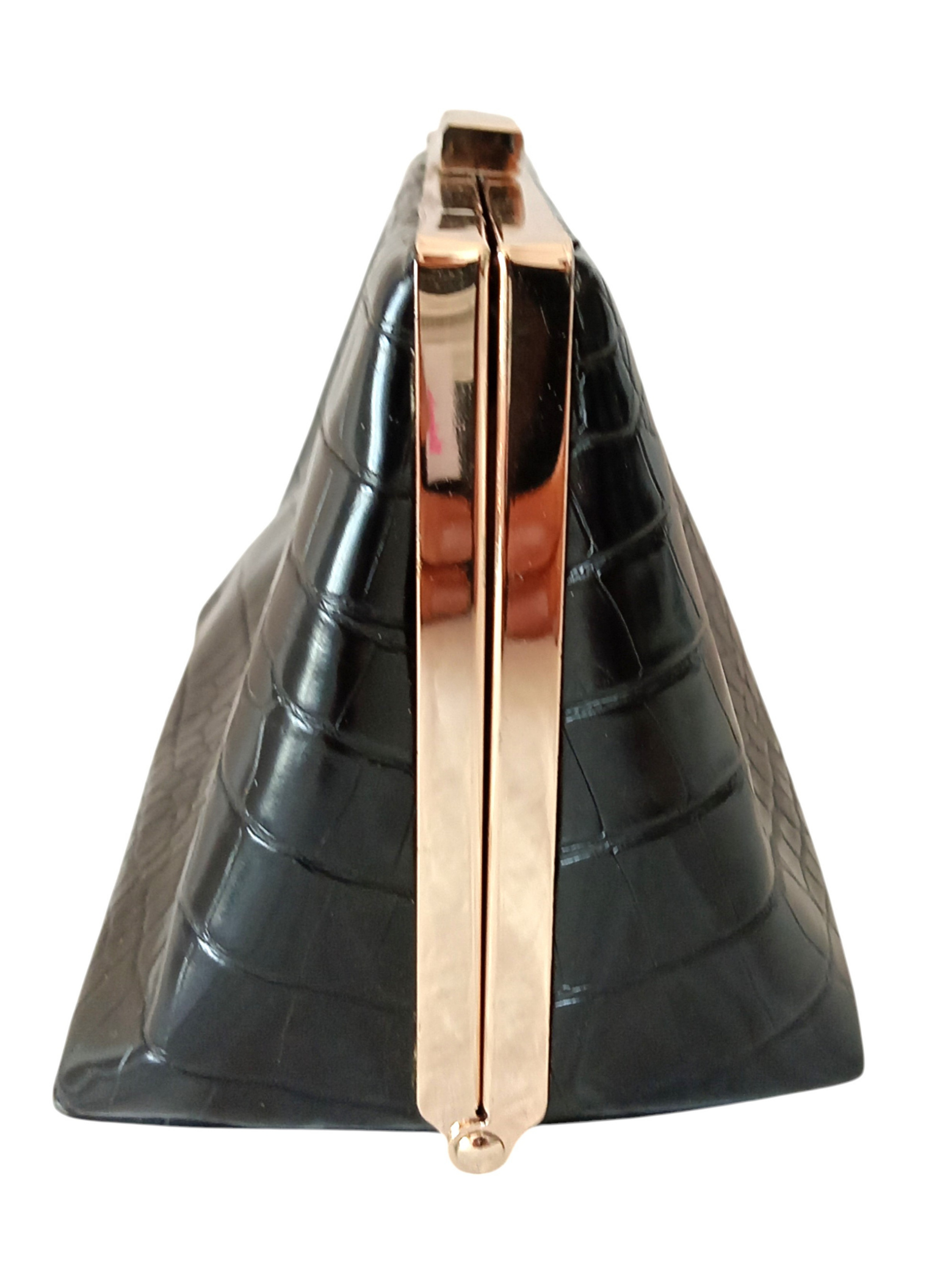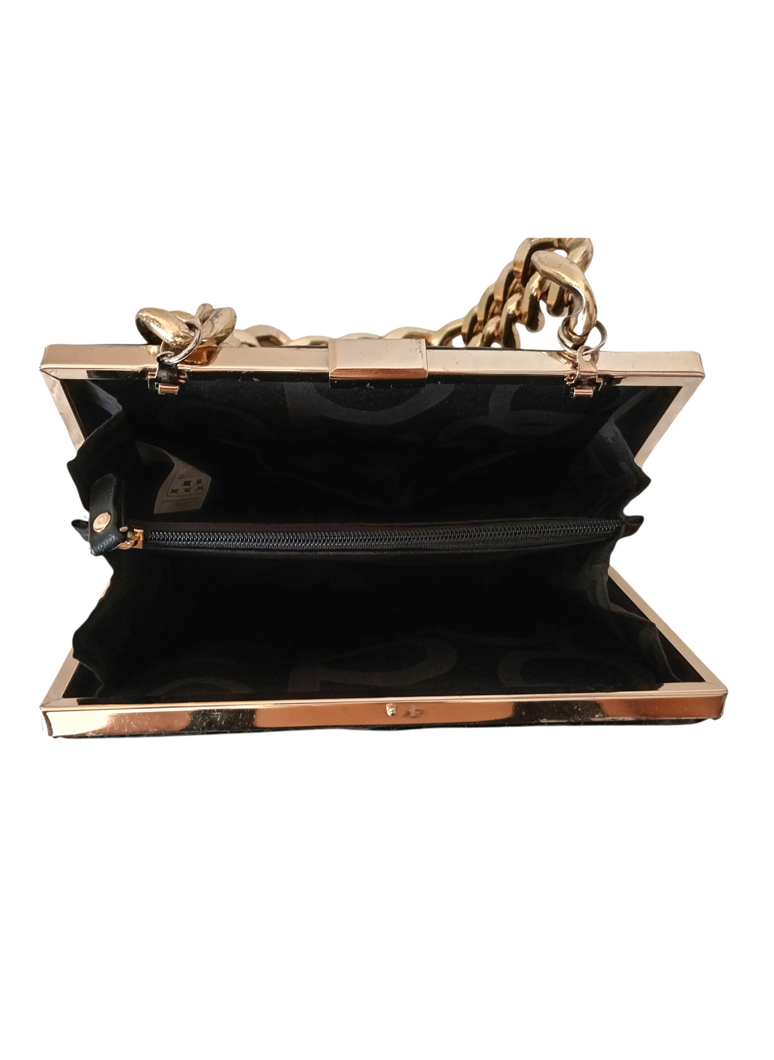 Bolso de fiesta de mano de Roccobarocco,color negro de piel efecto cocodrilo,con cadena gruesa dorada corta de eslabones.Cierre a presion,interior con dos departamentos y bolsillo central con cremallera.Muy buen estado.Medidas : 12 cms de alto x 17 cms de ancho x 10 cms de profundidad.
