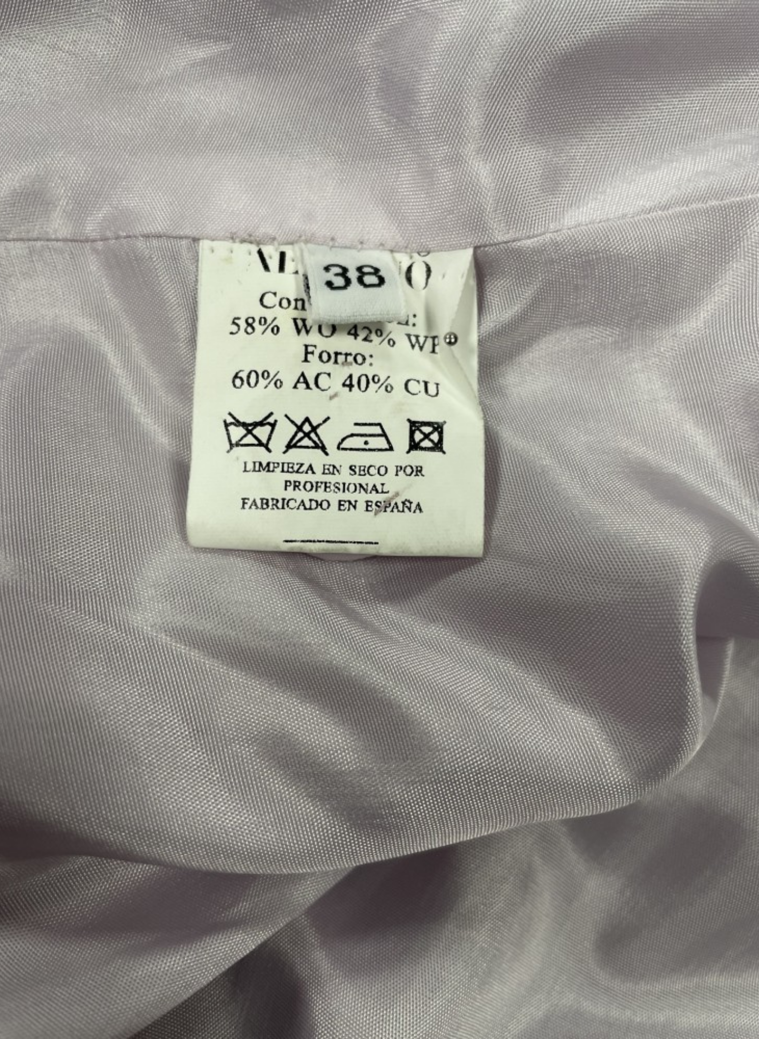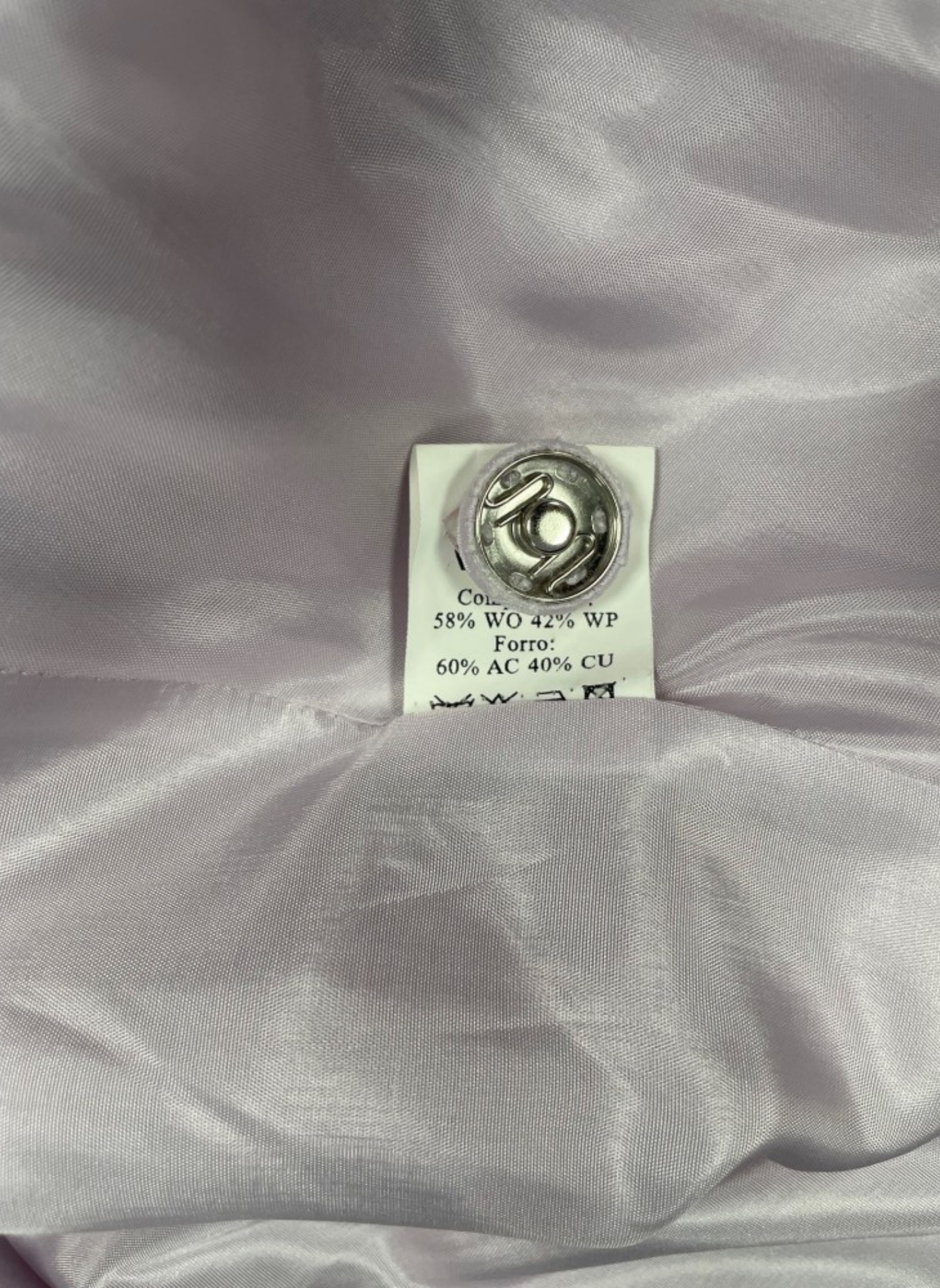 Los materiales de este abrigo son 58% WO y 42% WP, y las dimensiones son 40cms de hombro y 96cms de largo.