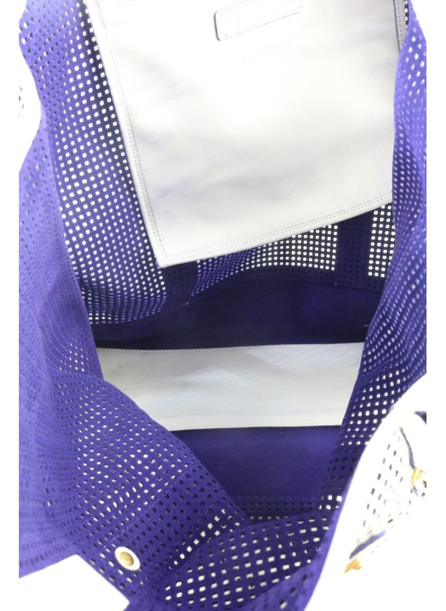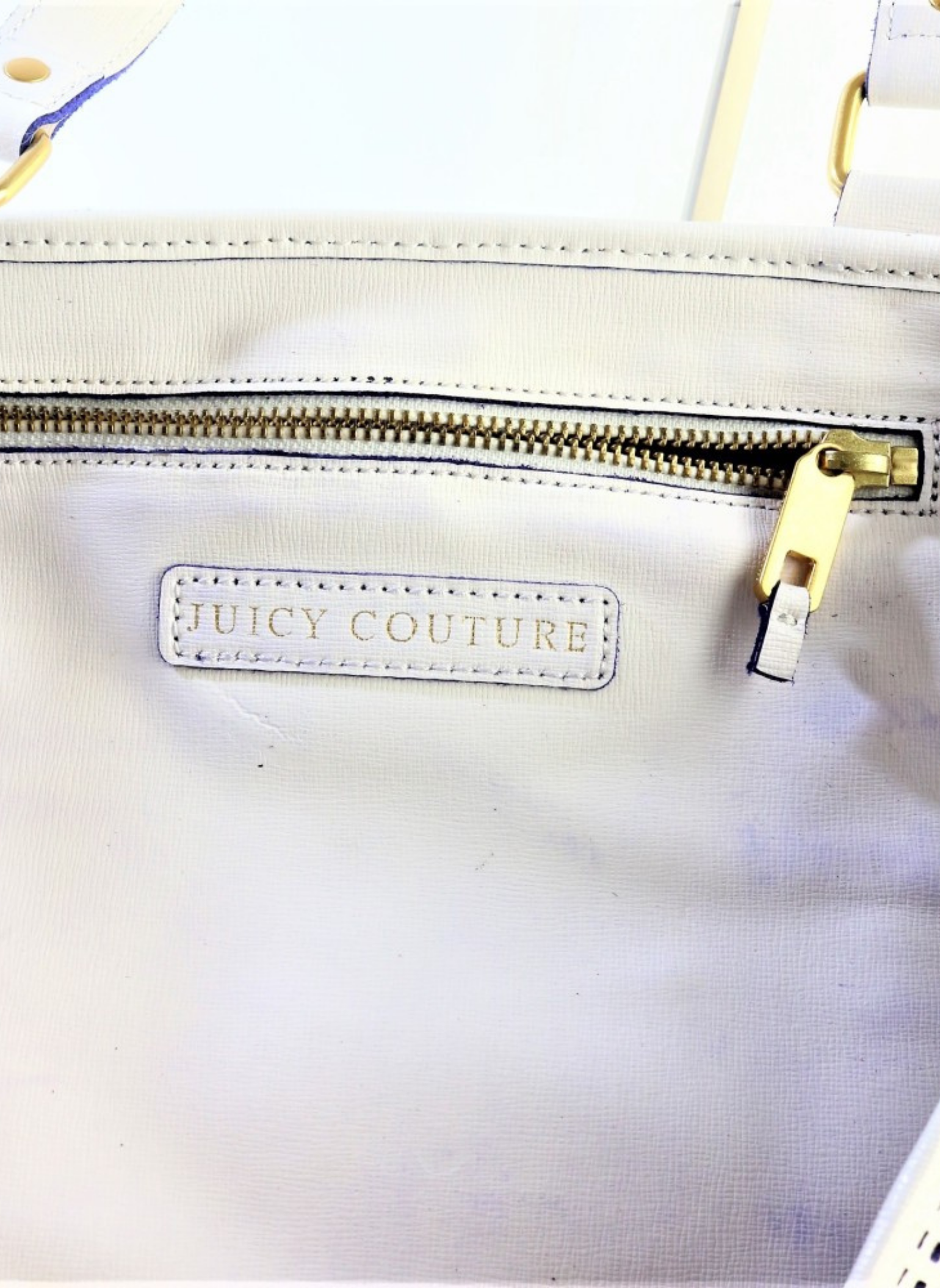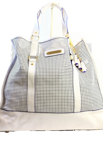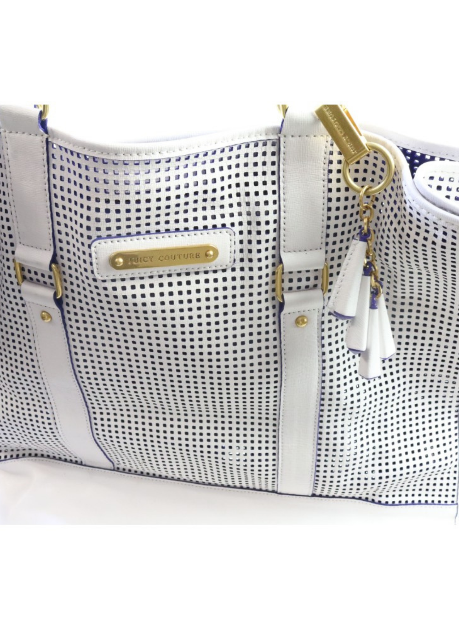 Bolso de la marca Juice Couture en cuero blanco con cuadrados perforados con efecto red.Contiene dos asas de mano y un adorno colgante con clip.Bolso amplio. El interior presenta un color morado y bolsillo de cuero con cremallera, fondo de cuero blanco. Este bolso no presenta ninguna señal de uso.
