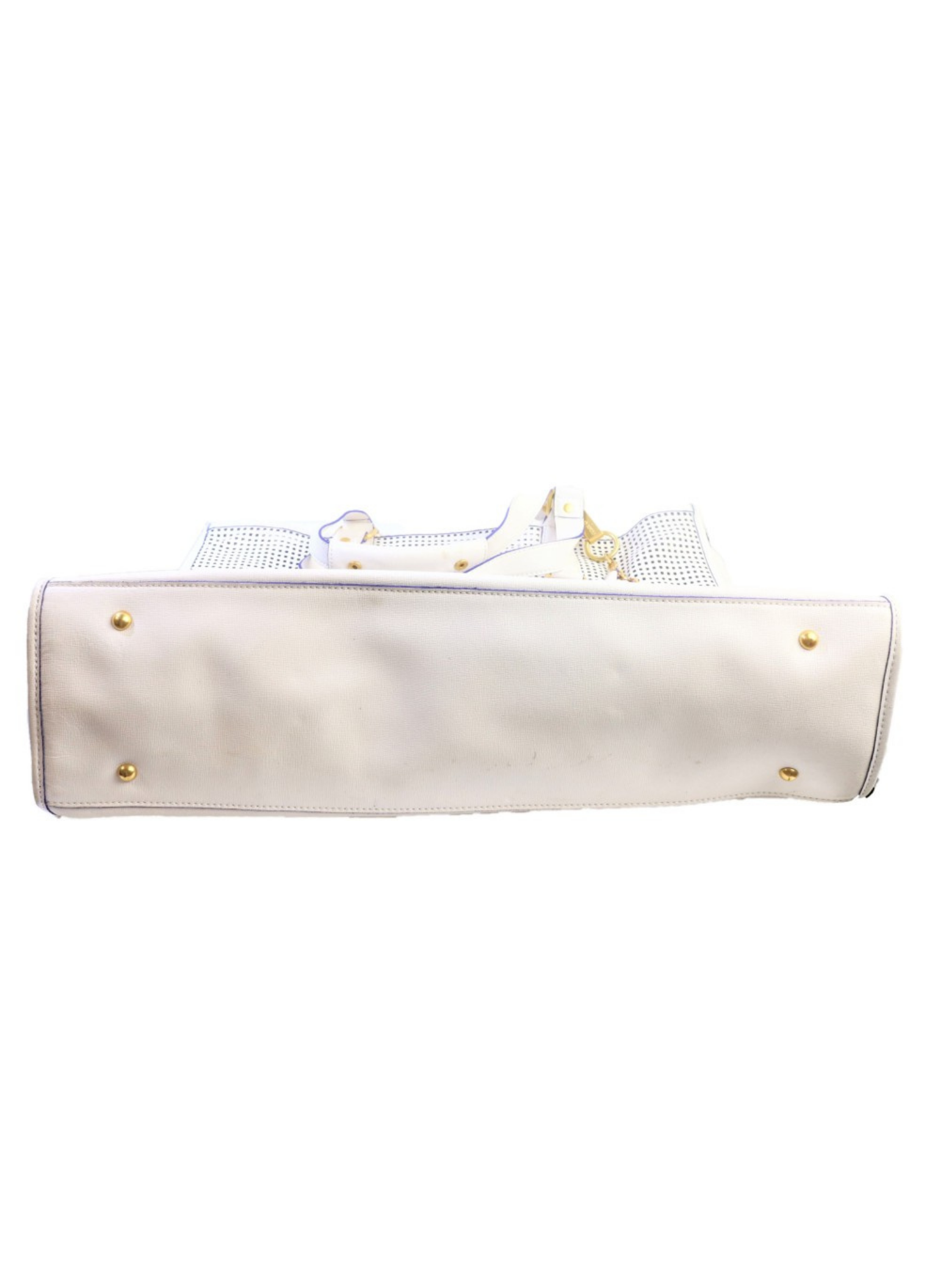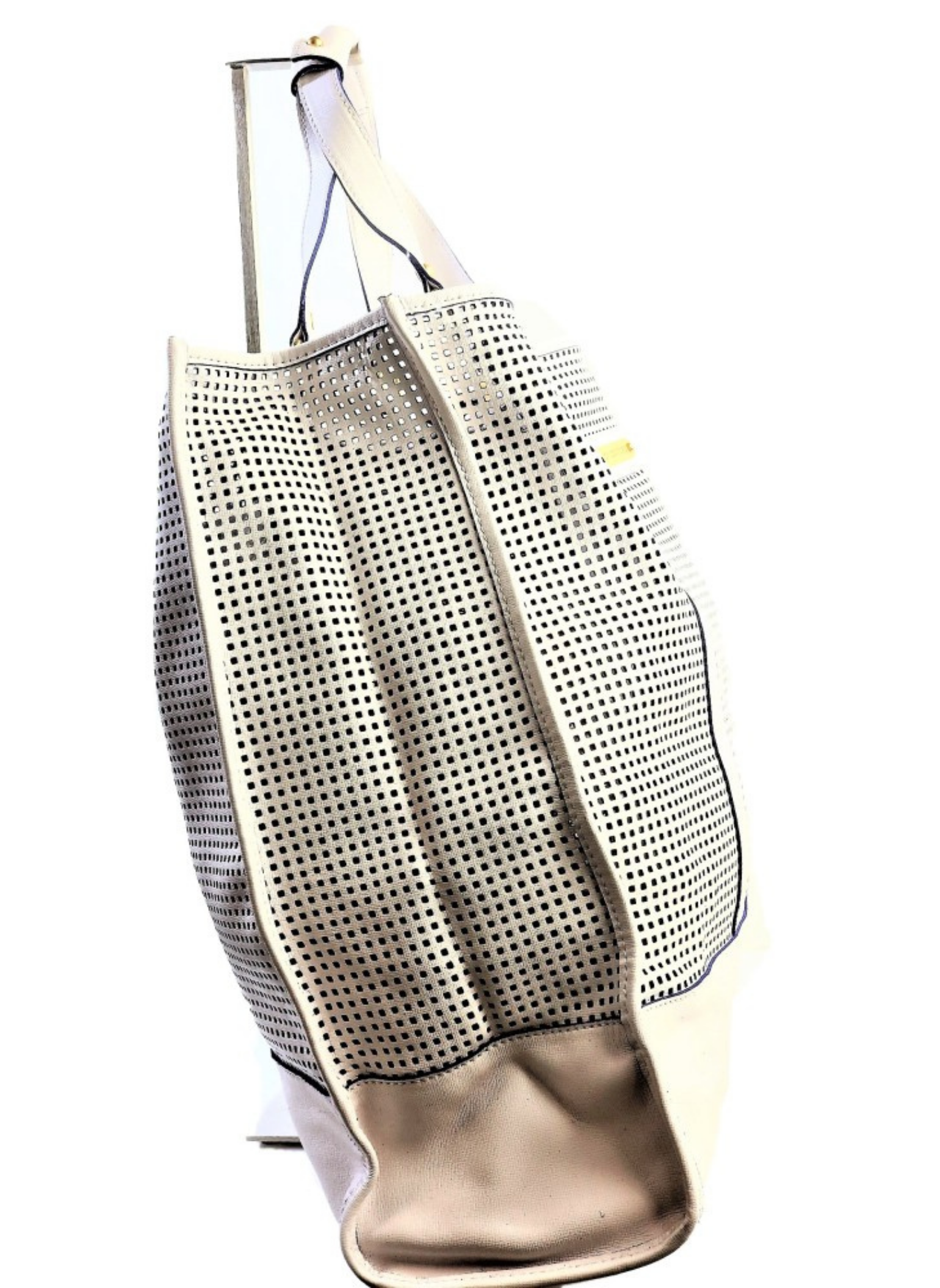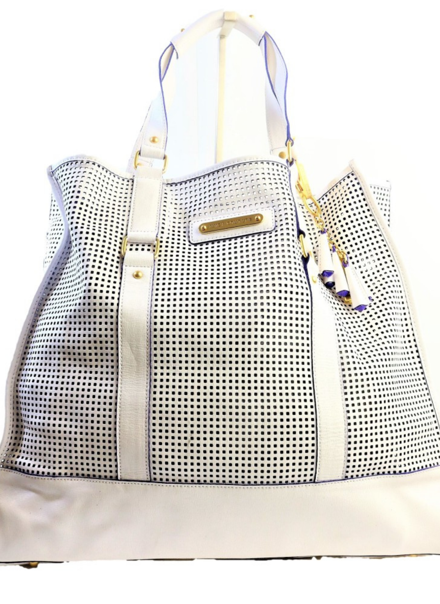 Bolso de la marca Juice Couture en cuero blanco con cuadrados perforados con efecto red.Contiene dos asas de mano y un adorno colgante con clip.Bolso amplio. El interior presenta un color morado y bolsillo de cuero con cremallera, fondo de cuero blanco. Este bolso no presenta ninguna señal de uso.
