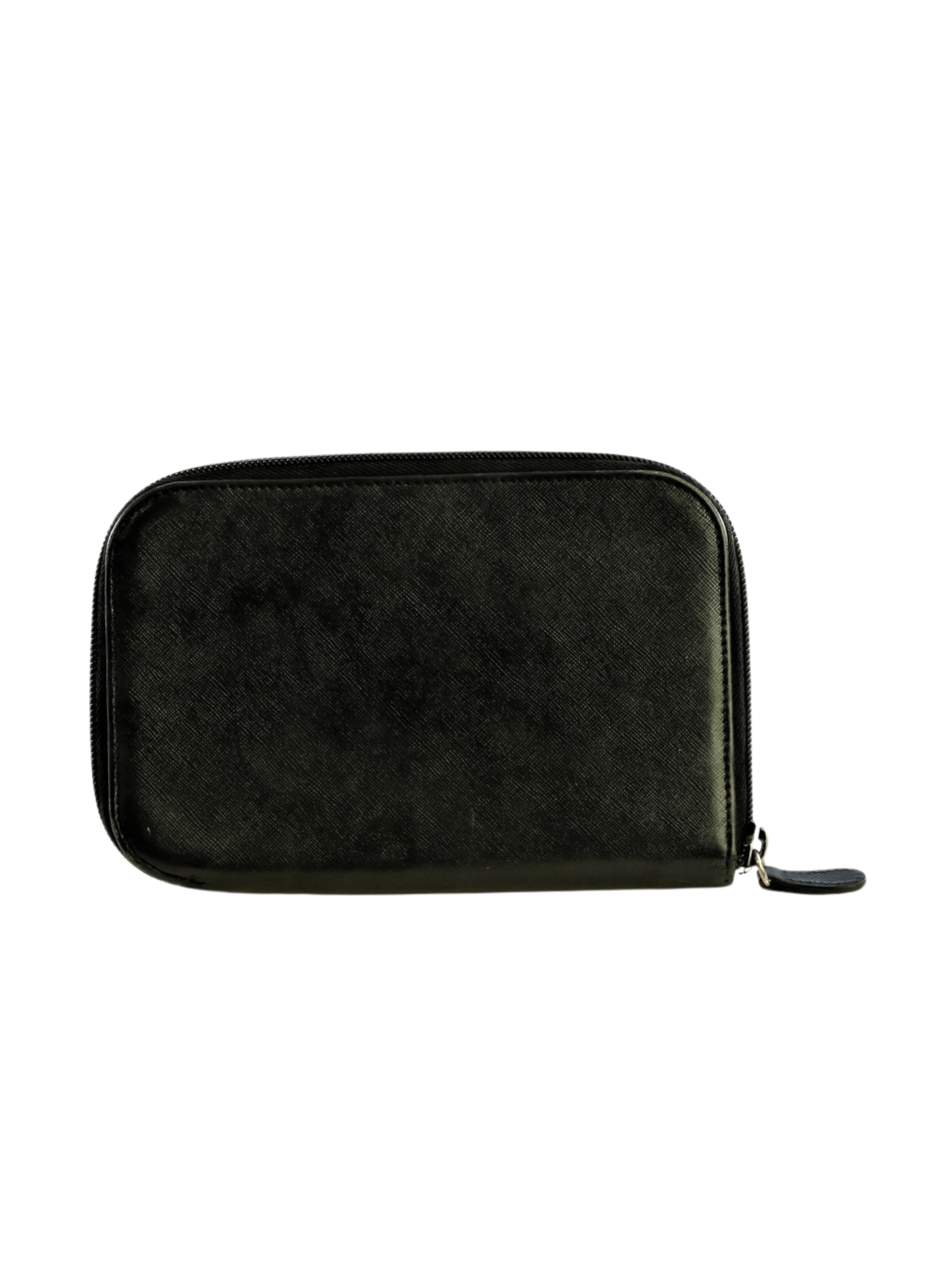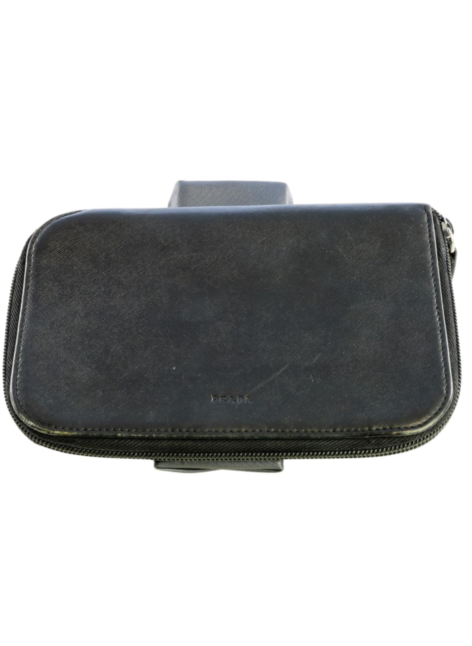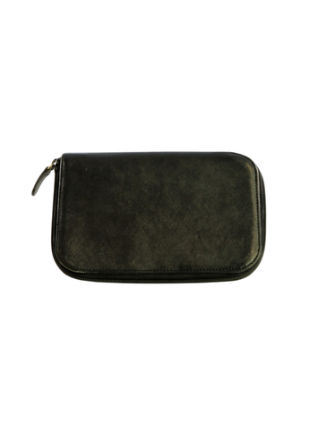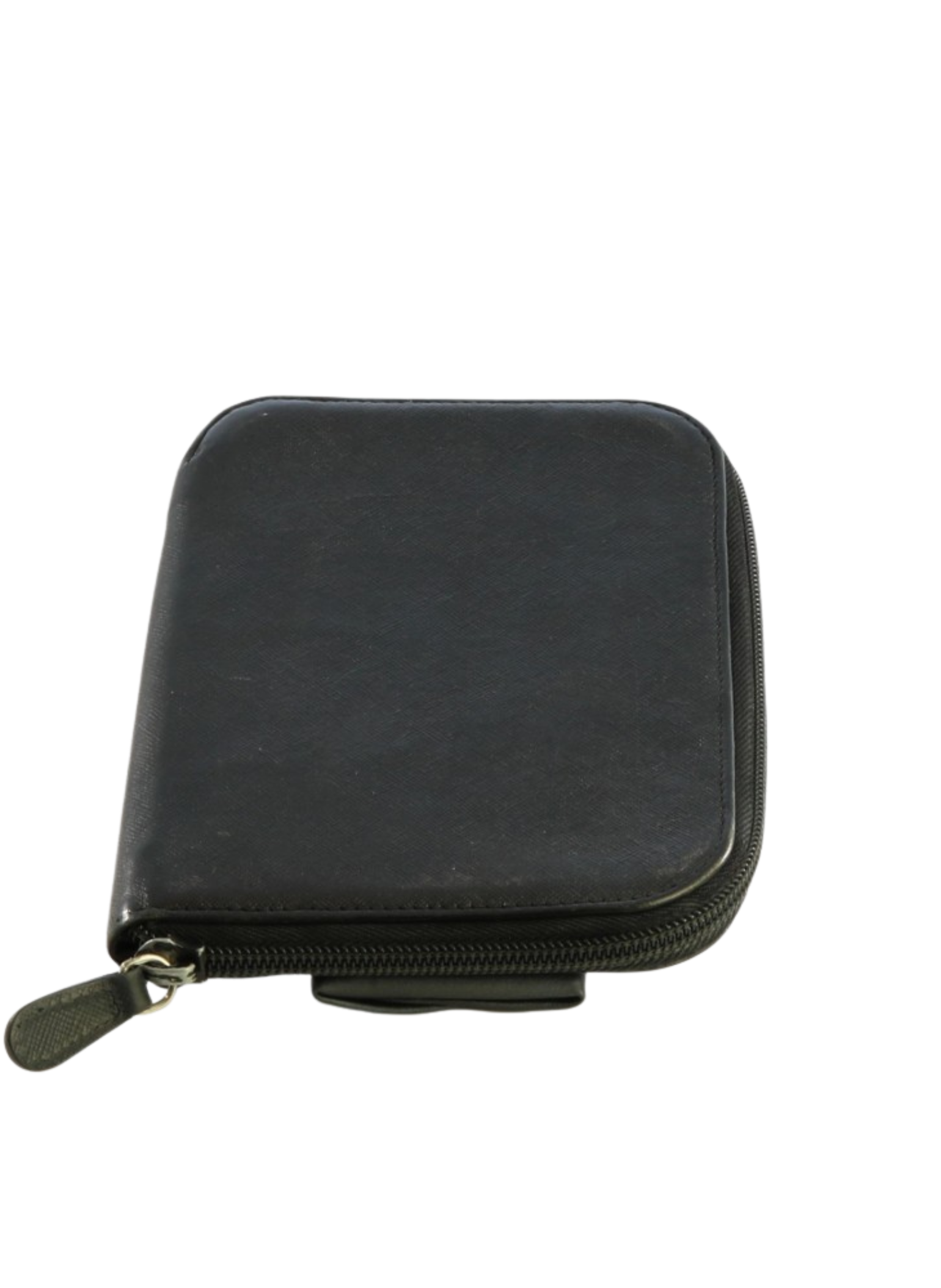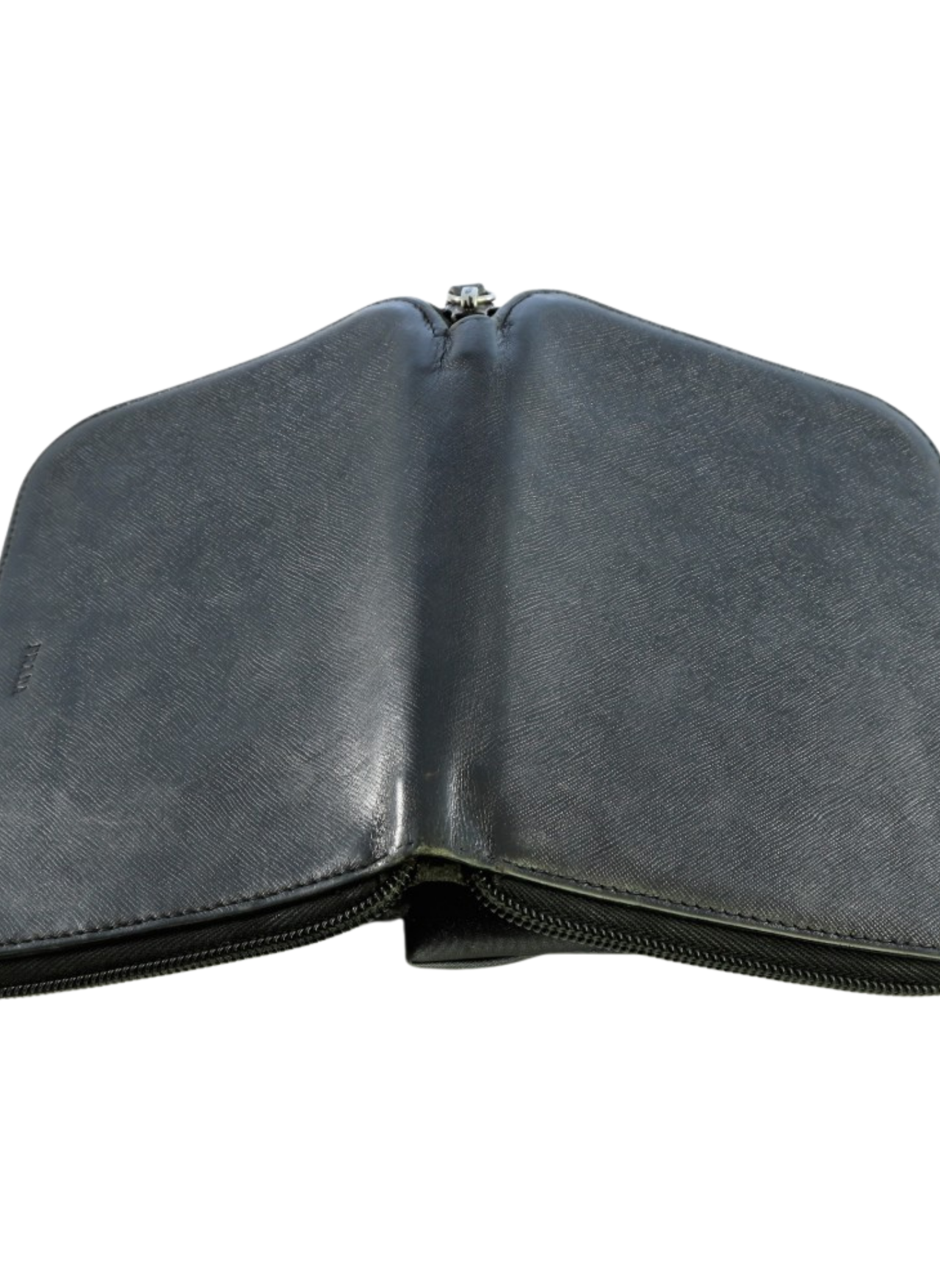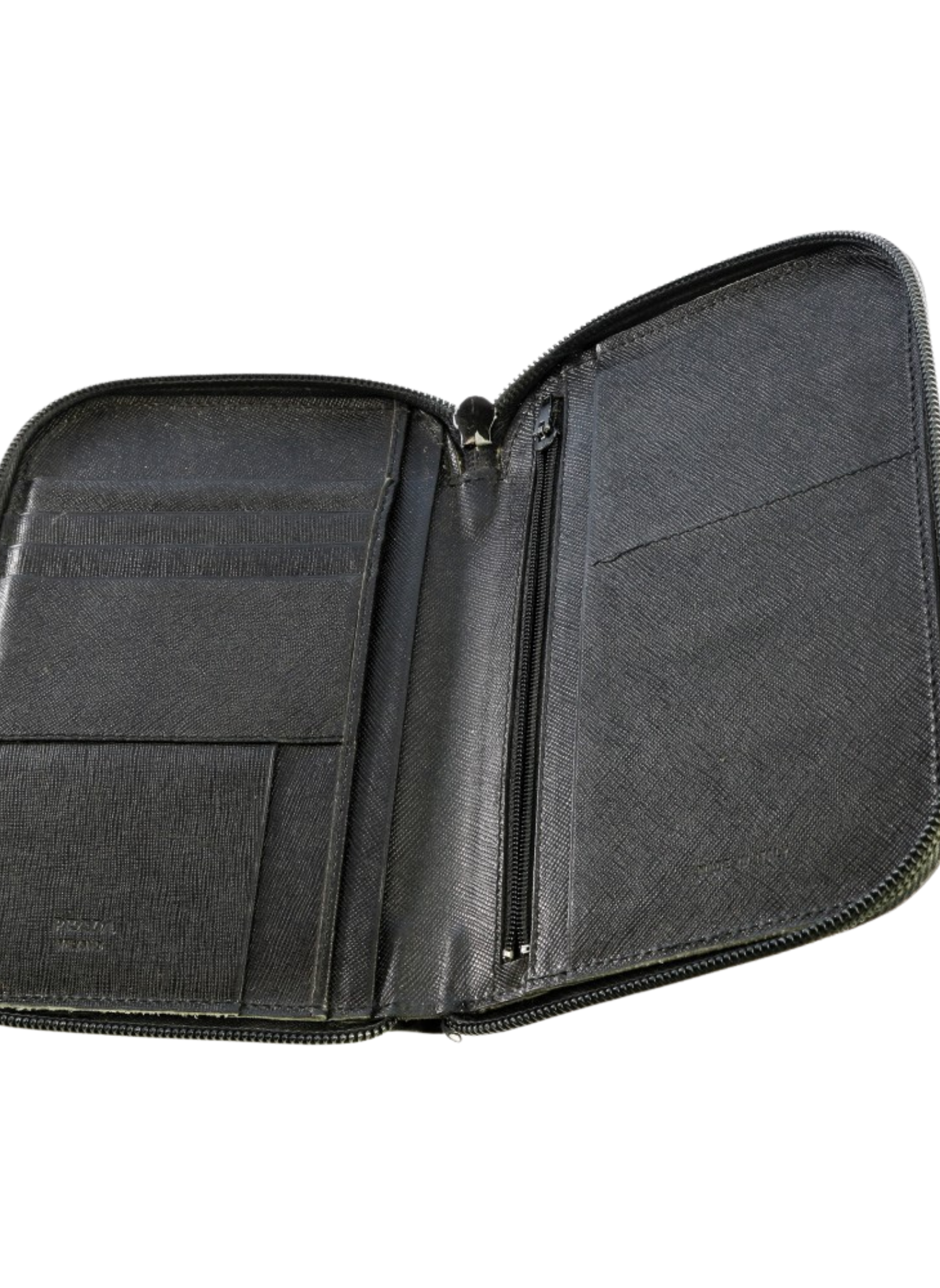 Cartera portadocumentos negra de la marca Prada, elaborada con piel Saffiano con divisiones para tarjetas y todo tipo de documentación. Contiene un cierre con cremallera. No contiene signos de uso.