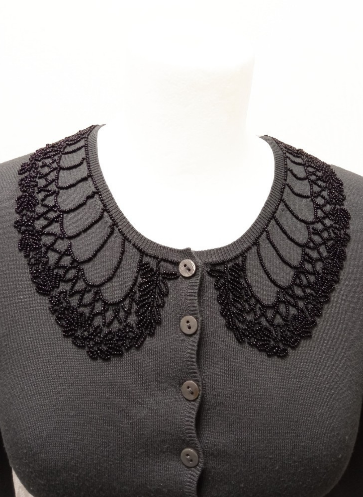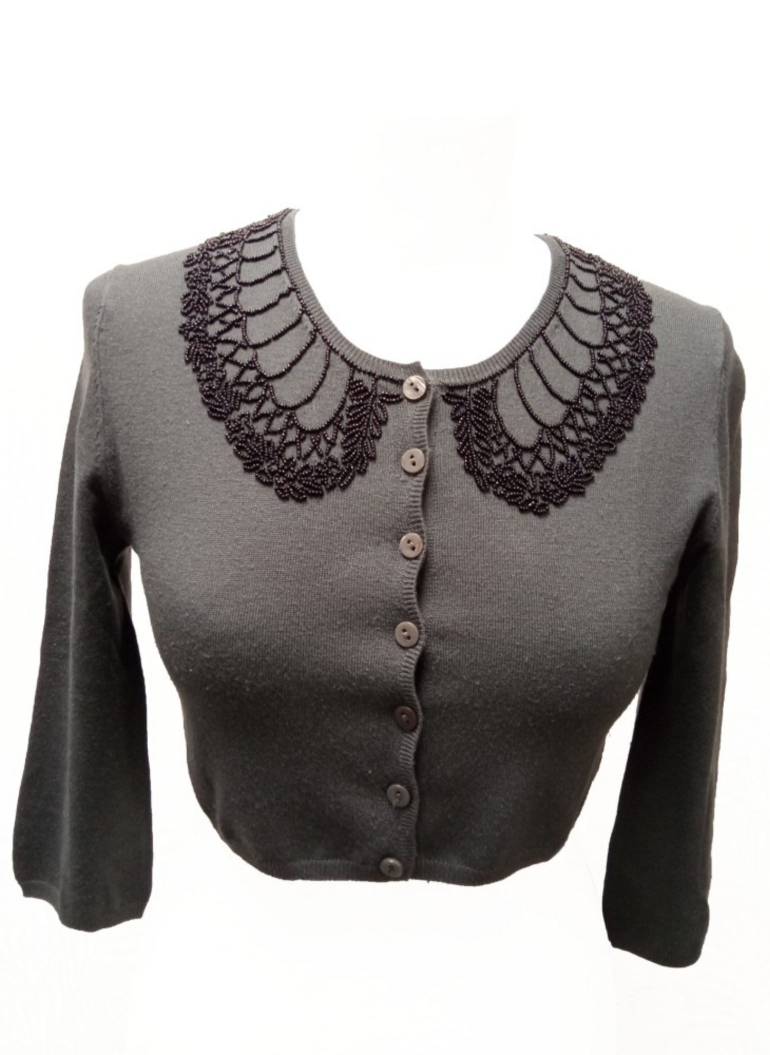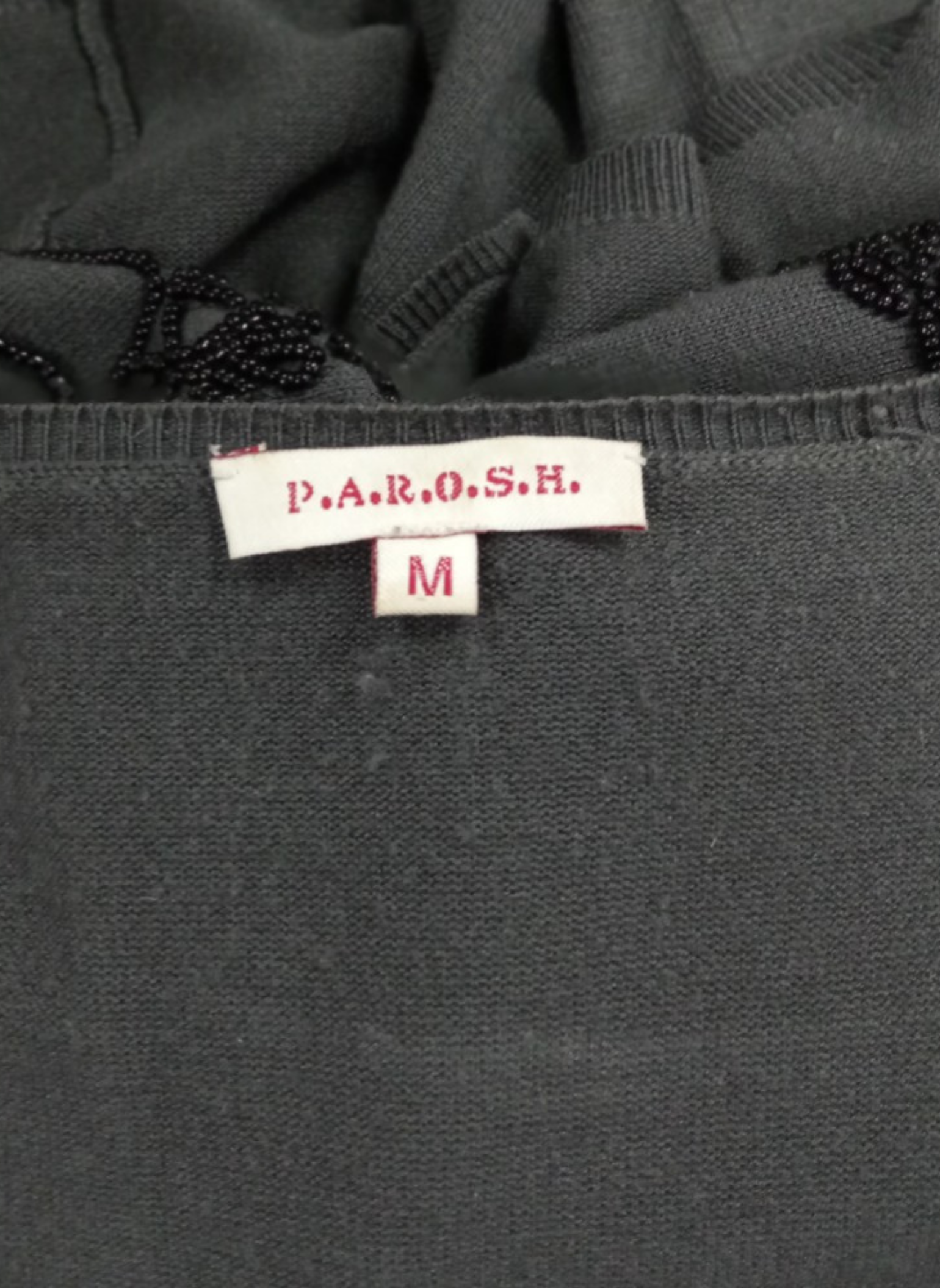 Chaqueta corta de la marca P.A.R.O.S.H de color gris. Grisseda, escote redondo y detalles de lentejuelas negras alrededor del pecho. Contiene un cierre con botones. Esta chaqueta no contiene ninguna señal de uso. Esta chaqueta es una talla M (38 - 40). Esta chaqueta está elaborada con un 75% de seda, 15% de cashmere y un 10% elástico.