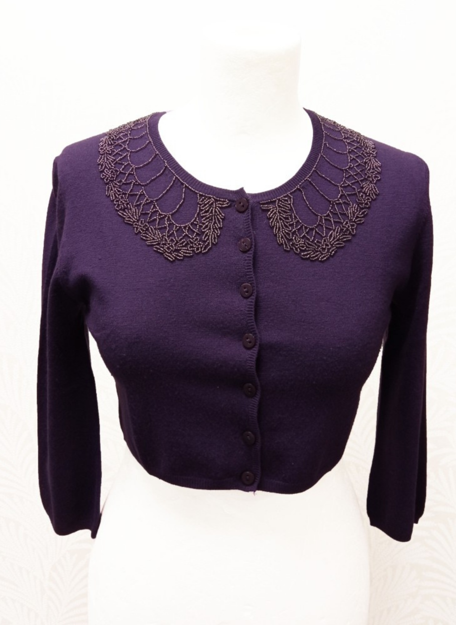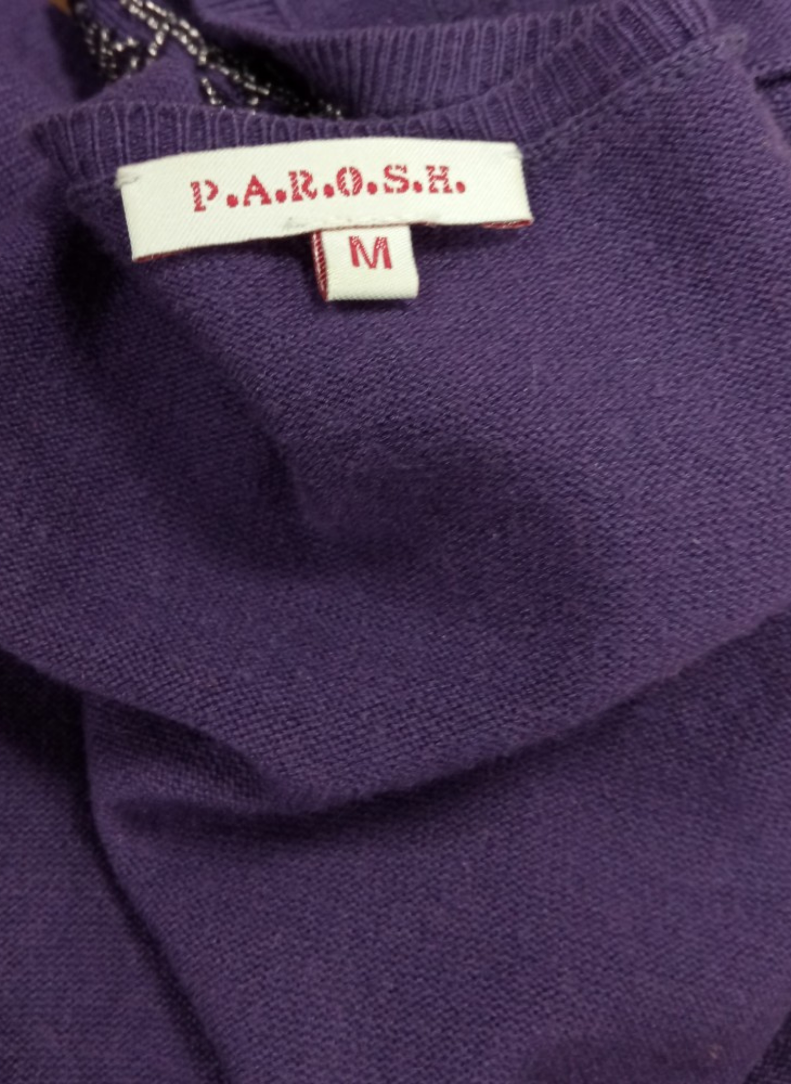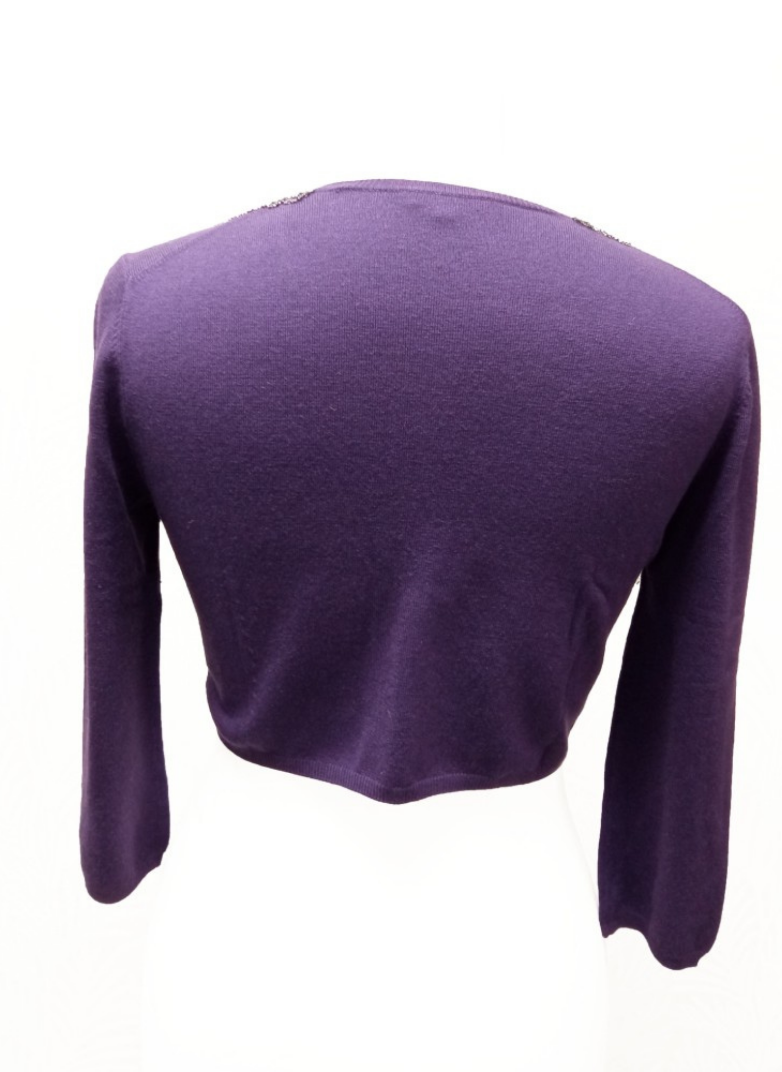 Chaqueta corta de la marca P.A.R.O.S.H y de color morado con canutillos en el cuello haciendo ondas. Se cierra con botones y contiene una manga 3/4. Compuesta por seda y cashemire. Está chaqueta no contiene ninguna señal de uso. Talla M (40).
