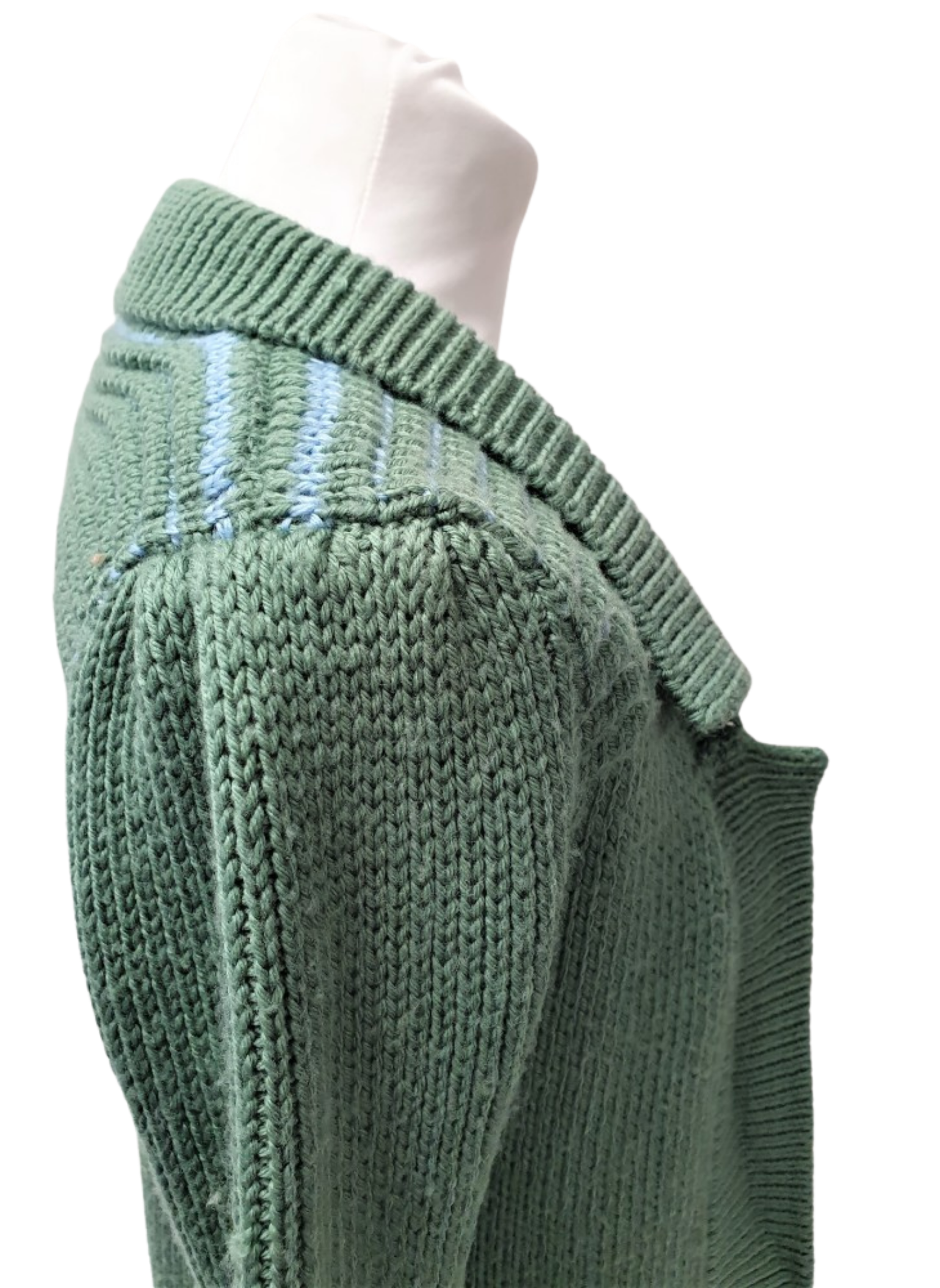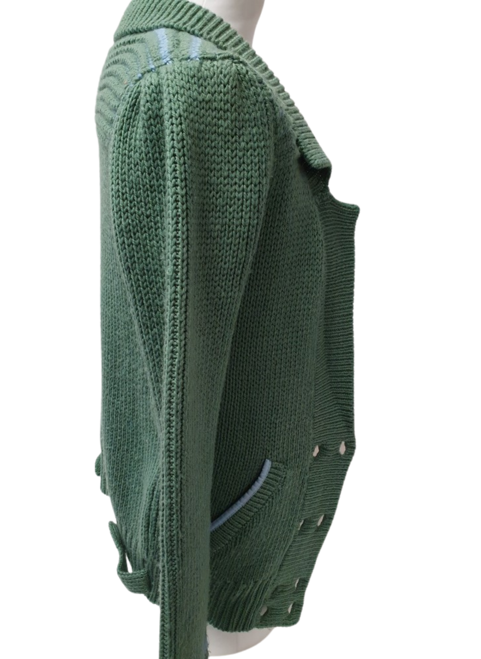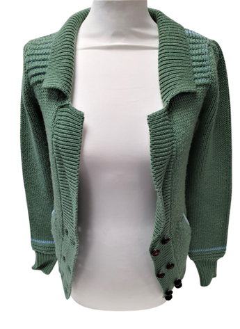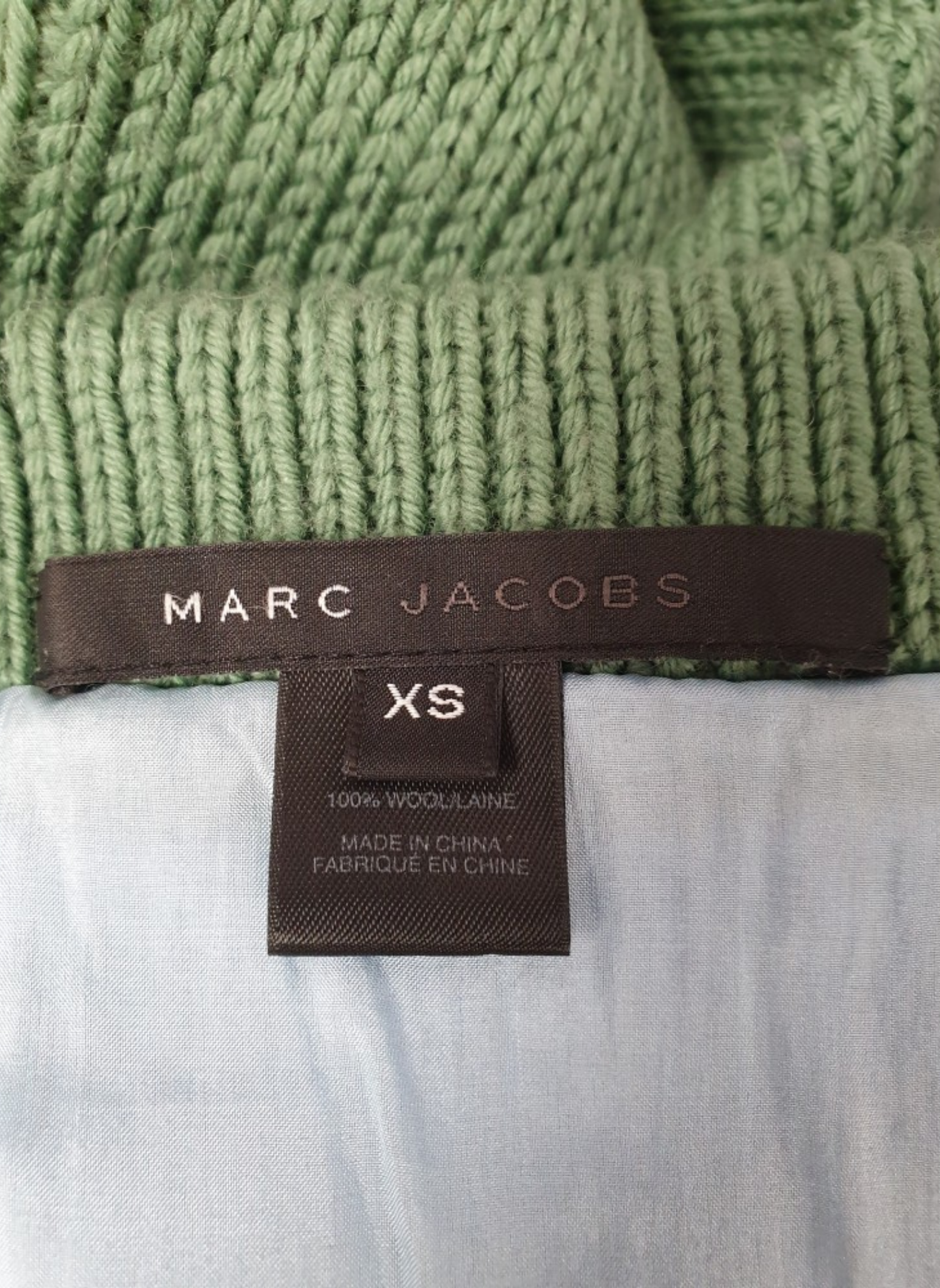 Chaqueta 100% elaborada con lana de la Marc Jacobs y de color verde con detalles color azul. Contiene unos botones trenzados de cuero marrón. Es una talla XS (36). Está chaqueta no presenta ningún tipo de señal de uso.