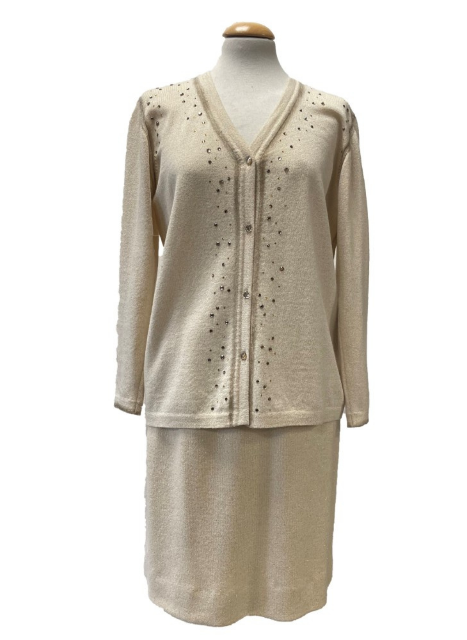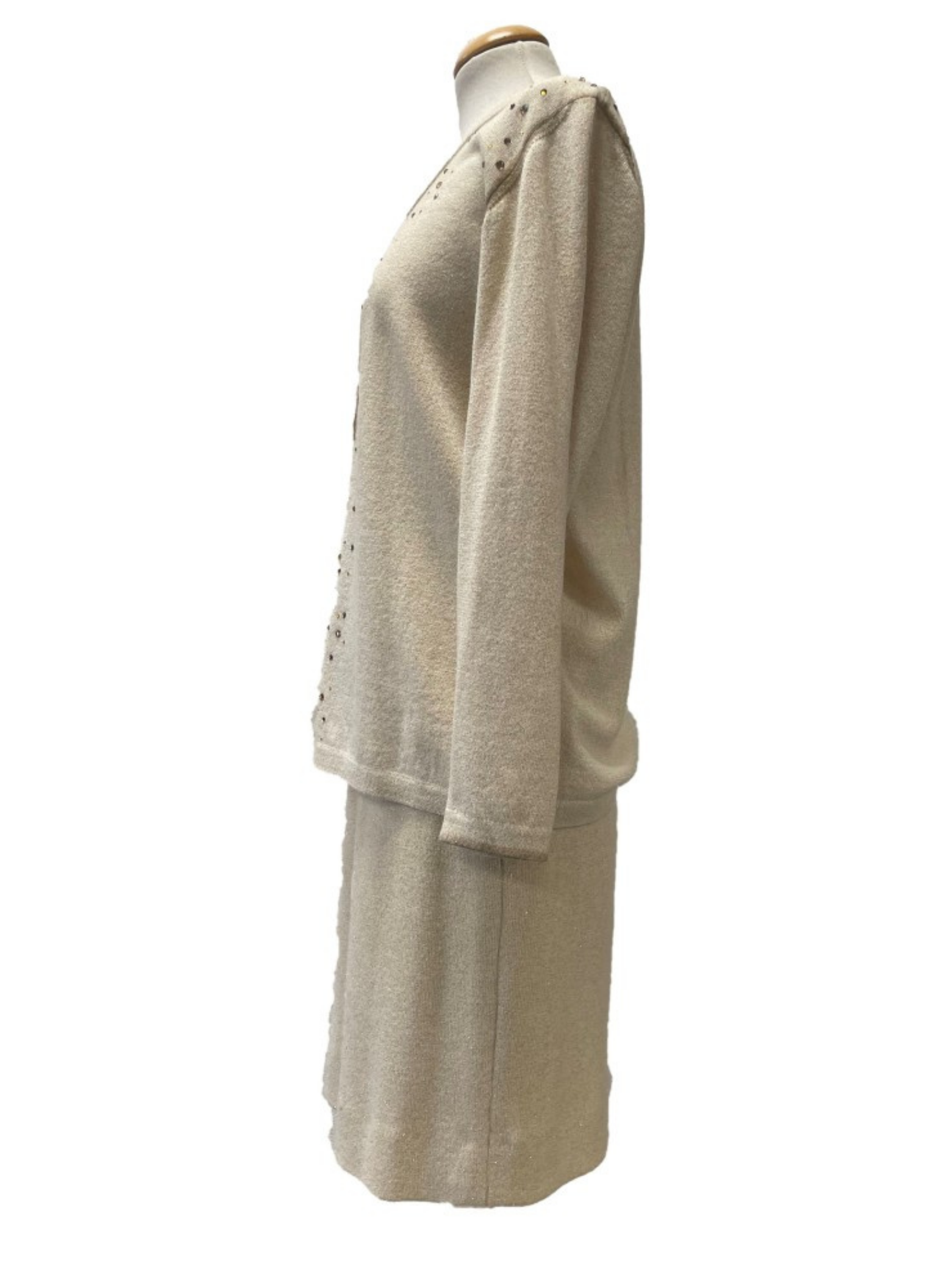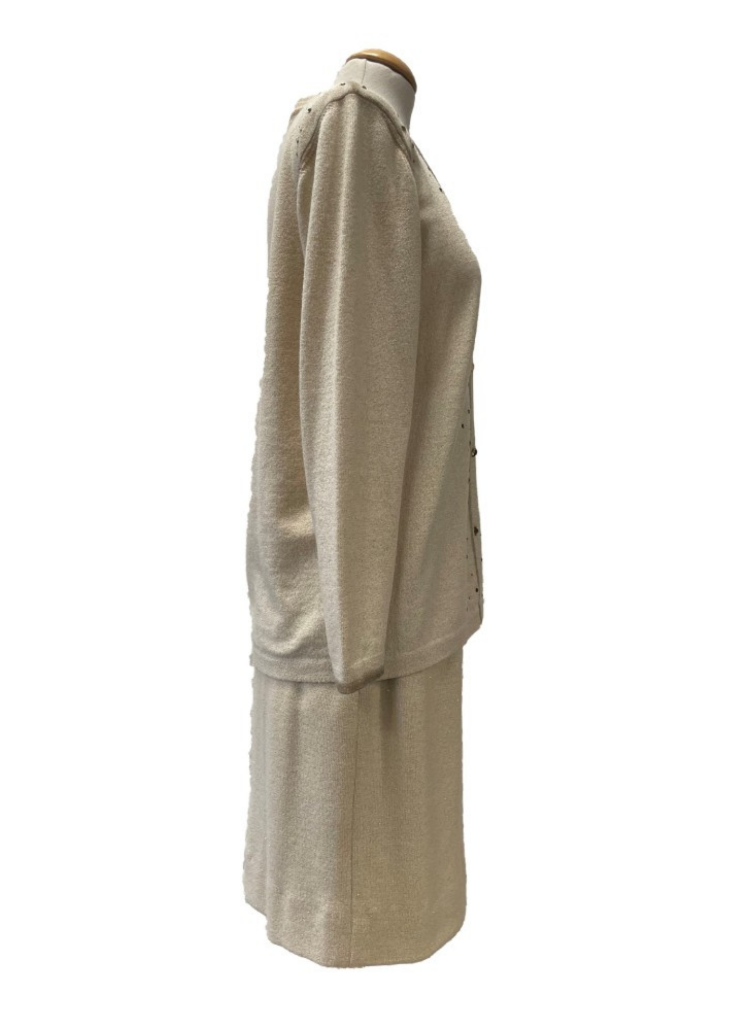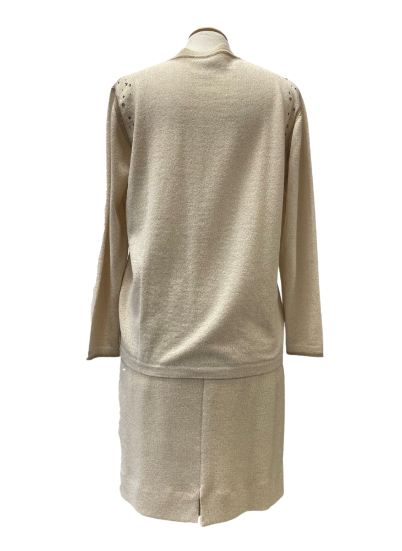 Conjunto de chaqueta y falda de la marca Vera da Pozo color beige y dorado. Chaqueta con piedras y botones dorados. Talla L (42). Este conjunto no presenta ningún tipo de señal de uso.