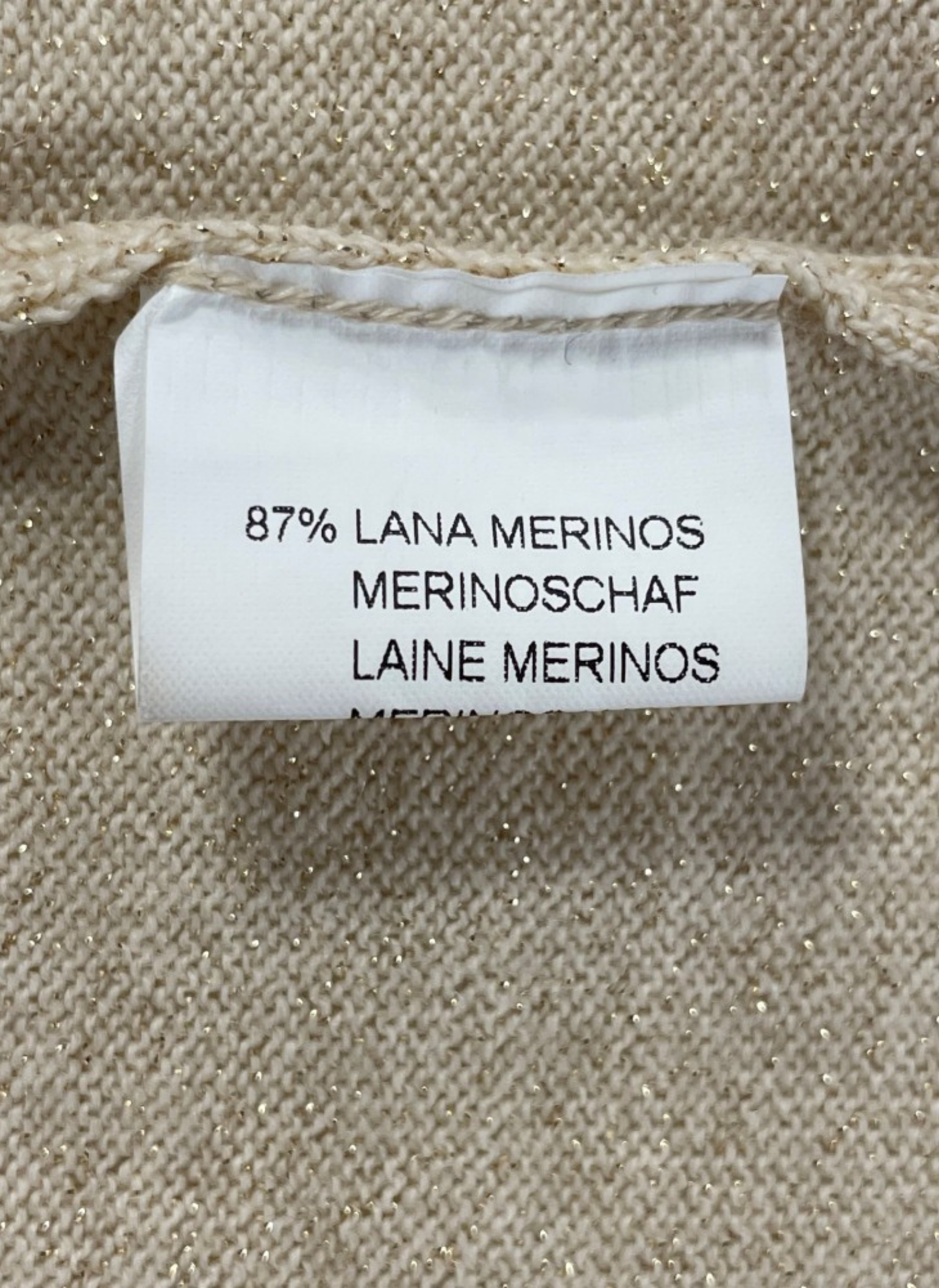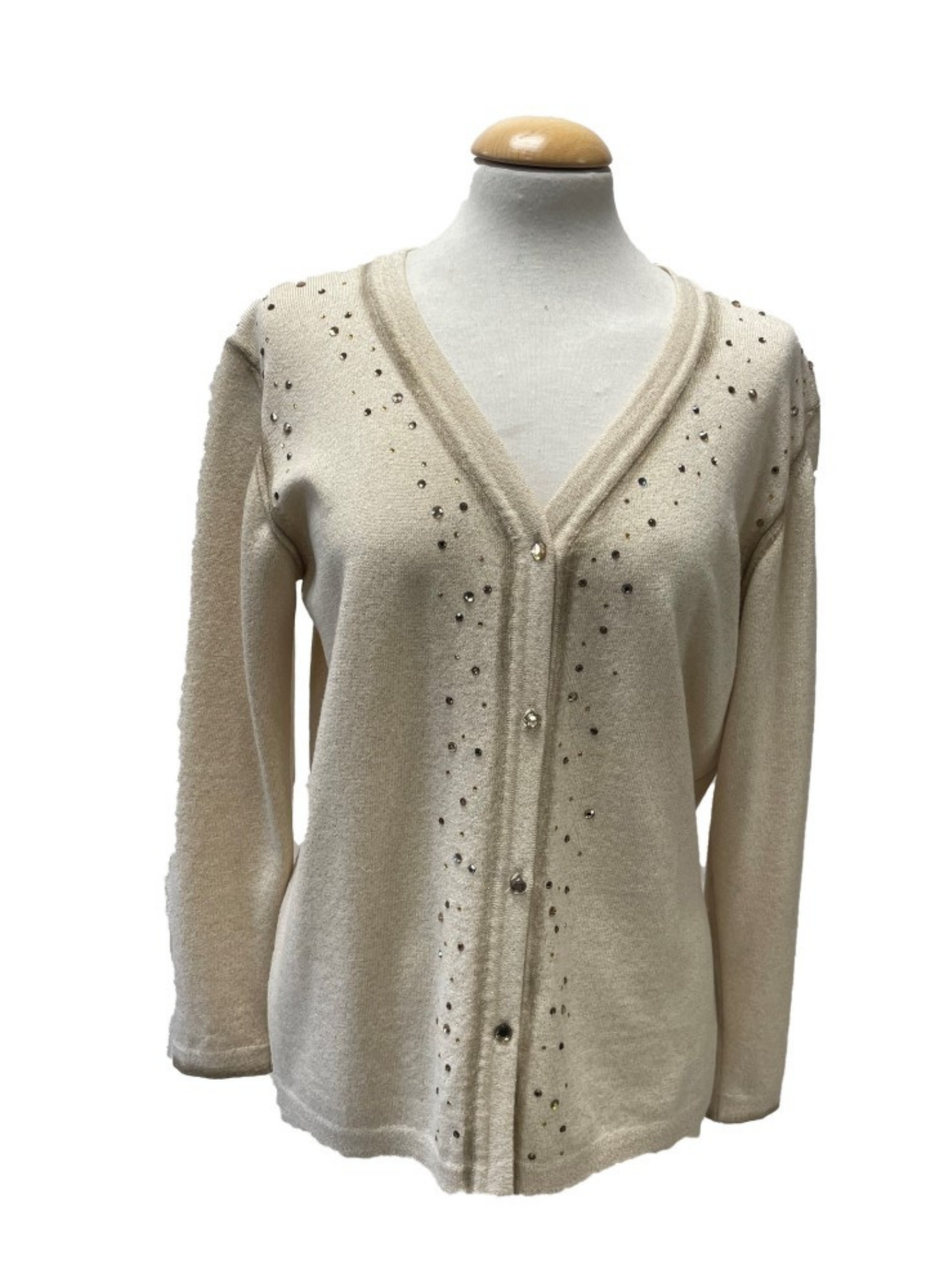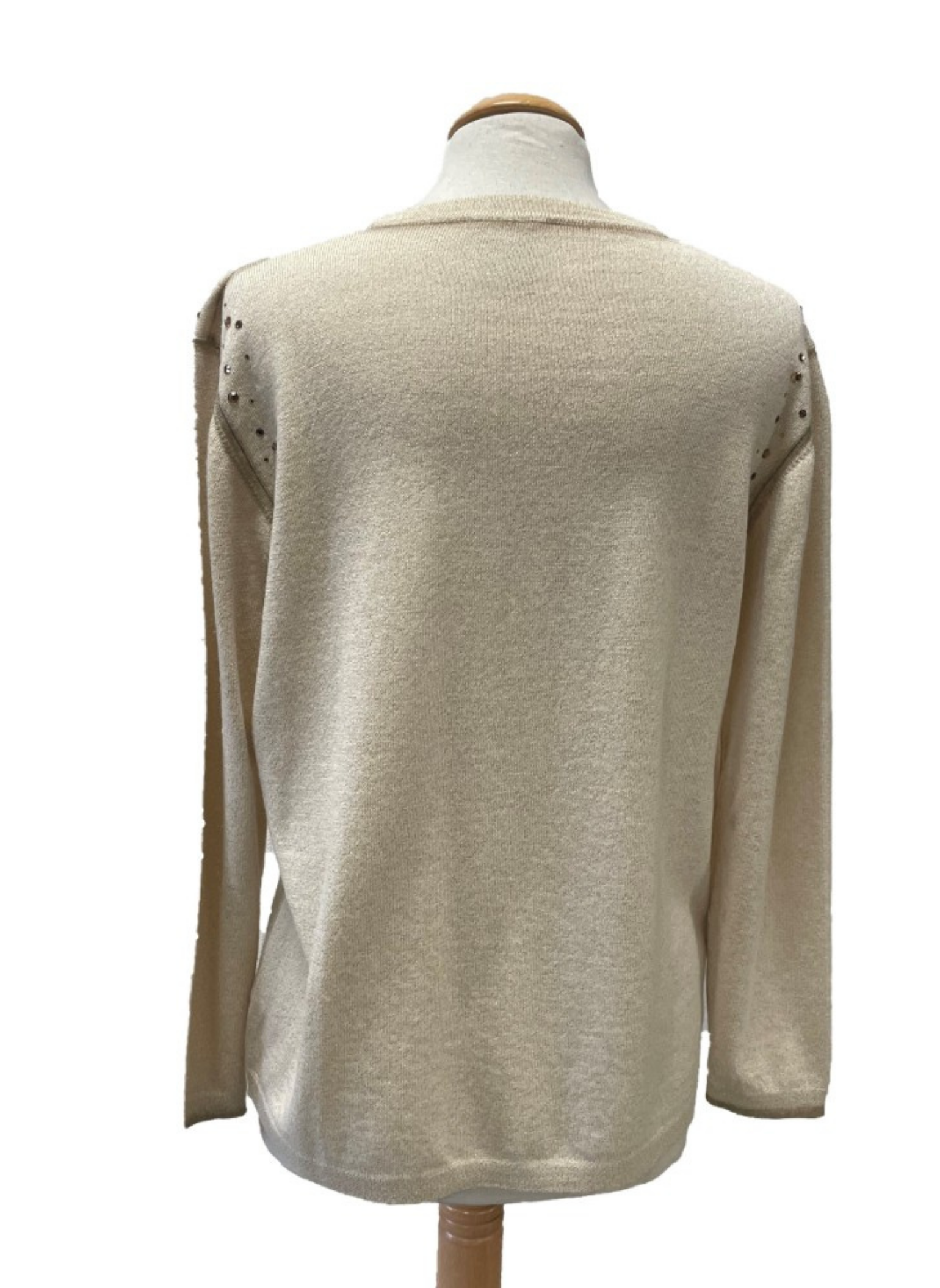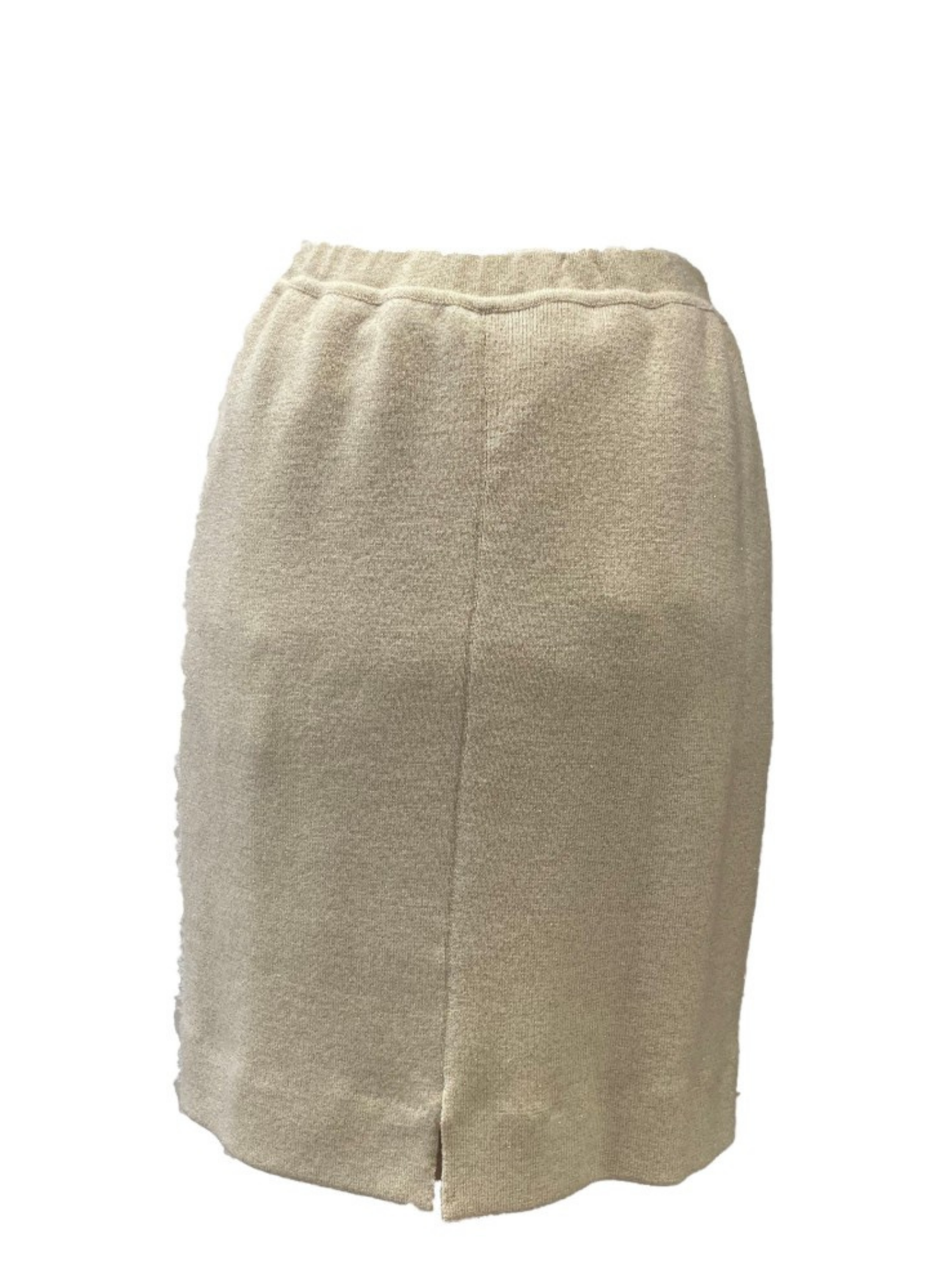Conjunto de chaqueta y falda de la marca Vera da Pozo color beige y dorado. Chaqueta con piedras y botones dorados. Talla L (42). Este conjunto no presenta ningún tipo de señal de uso.