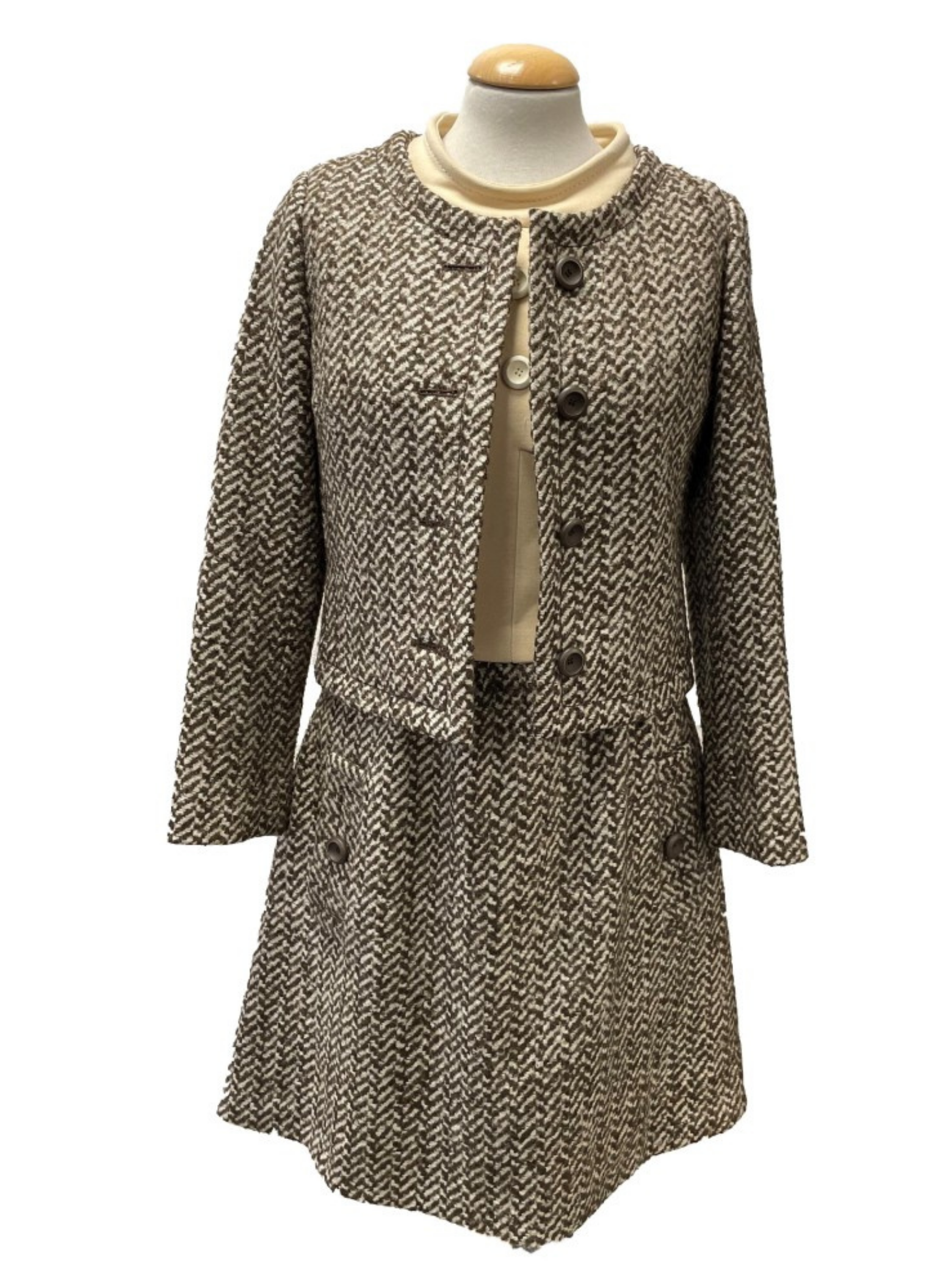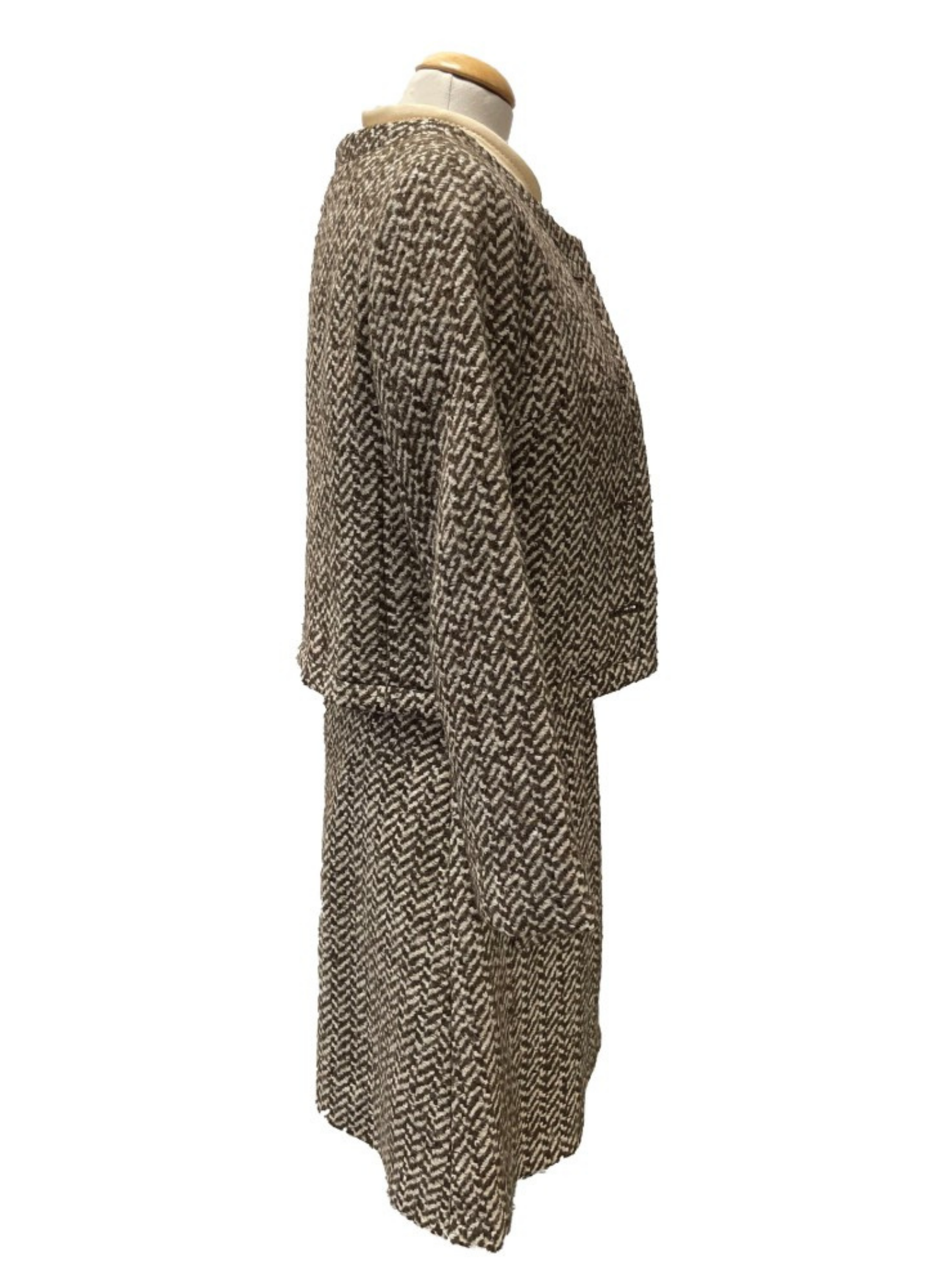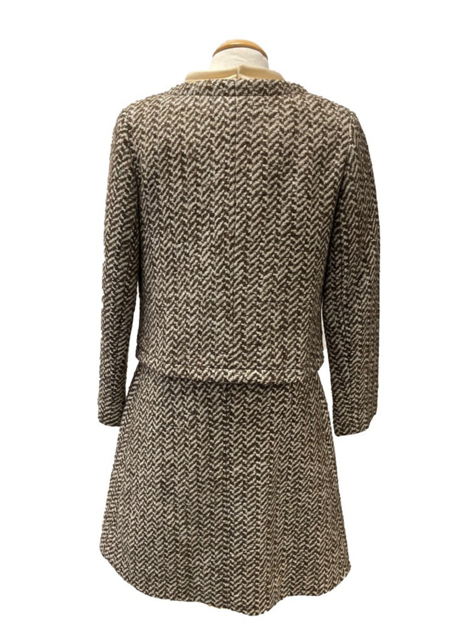 Conjunto de vestido y chaqueta de la marca Andersen vintage.Con tonos beige y marrones. Este conjunto es de la talla S. No presenta ningún tipo de señal de uso. Está elaborado este conjunto n de lana, seda y algodón.