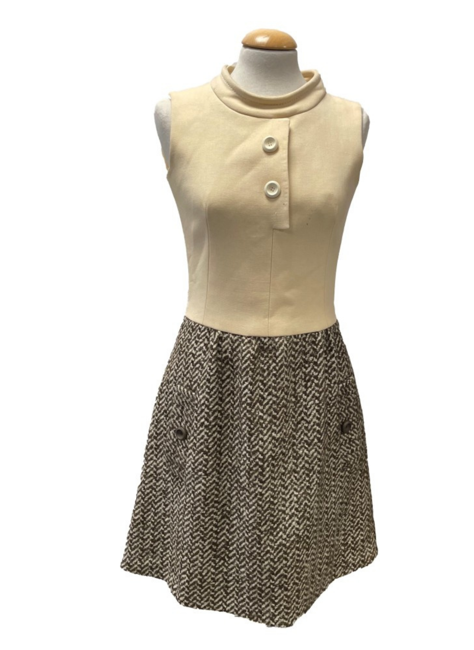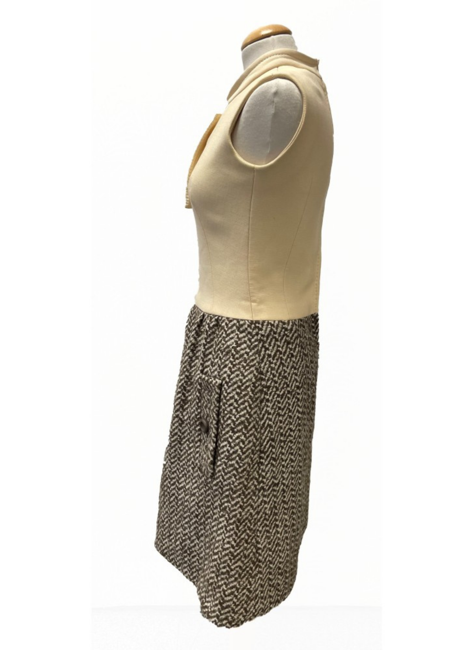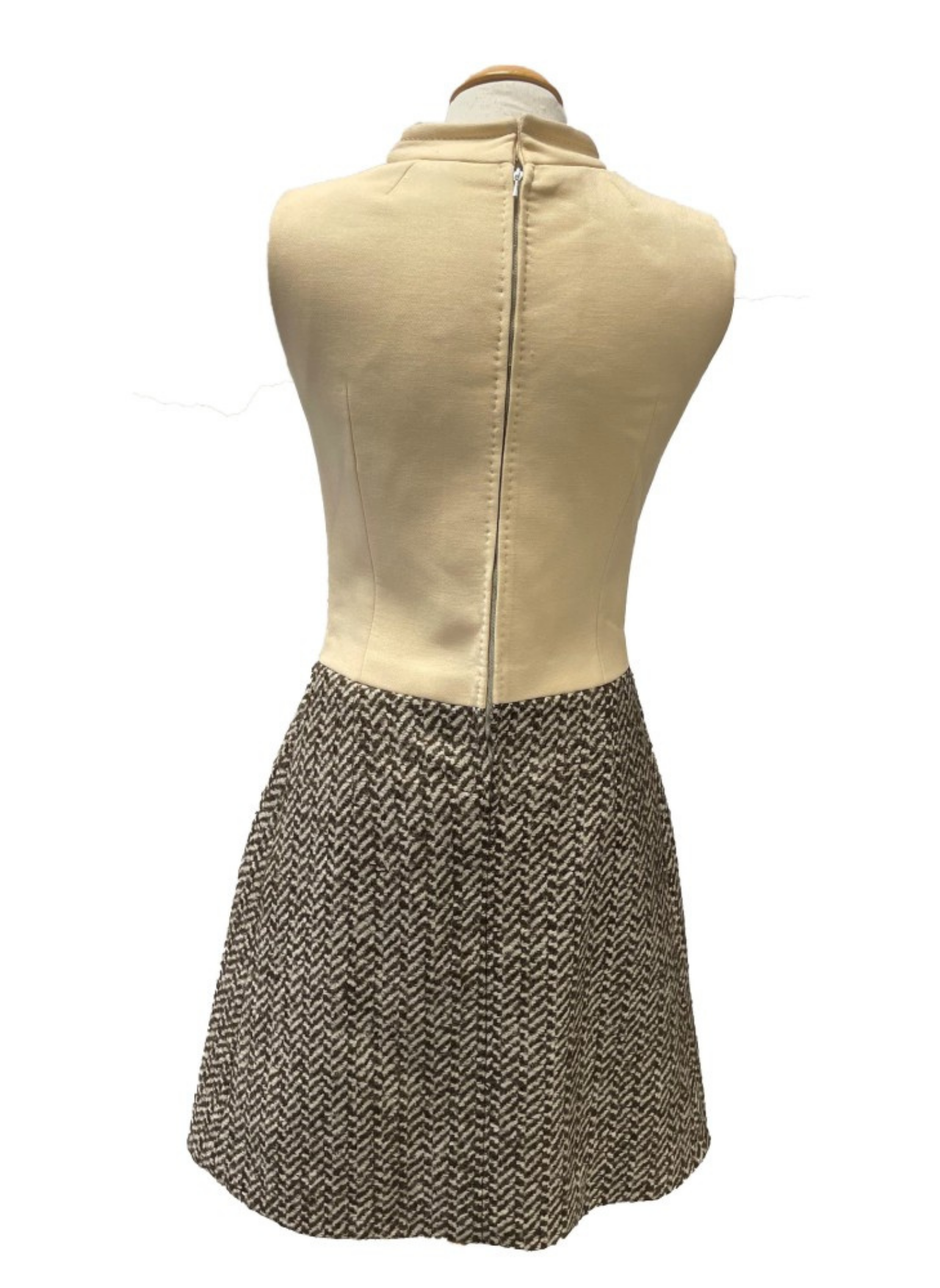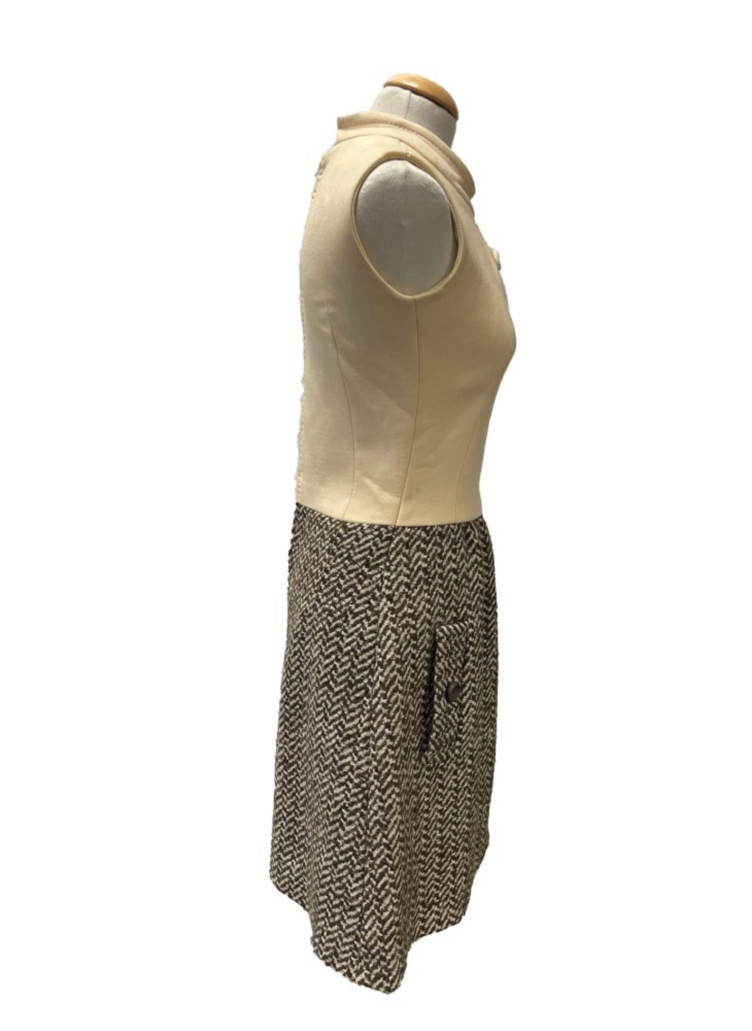 Conjunto de vestido y chaqueta de la marca Andersen vintage.Con tonos beige y marrones. Este conjunto es de la talla S. No presenta ningún tipo de señal de uso. Está elaborado este conjunto n de lana, seda y algodón.