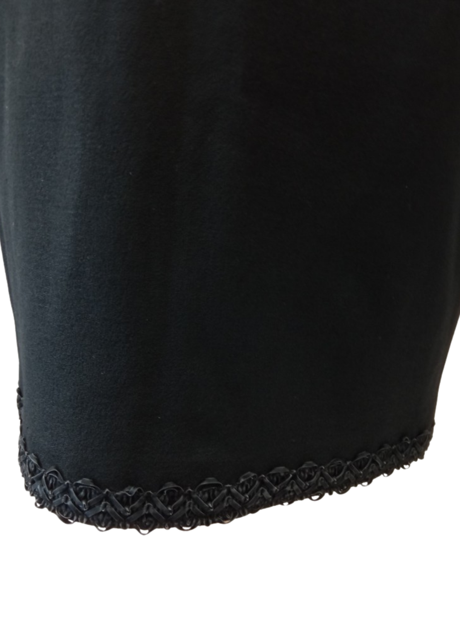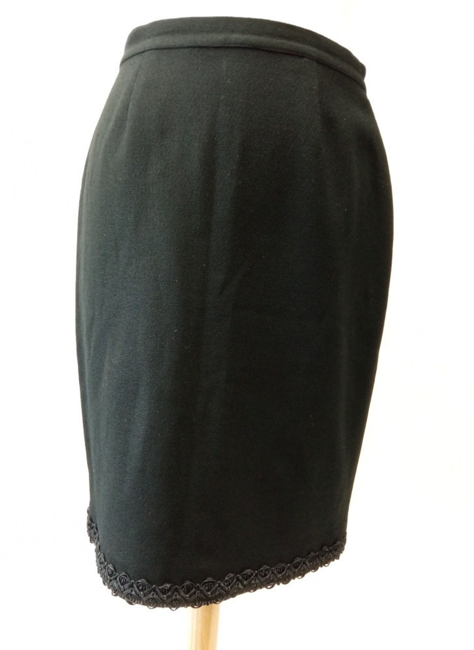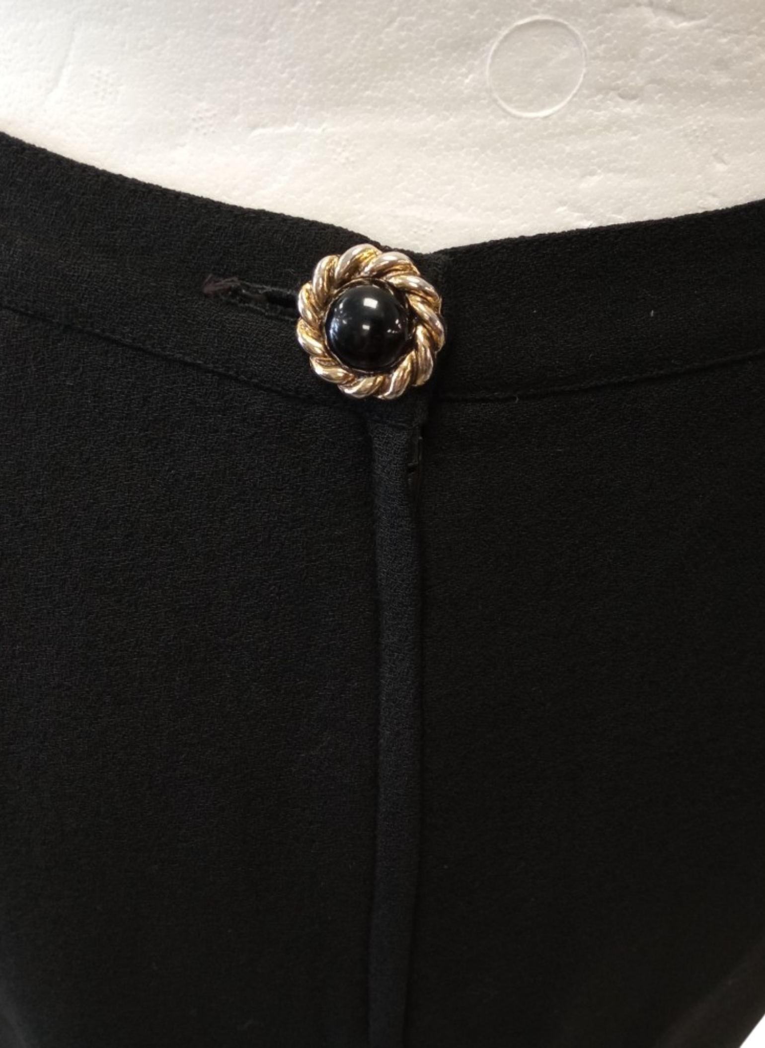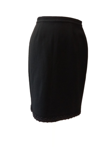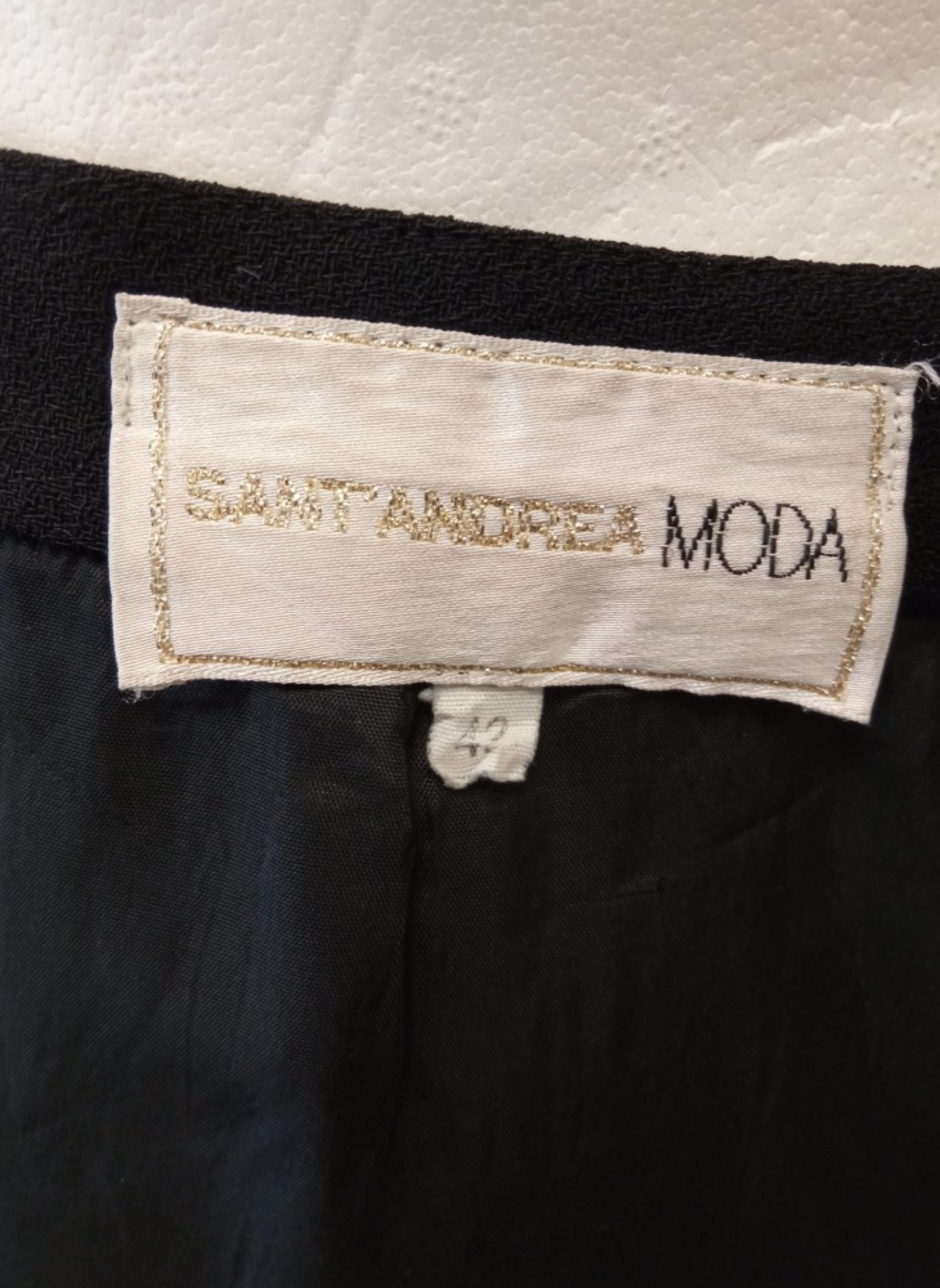 Falda de color negra de la marca Sant Andrea con detalle de cuero en la parte inferior de la falda trenzada. En la parte de detrás tiene un botón dorado con una piedra negra y cremallera, con una apertura en la parte de detrás.Esta falda es una talla 42. Esta falda no presenta ninguna señal de uso.