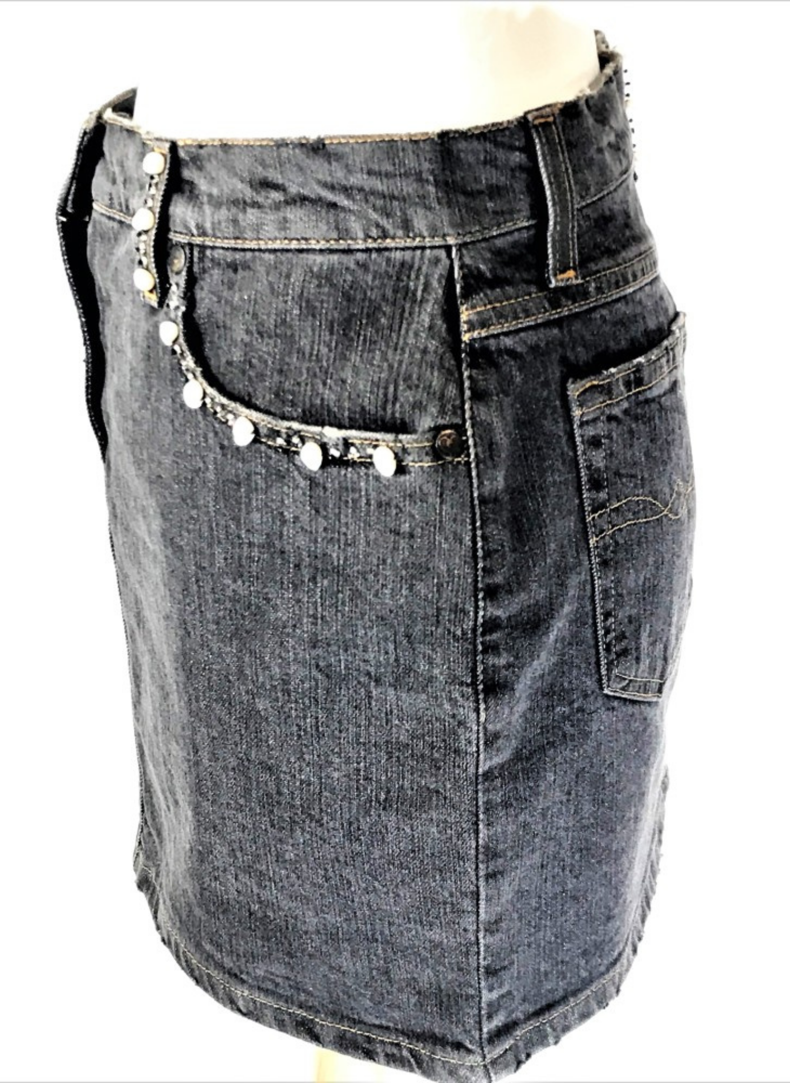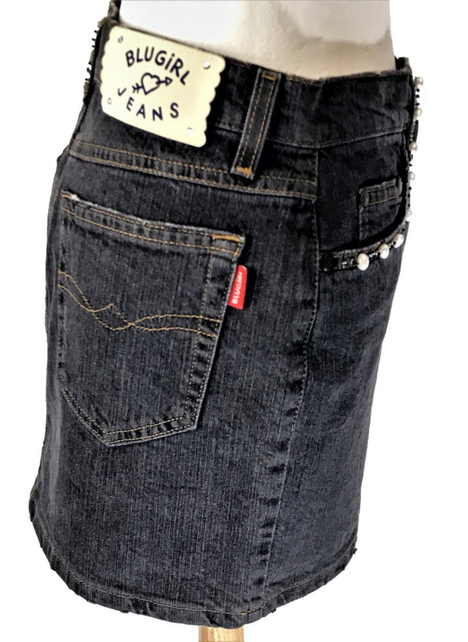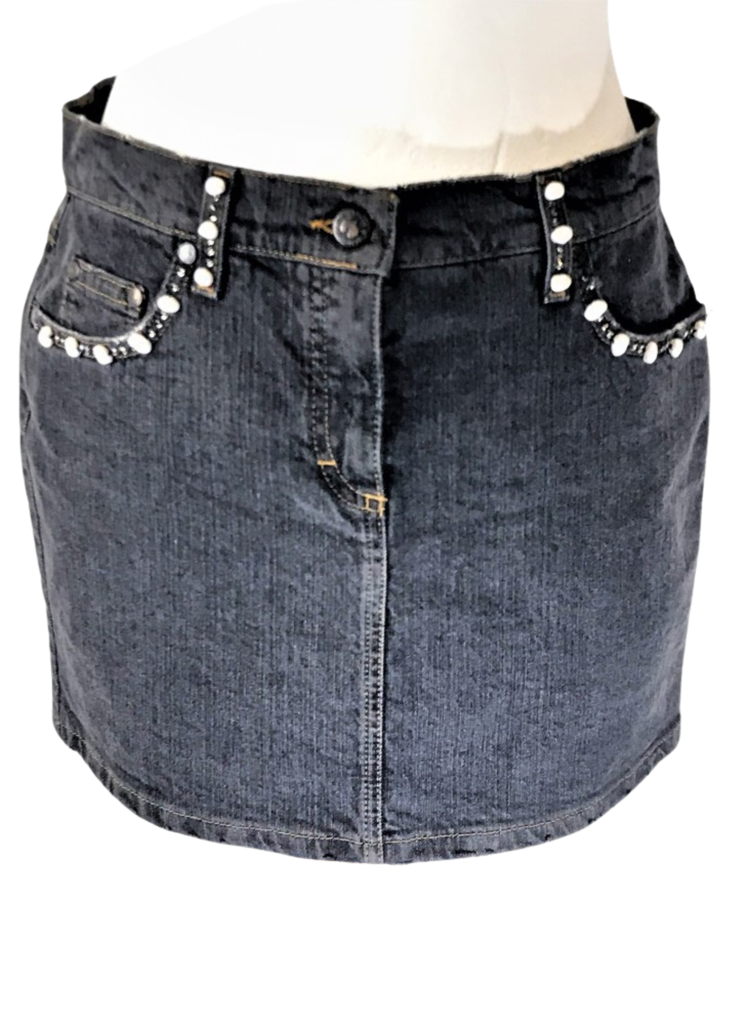 Falda de tela vaquera de la marca Bluemarine en color gris oscuro, con perlas y azabache cosido como adorno. Esta falda es de la talla 42.