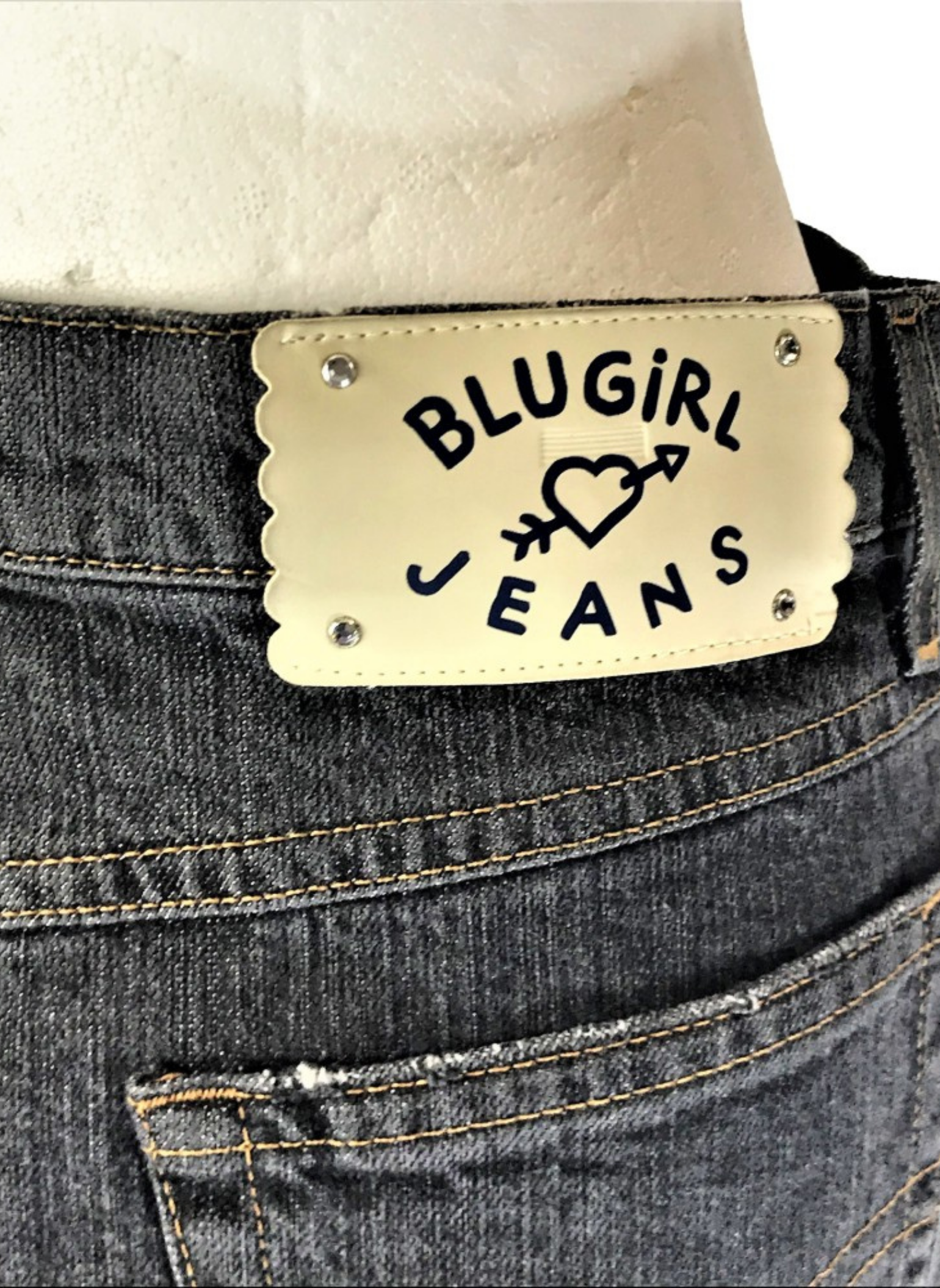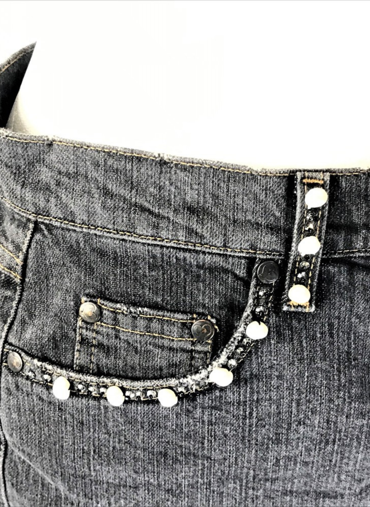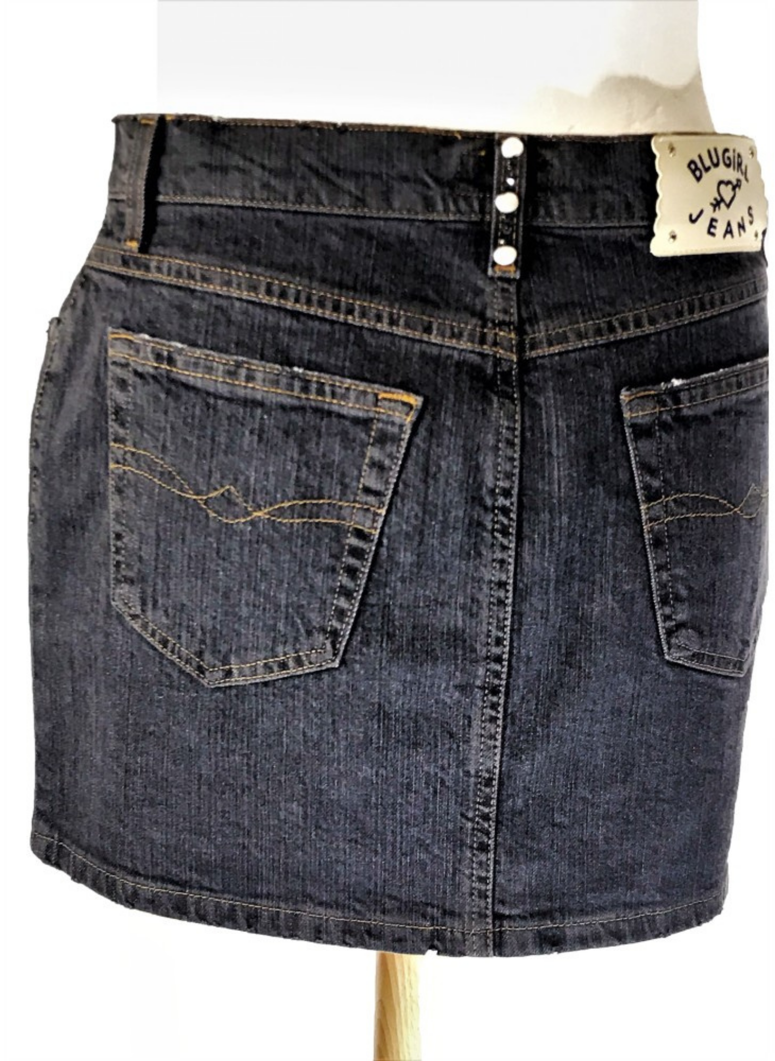 Falda de tela vaquera de la marca Bluemarine en color gris oscuro, con perlas y azabache cosido como adorno. Esta falda es de la talla 42.