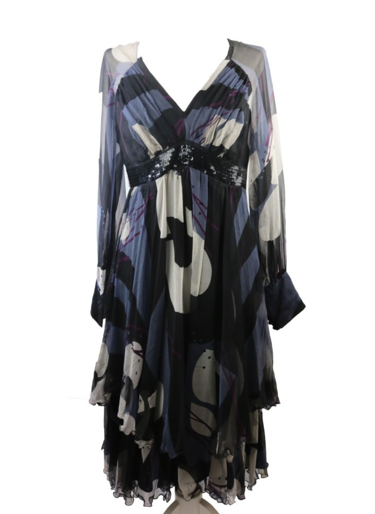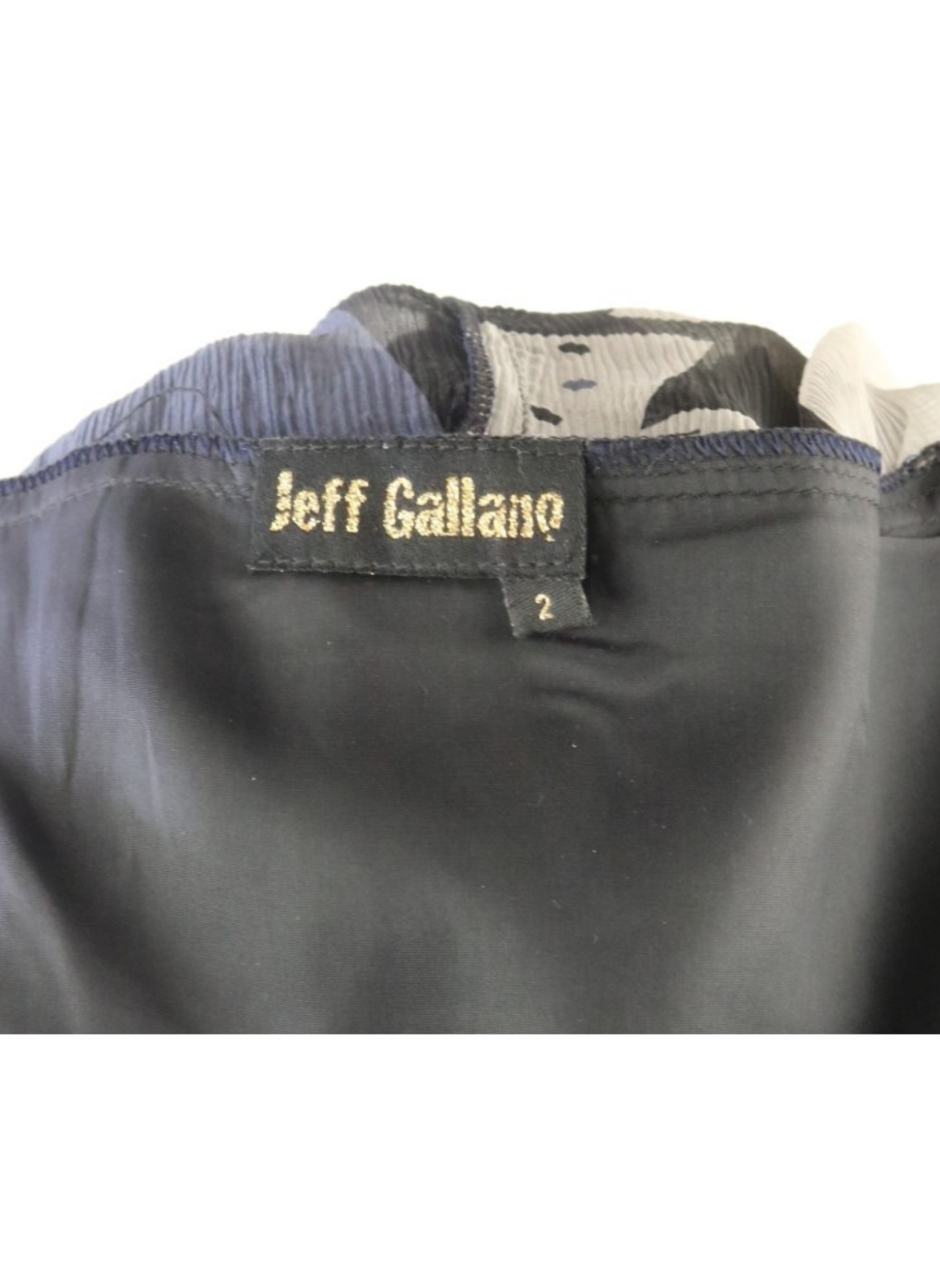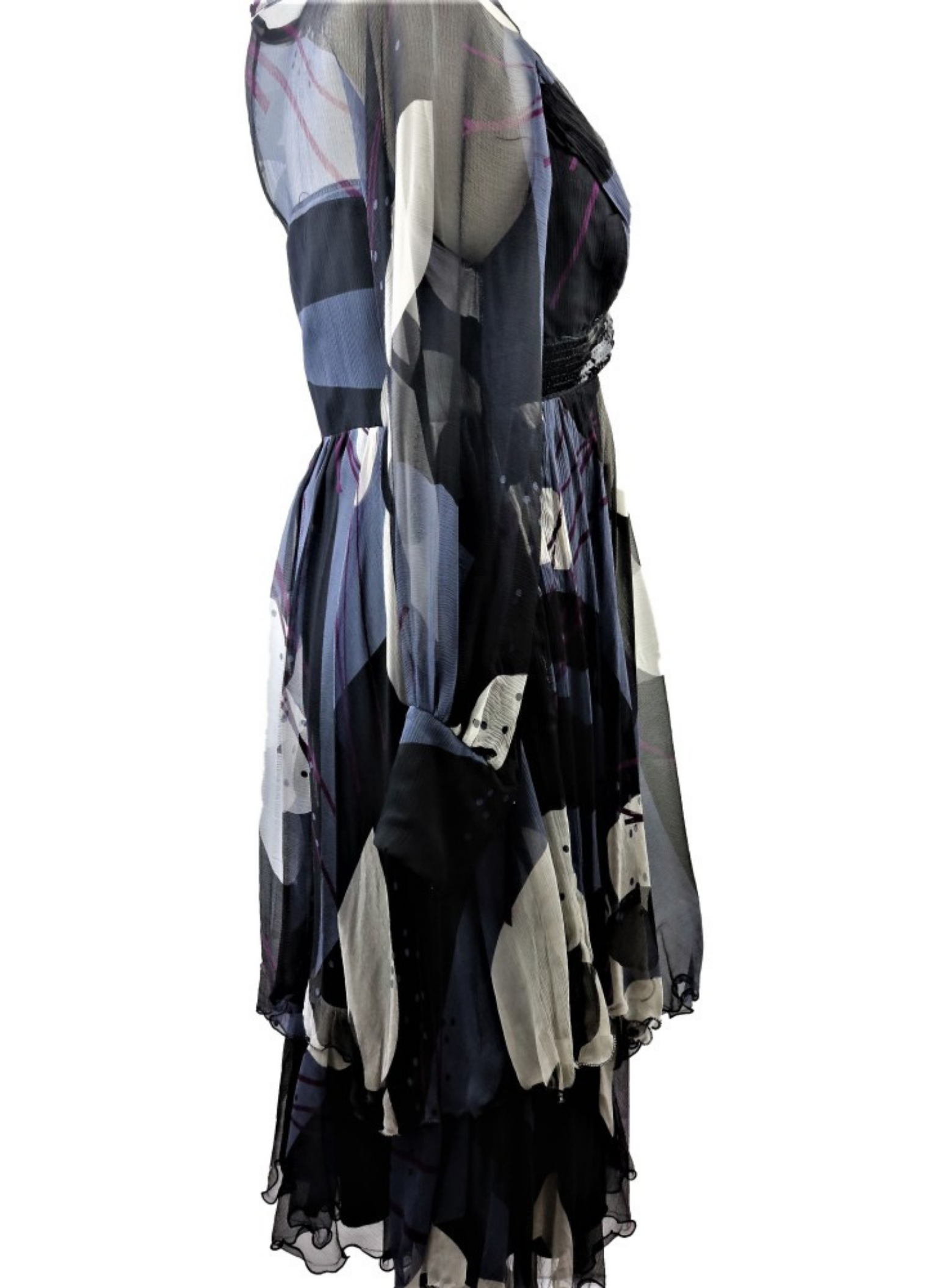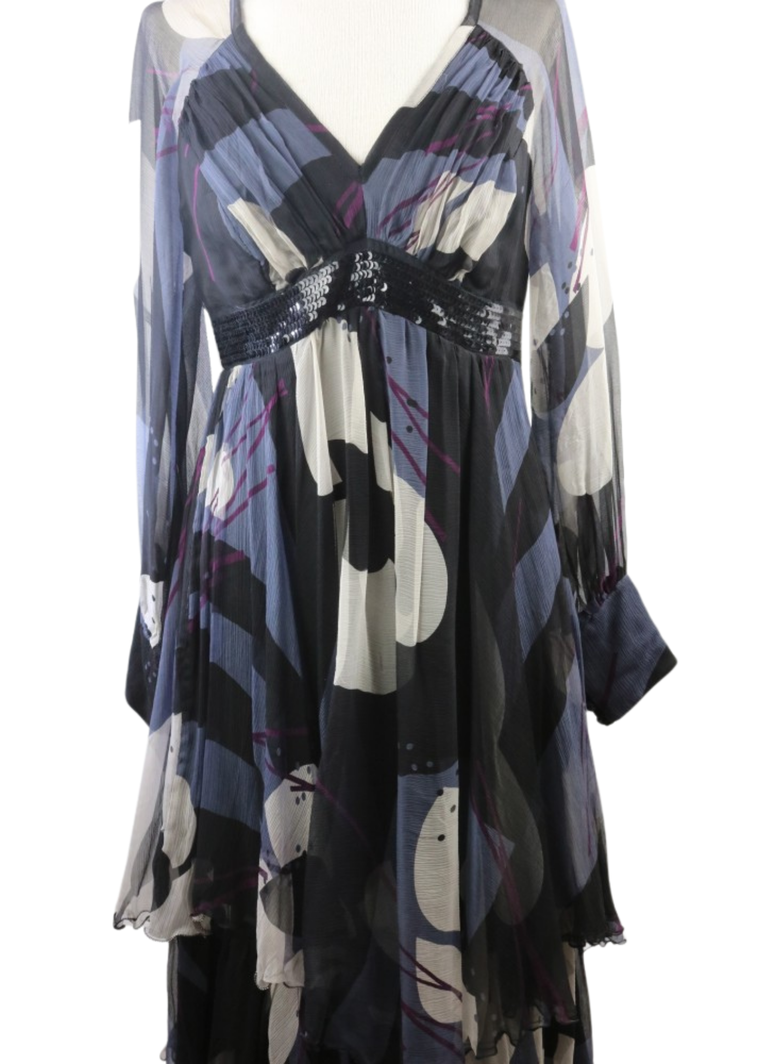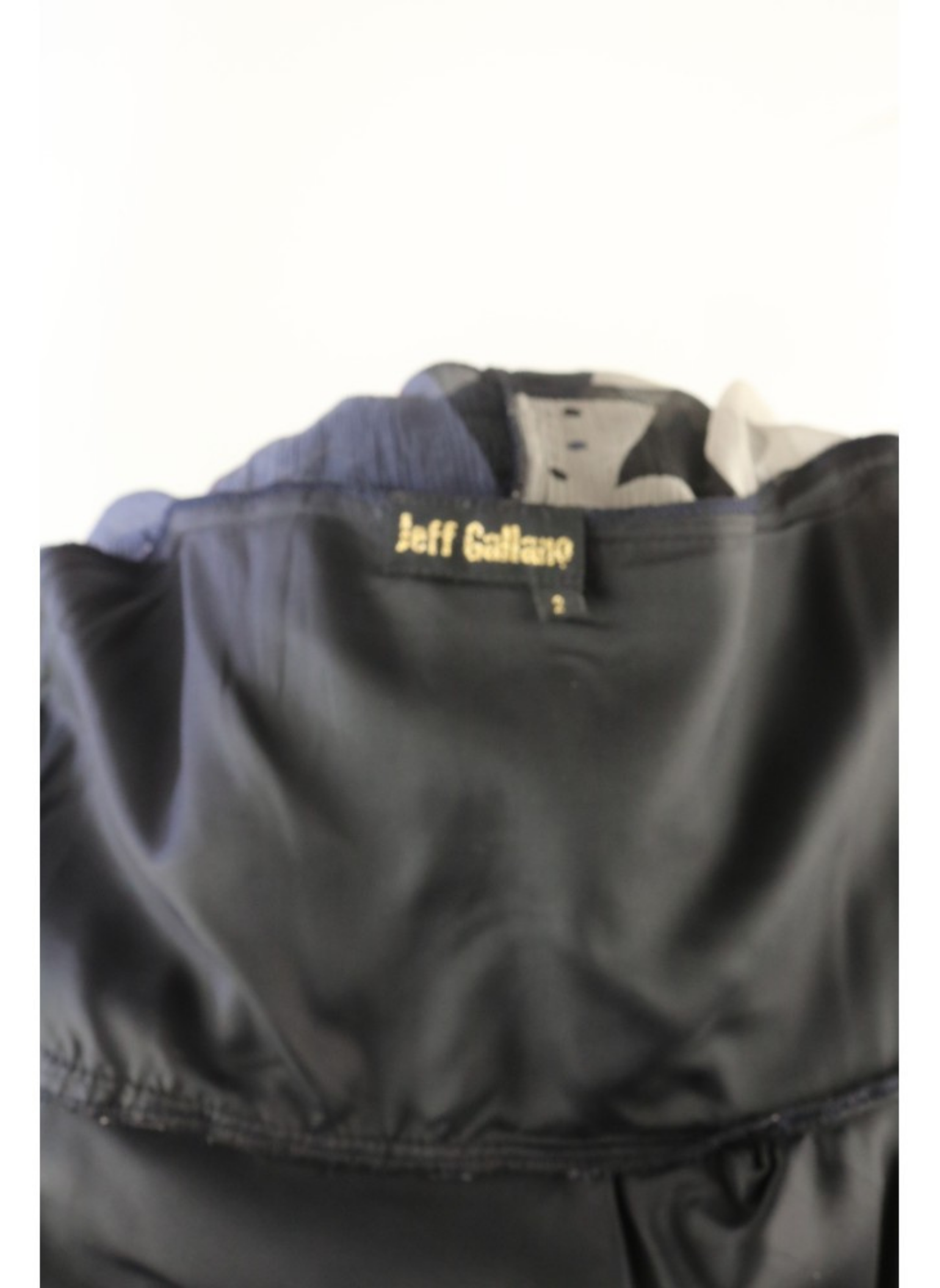 Vestido de la marca Jeff Galliano en gasa de color azul, gris claro y negro con cinturón de pailletes negros con mangas largas. Se abre con una cremallera y contiene un forro en su interior. Es una talla 32.