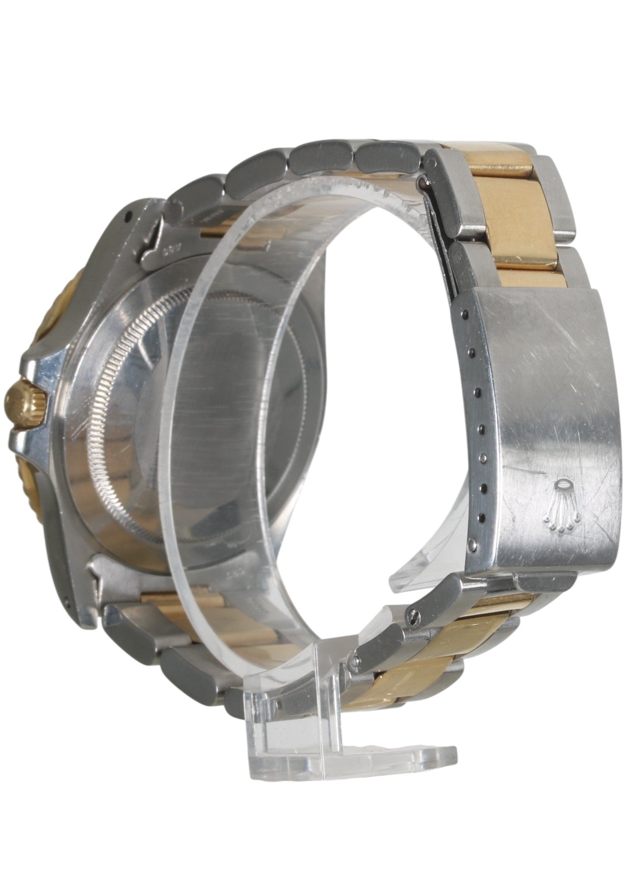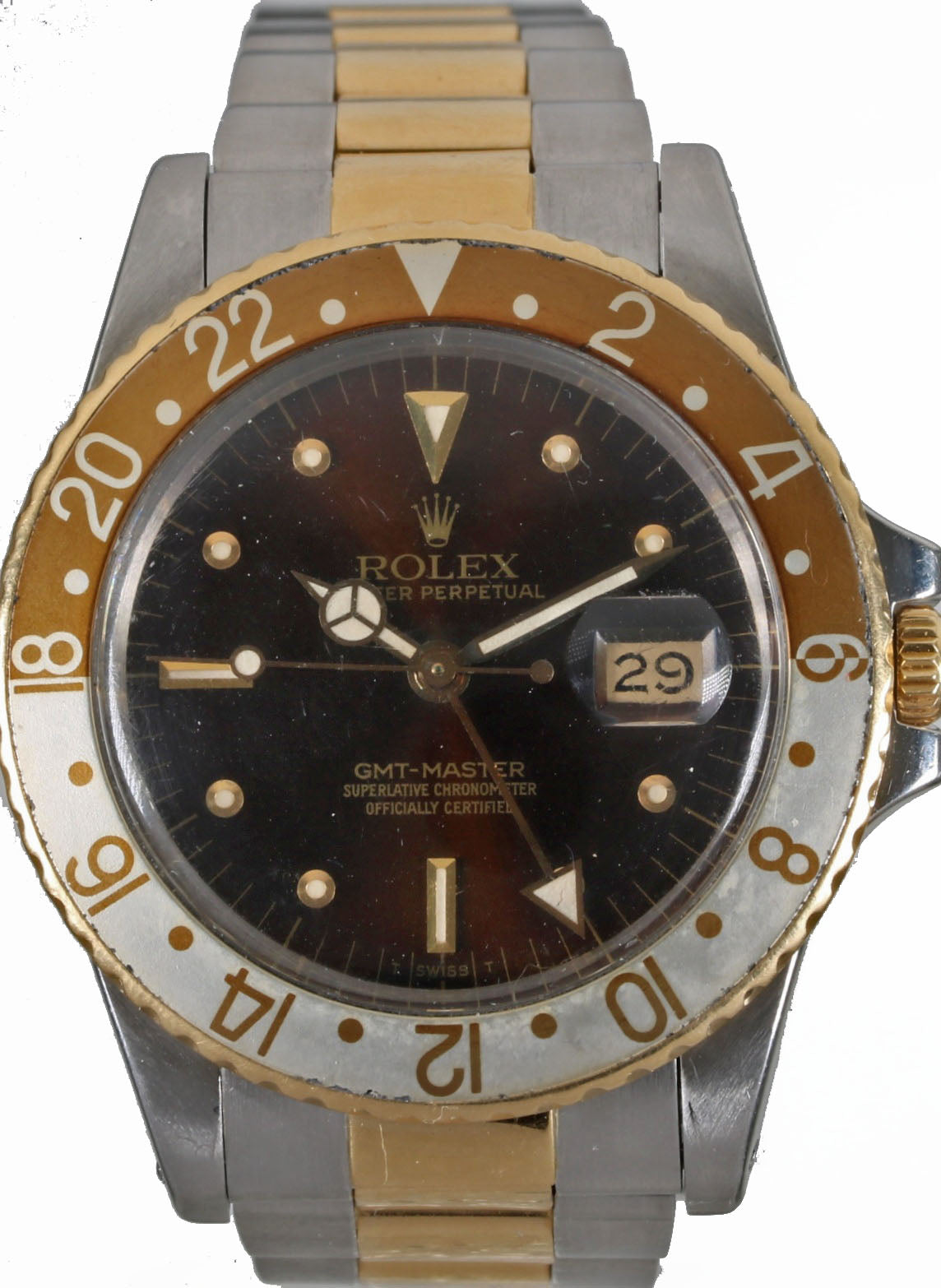 Rolex ref. 16753 modelo GMT-Master del año 1983 con caja de 40mm y cristal de plexiglass. Movimiento automático con función de fecha y mano 24 horas para poder ver la hora en otro país. Brazalete original Rolex ref. 78363 en oro y acero con trece eslabones. Esfera marrón con marcadores en oro conocida como “Nipple Dial”. Los GMT en tonos marrón solo se produjeron de 1980 a 1988 y son muy buscados por los coleccionistas se conoce como el Rolex “Clint Eastwood” y en EEUU como el Rolex “Rootbeer”. El reloj está en buen estado