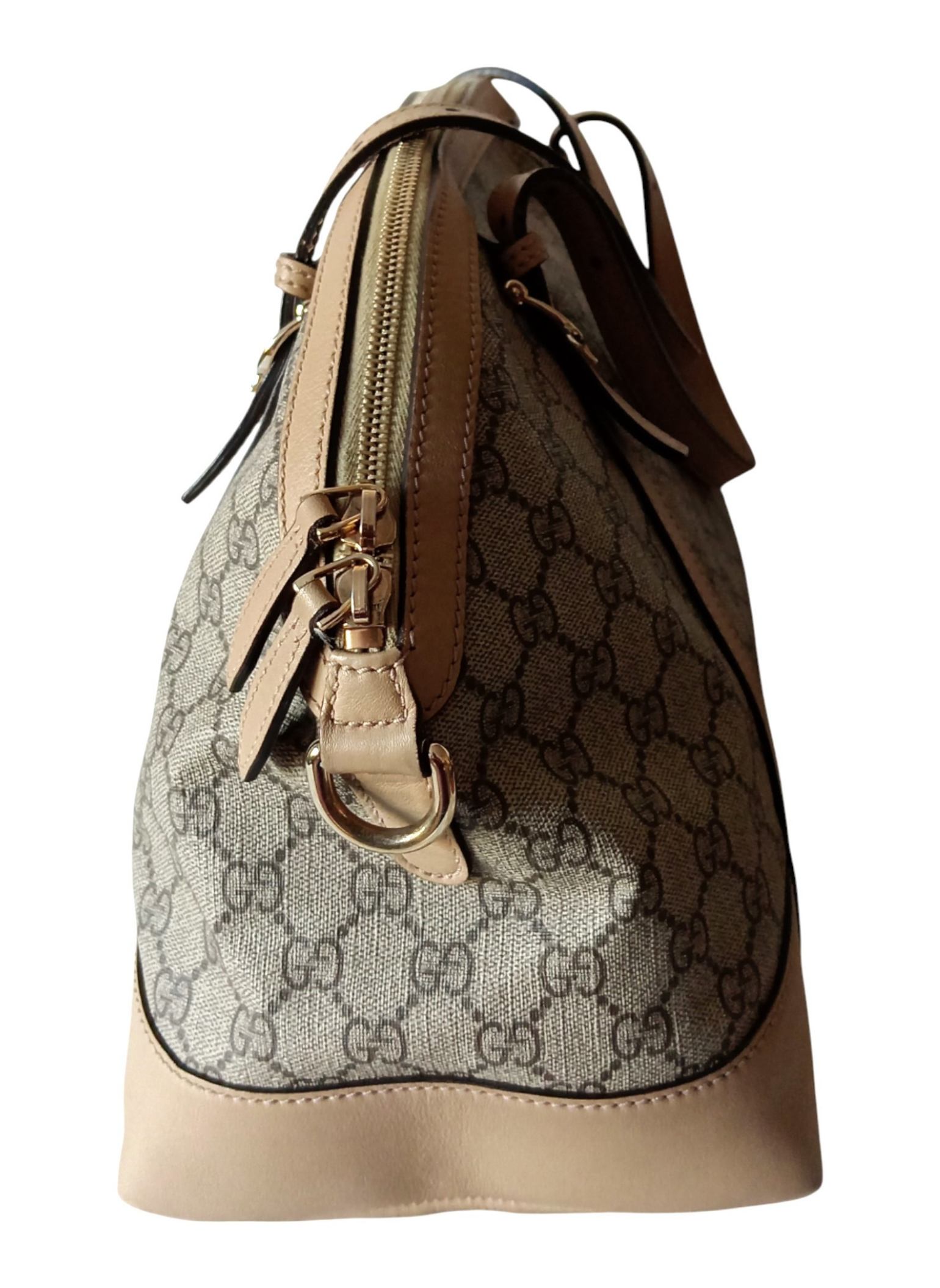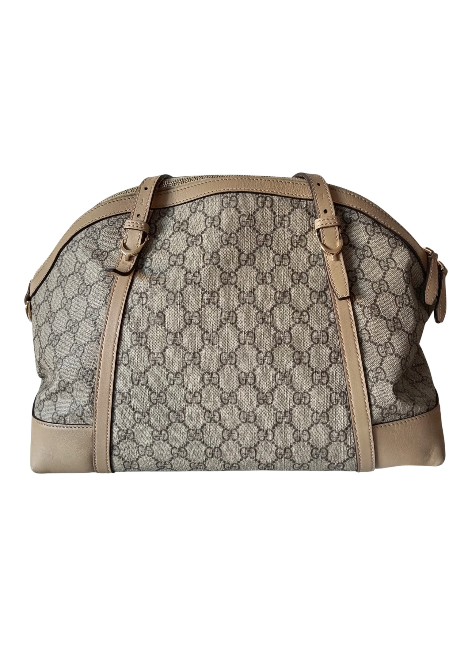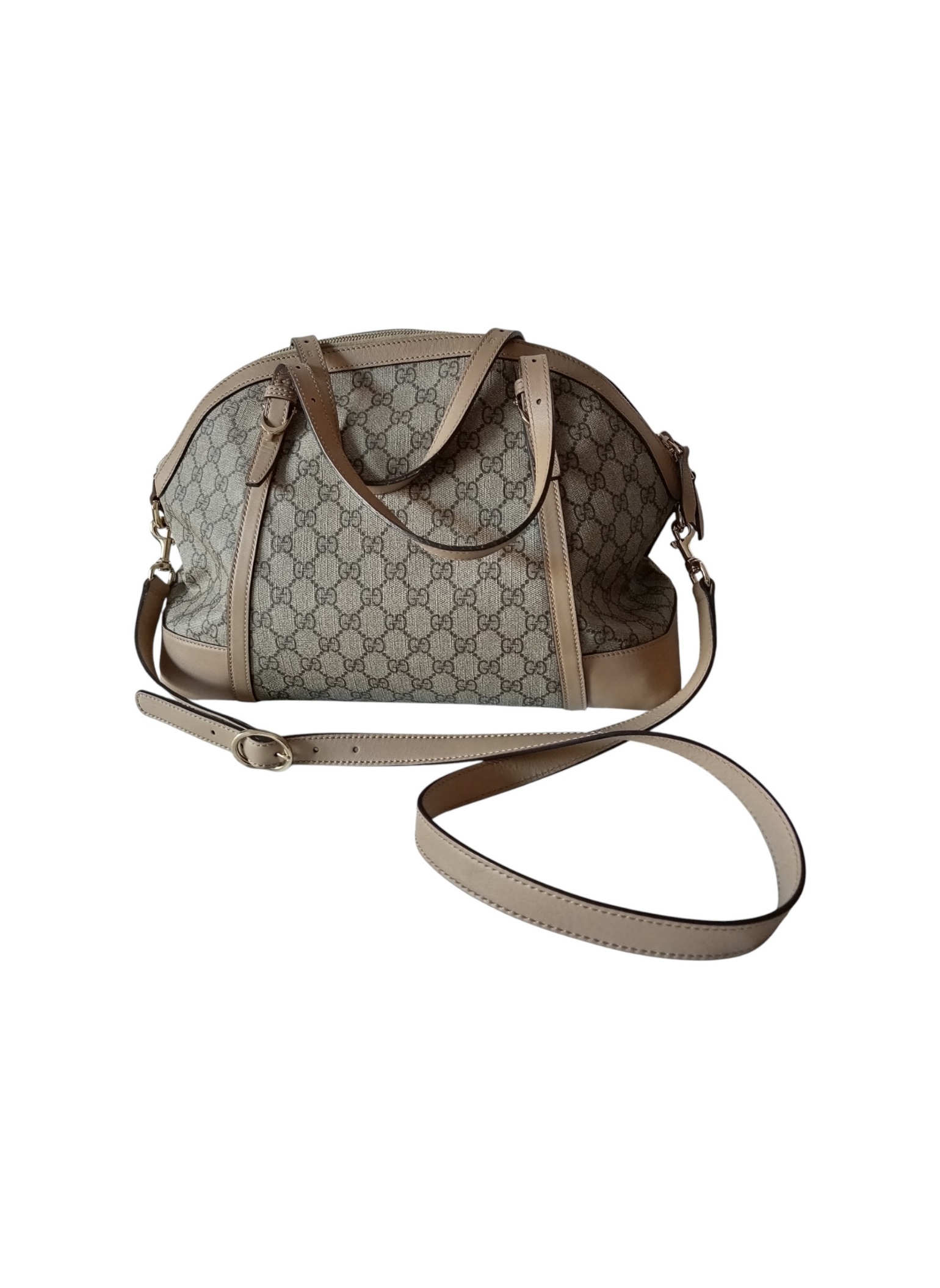 Bolso de Gucci de lona monogram en beige y marron,con terminados en cuero color beige.Modelo estilo Bowling o cupula.Asas superiores para llevar en mano y correa para hombro desmontable y ajustable.Interior de lona beige con dos bolsillos planos y un bolsillo con cremallera.Buen estad.Medidas:37 cms de ancho x 25 cms de alto x 17 cms de profundidad.