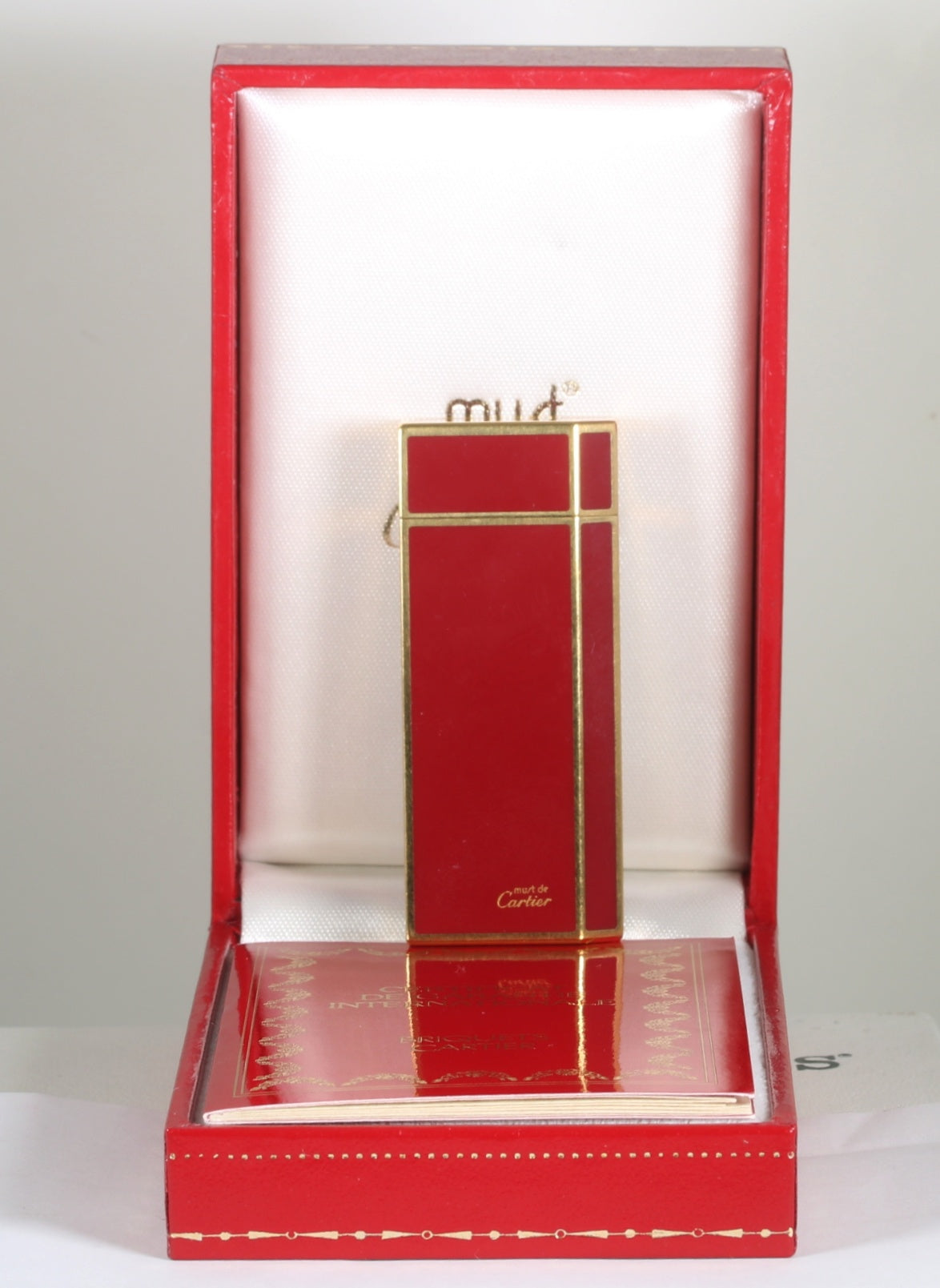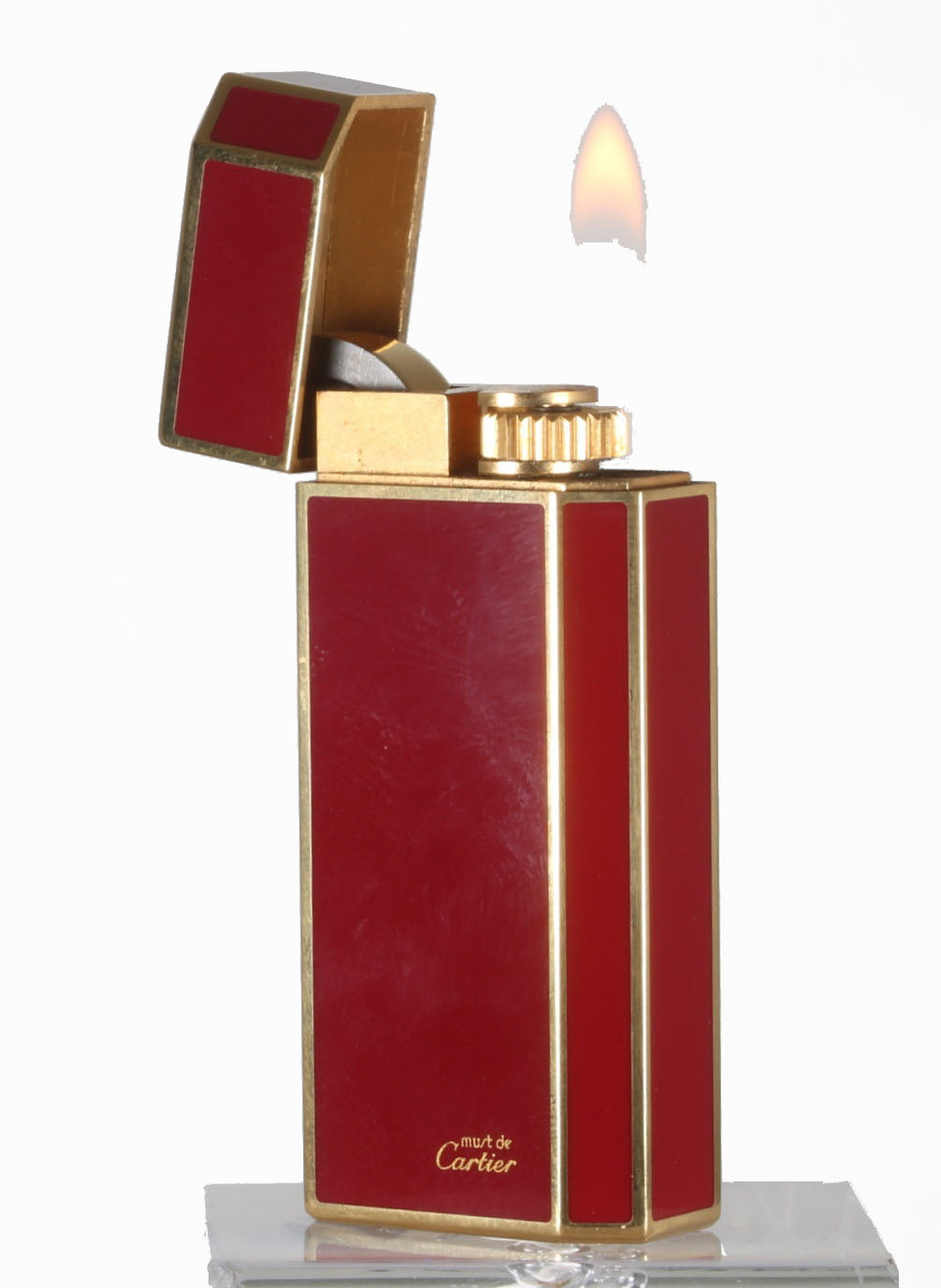 Mechero Cartier modelo Pentagon en laca burdeos y oro chapado. El mechero incluye su caja y garantía. El estado es como nuevo.