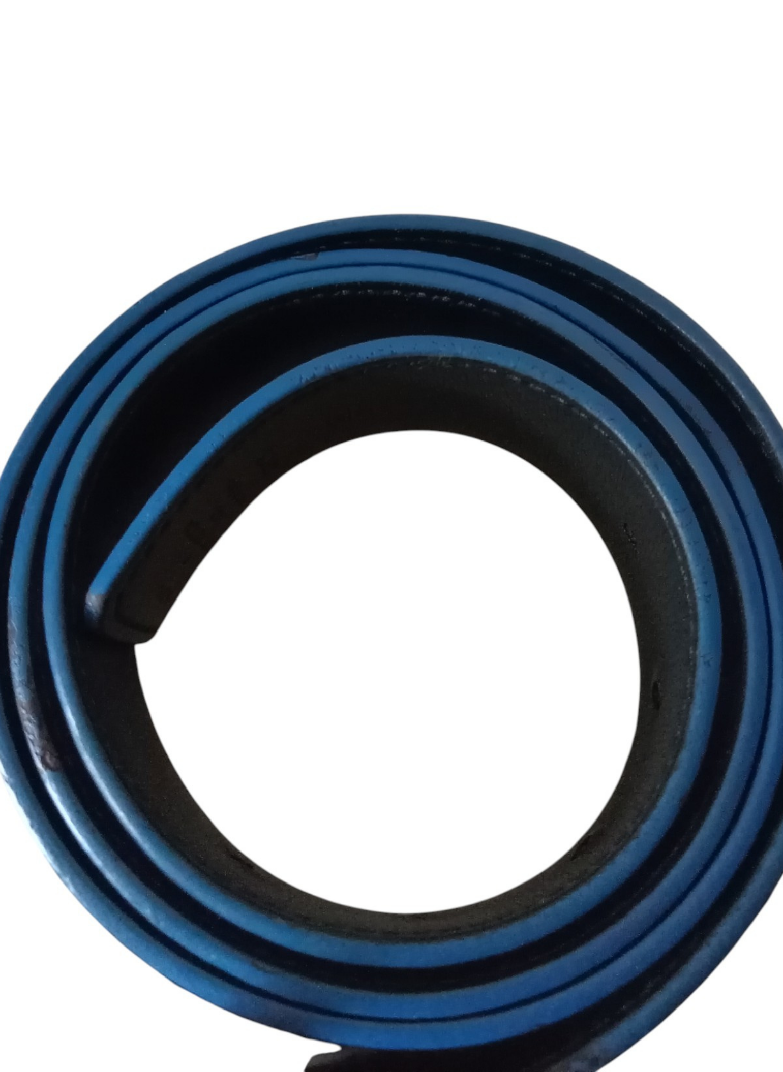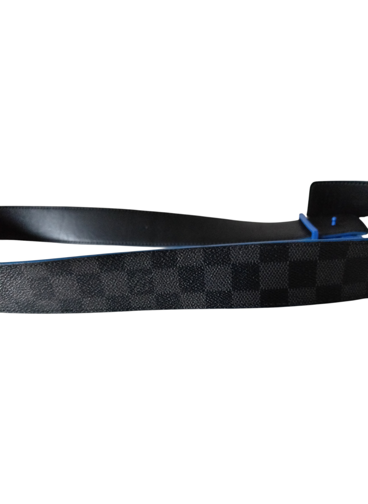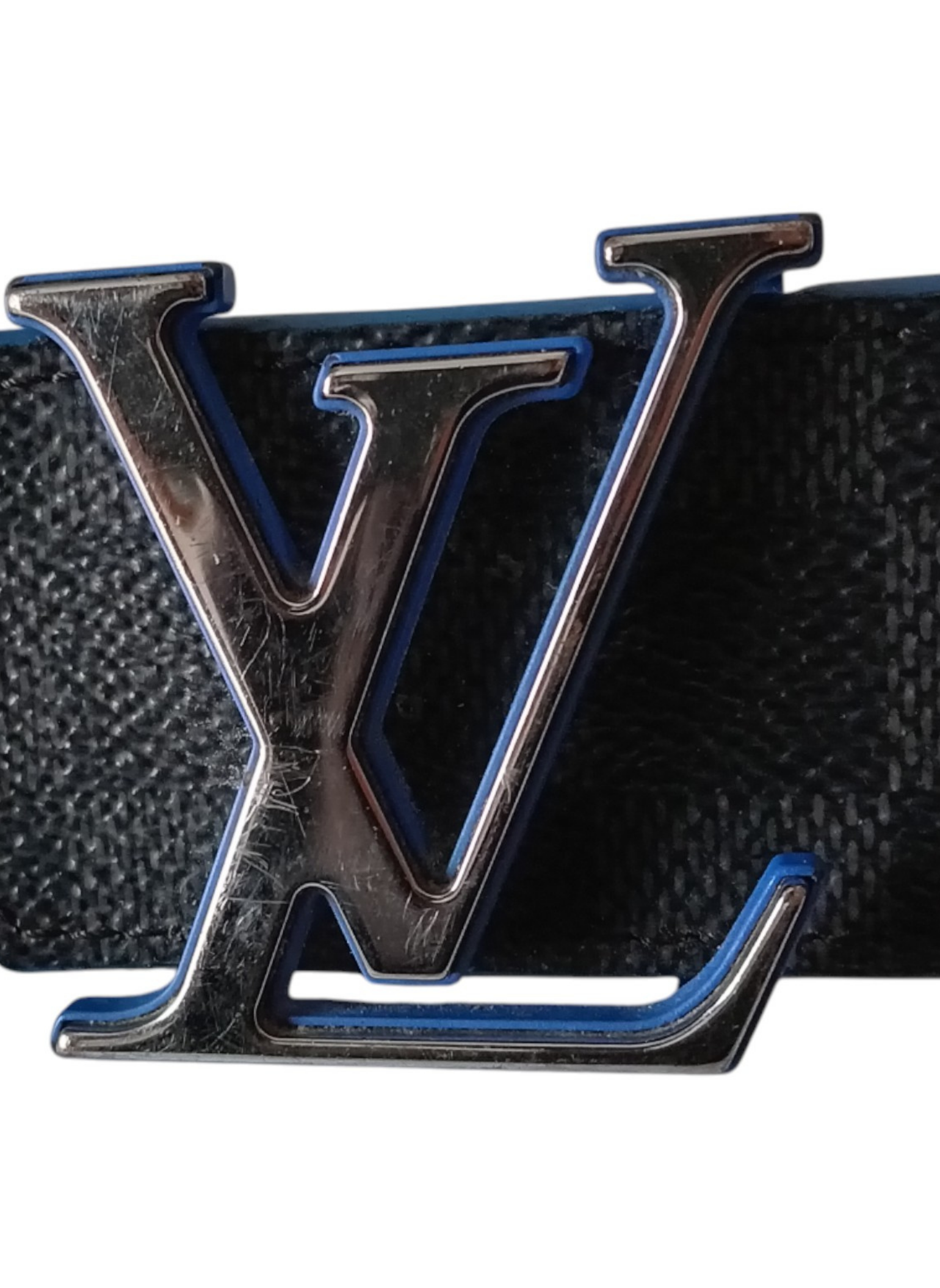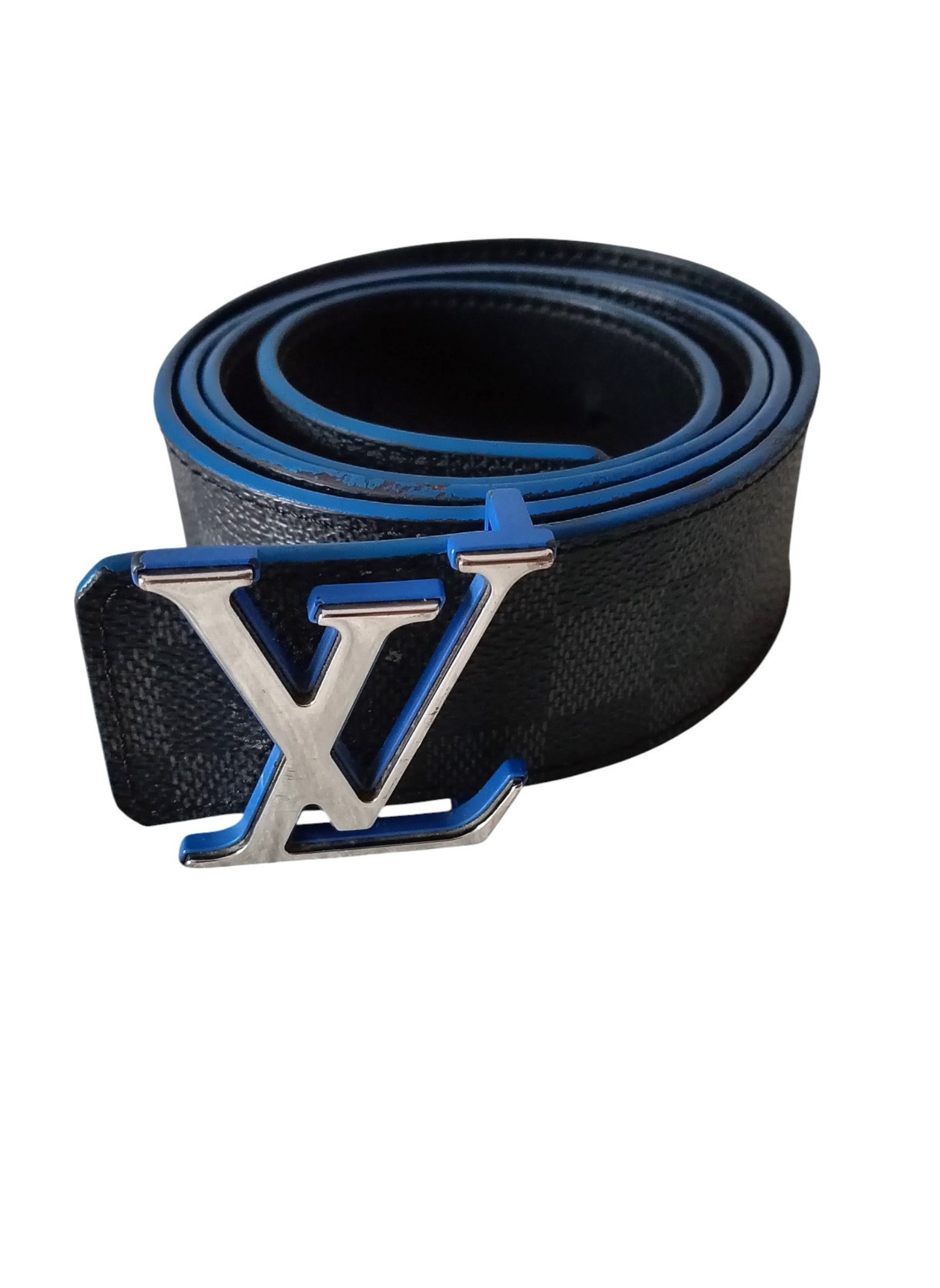 Cinturón de Louis Vuitton "Initiales" elaborado en lona damier Graphite y cuero negro por dentro,con iniciales LV en metal plateado,y con ribetes en azul.Esta en buen estado.Usado pero muy bien conservado. Mide 95 cms desde la hebilla hasta el agujero central y 4 cms de ancho.Unisex.