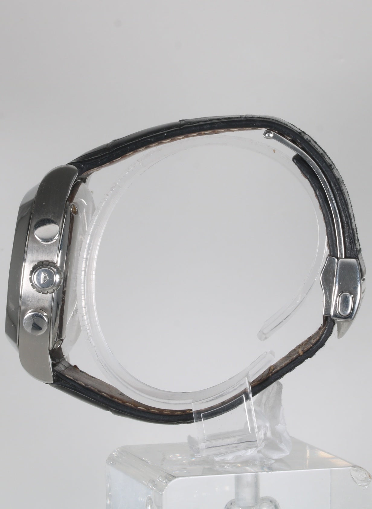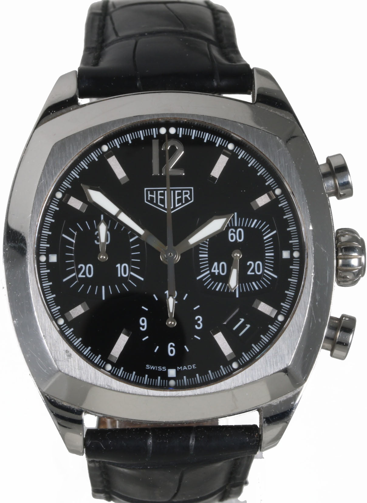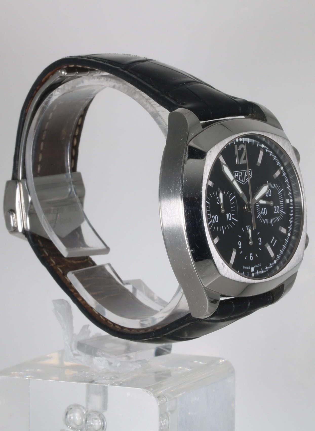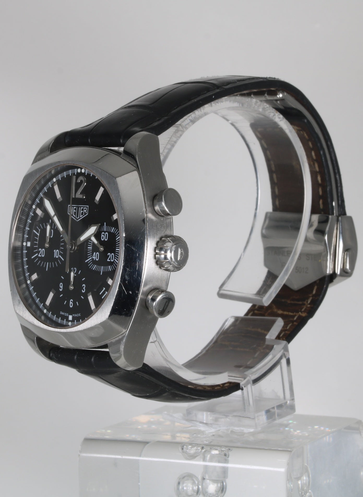 Heuer referencia CR2110 modelo Monza con caja de acero de 37.5mm y cristal de zafiro. Movimiento automático con función de cronógrafo y dia del mes. Esfera negra con manos y marcadores metálicos. Correa y hebilla originales Heuer. En buen estado.