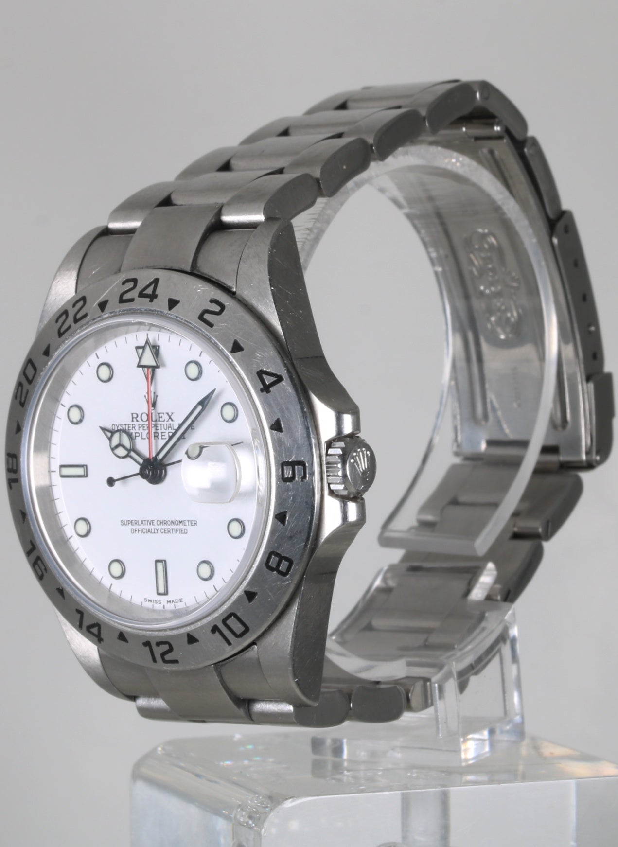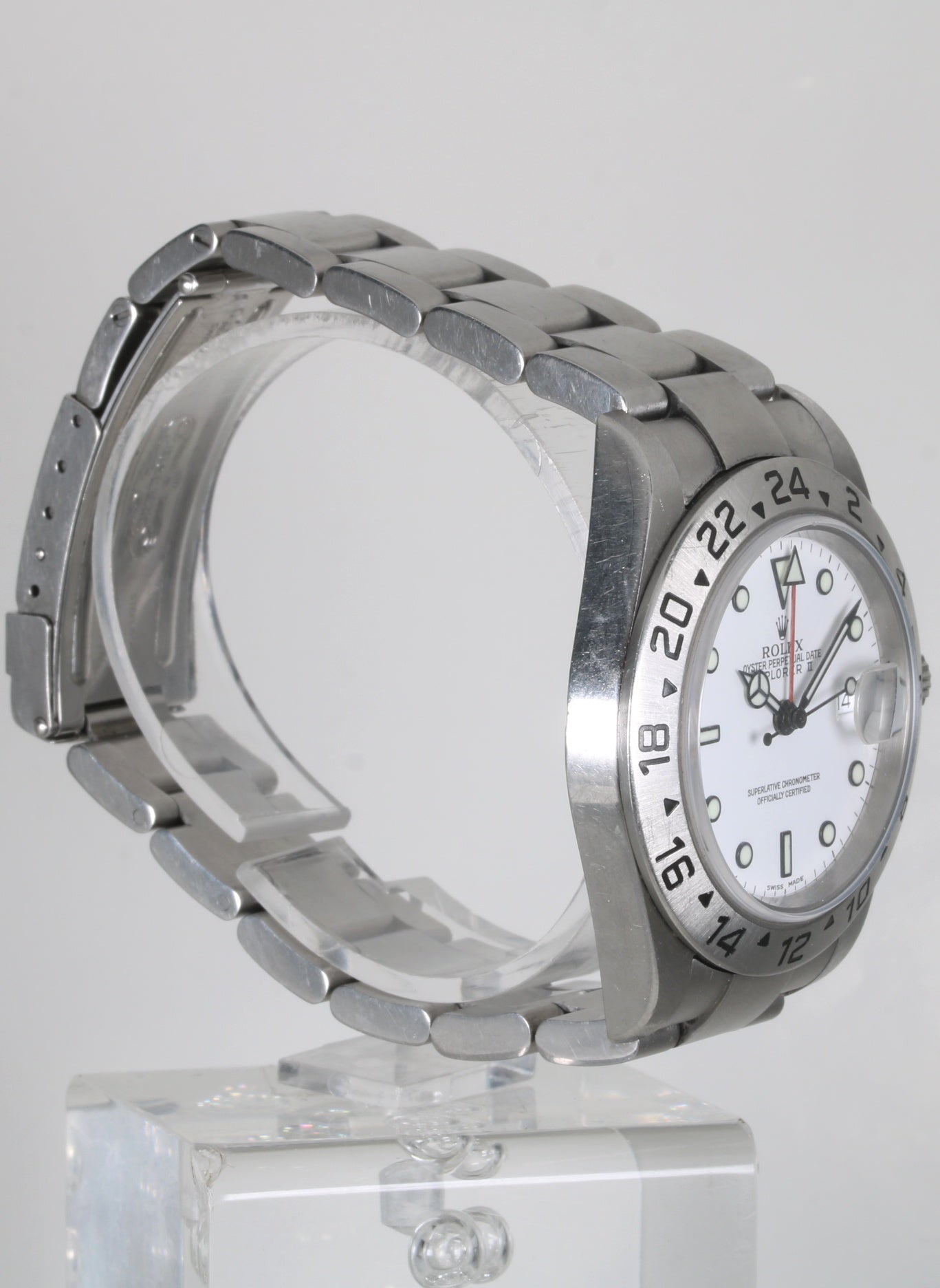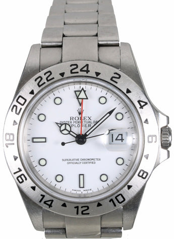 Rolex referencia 16570 modelo Explorer II conocido como Polar de 2004. Caja de acero de 40mm con cristal de zafiro. Movimiento automatico con función de fecha del mes. Atractiva esfera blanca en muy buen estado. Brazalete Roles modelo Oyster con trece eslabones. El reloj esta sin pulir por lo cual tiene ligeras señales de uso normales para un reloj de esta época.