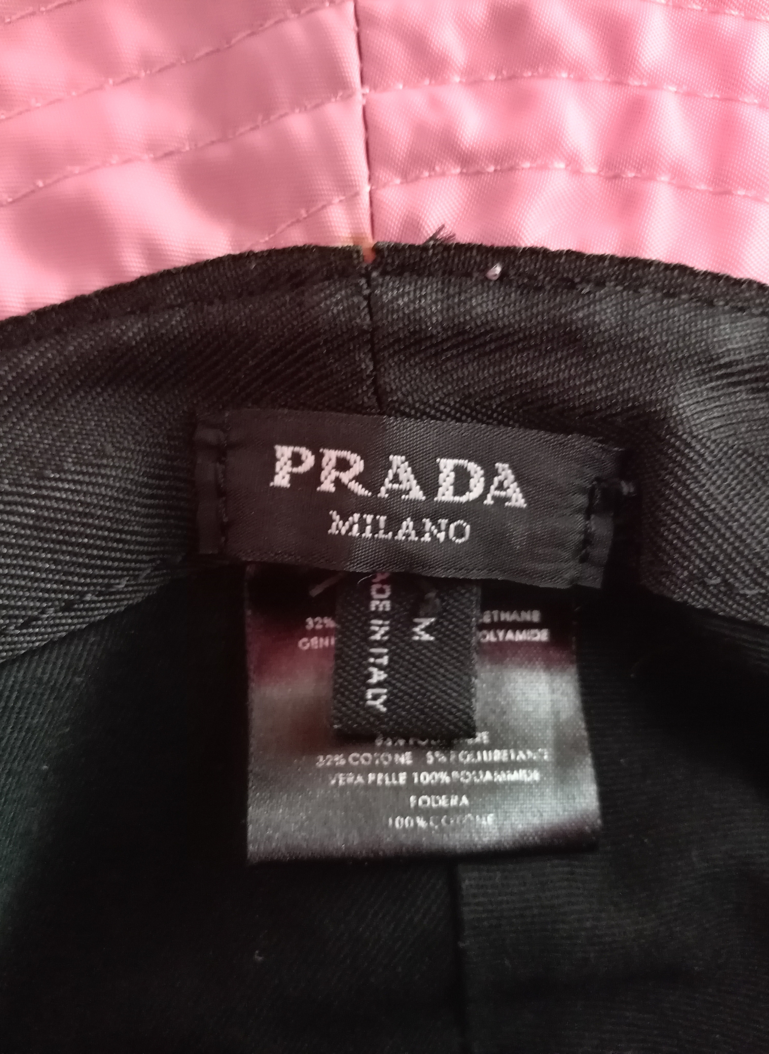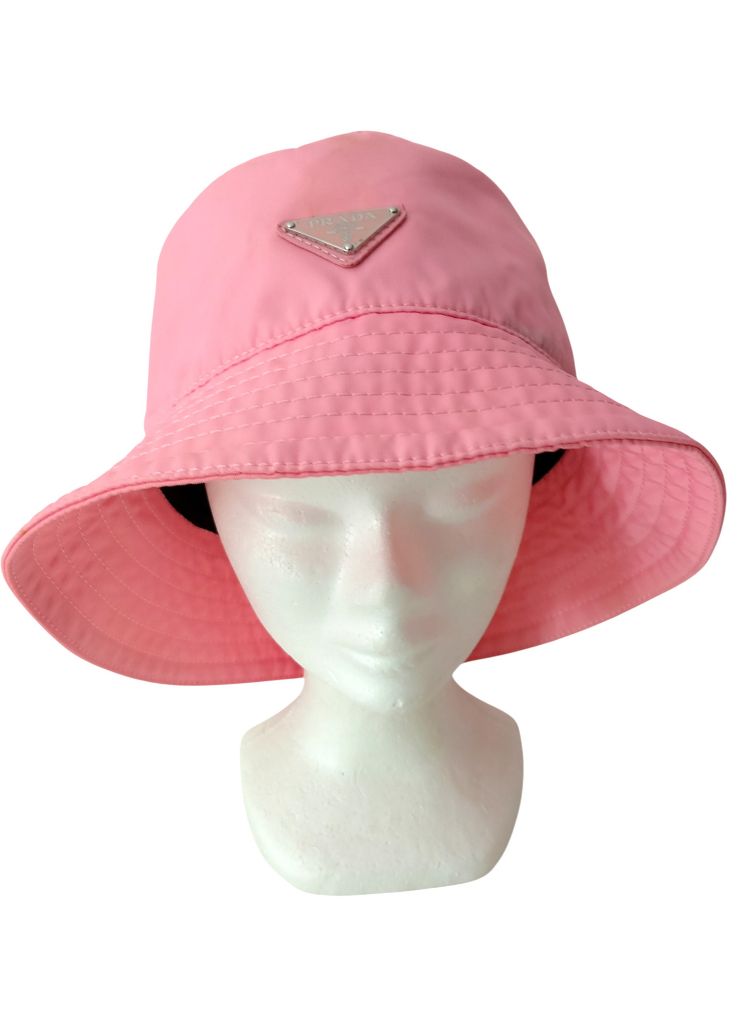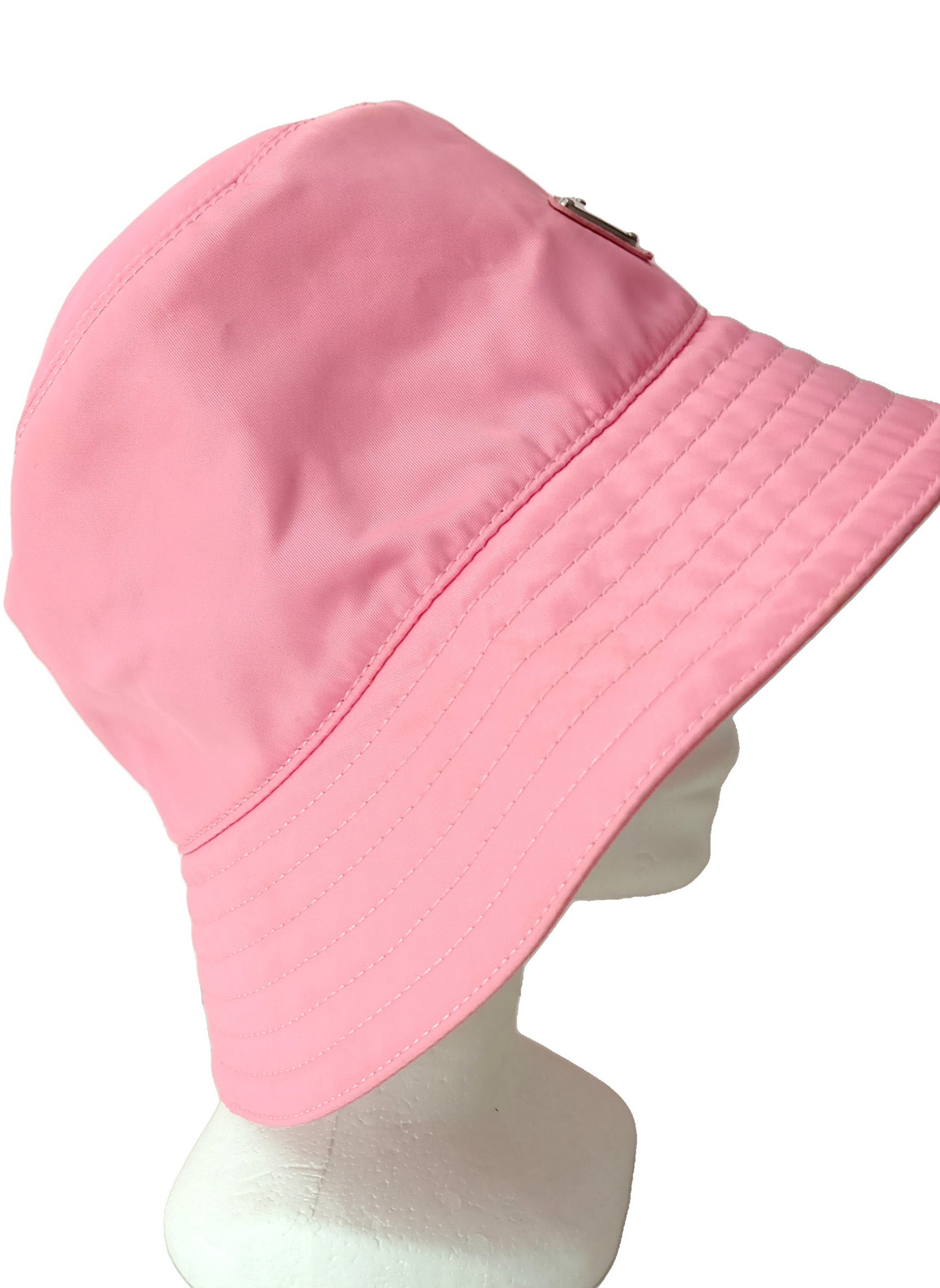 gorro tipo pescado de Prada,confeccionado en nylon color rosa con el triangulo de metal plateado y esmalte rosa,tipico emblema de Prada.Es una talla M.Esta en muy buen estado,solo tiene una pequeña mancha apenas apreciable.Medida: 55 cms de circunferencia.