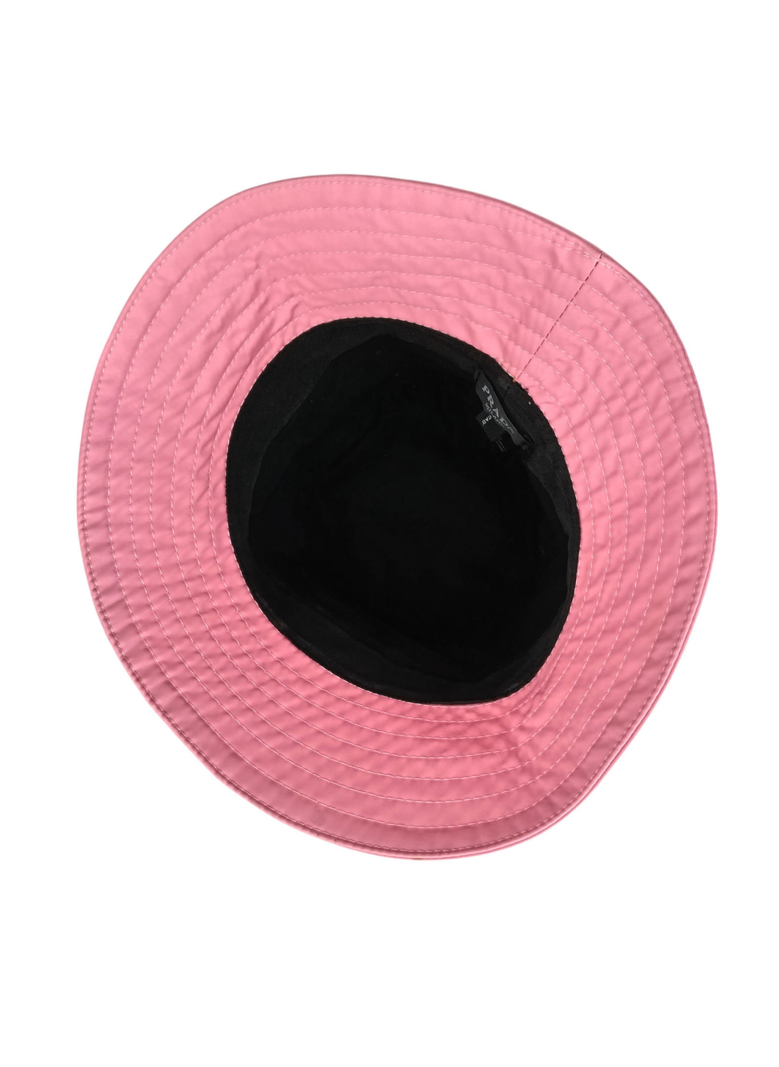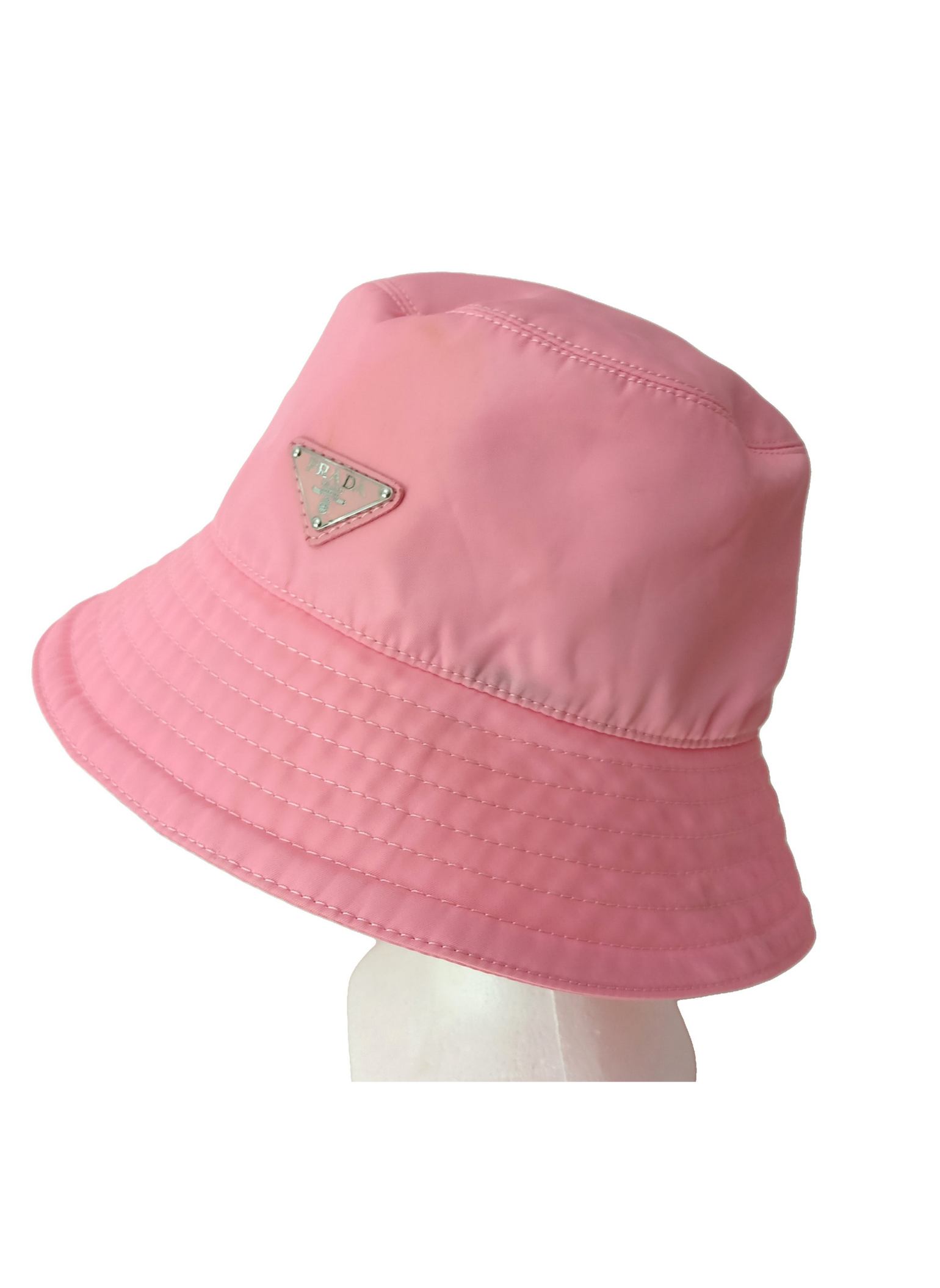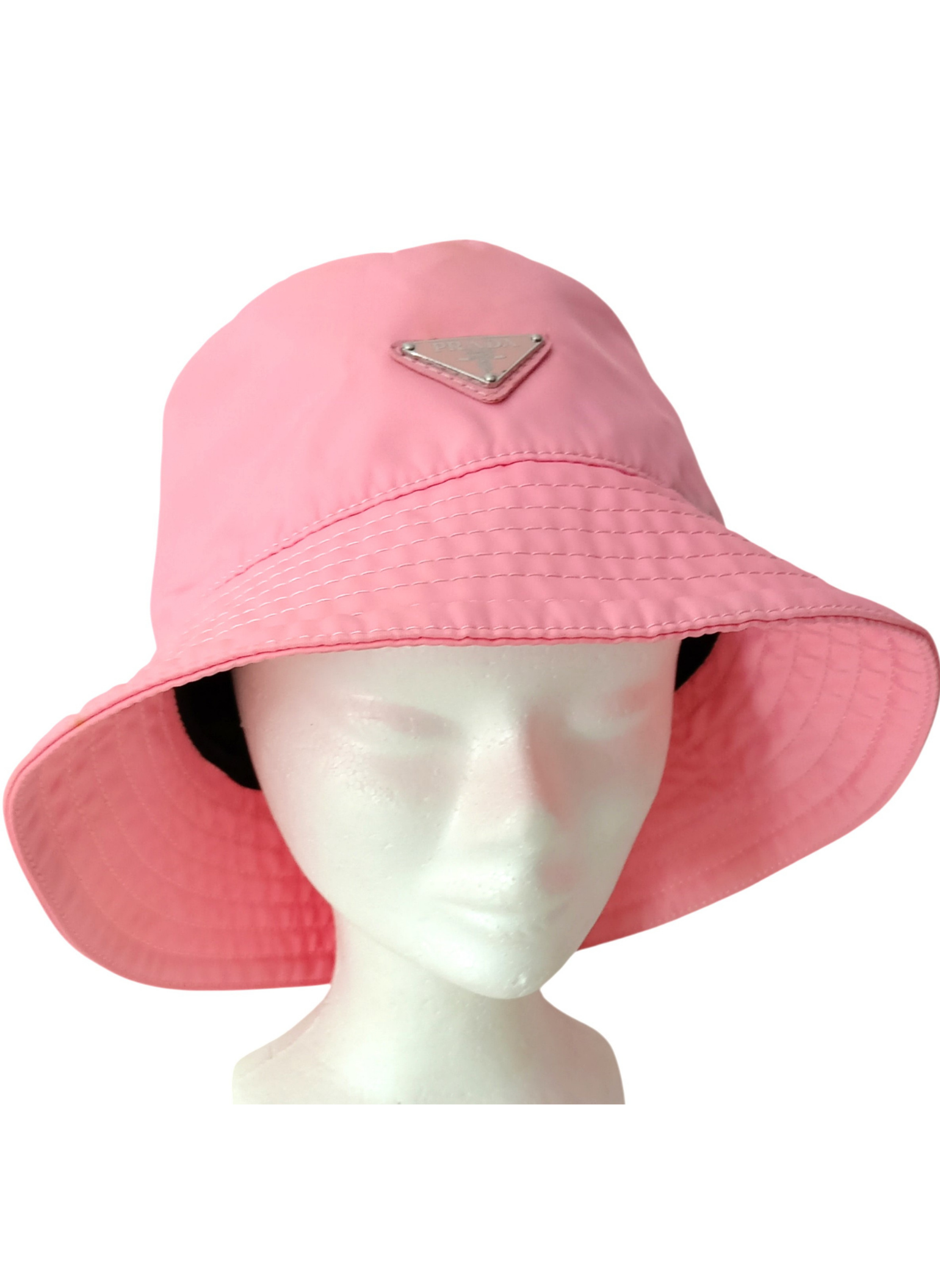 gorro tipo pescado de Prada,confeccionado en nylon color rosa con el triangulo de metal plateado y esmalte rosa,tipico emblema de Prada.Es una talla M.Esta en muy buen estado,solo tiene una pequeña mancha apenas apreciable.Medida: 55 cms de circunferencia.