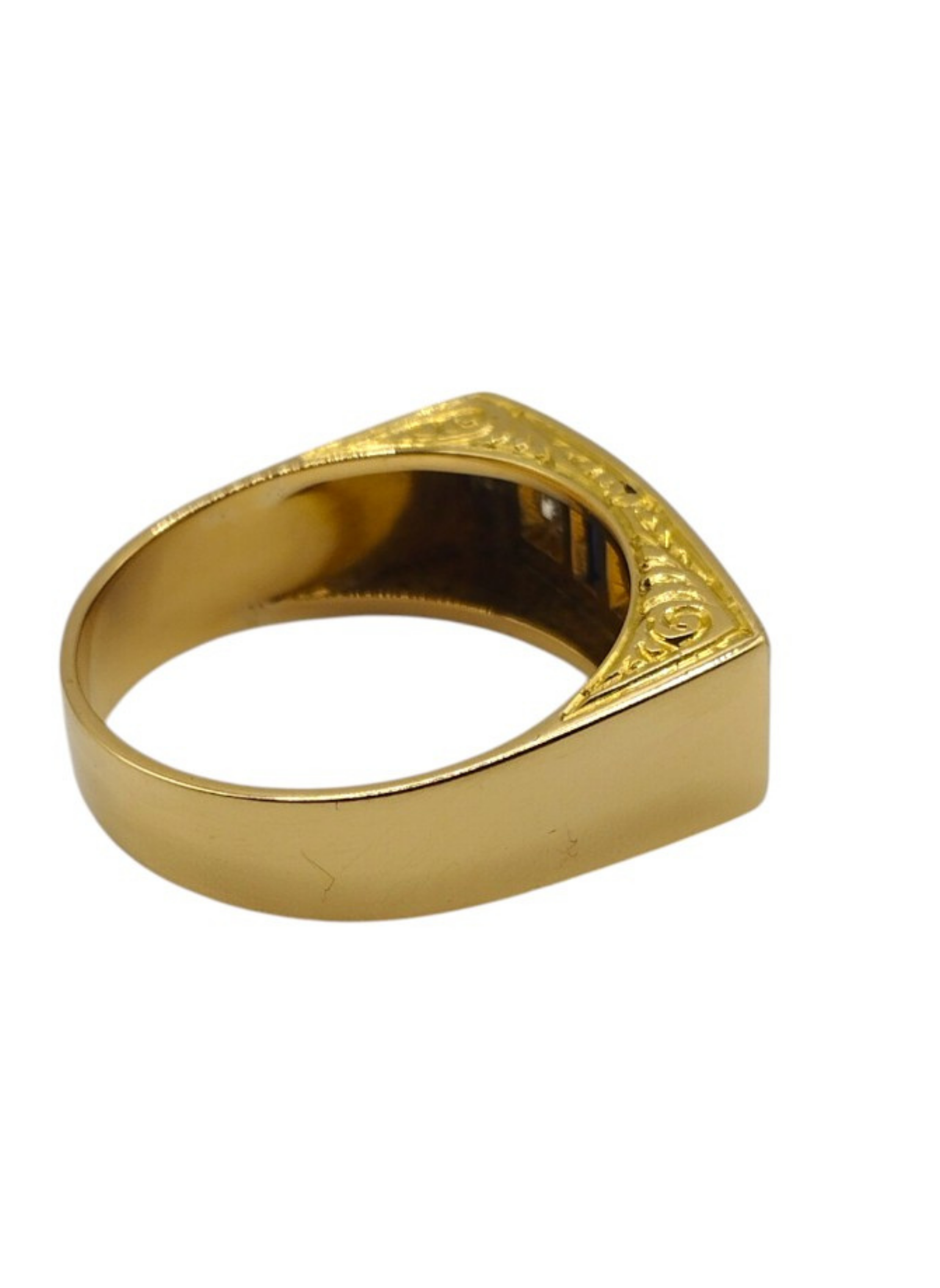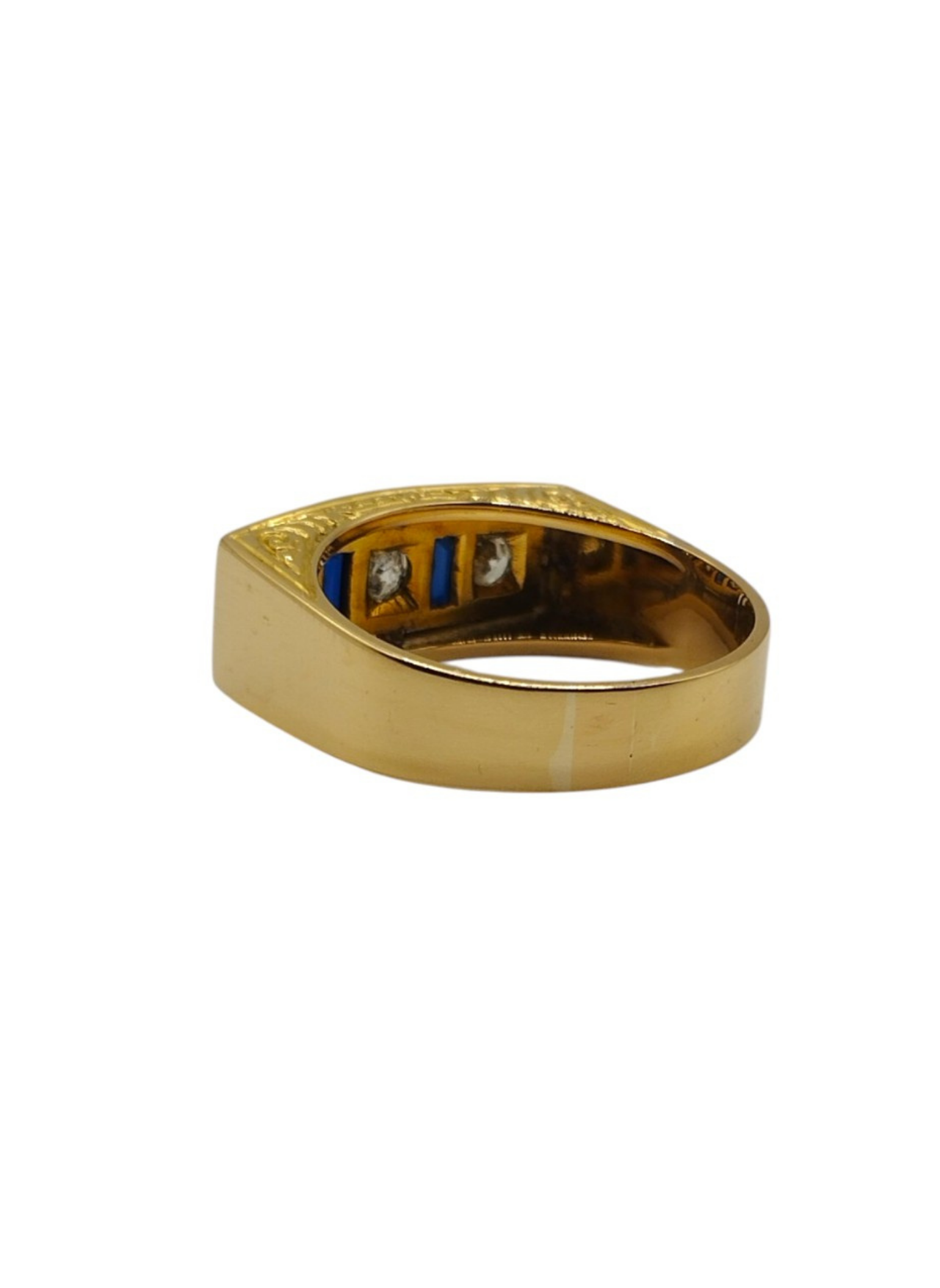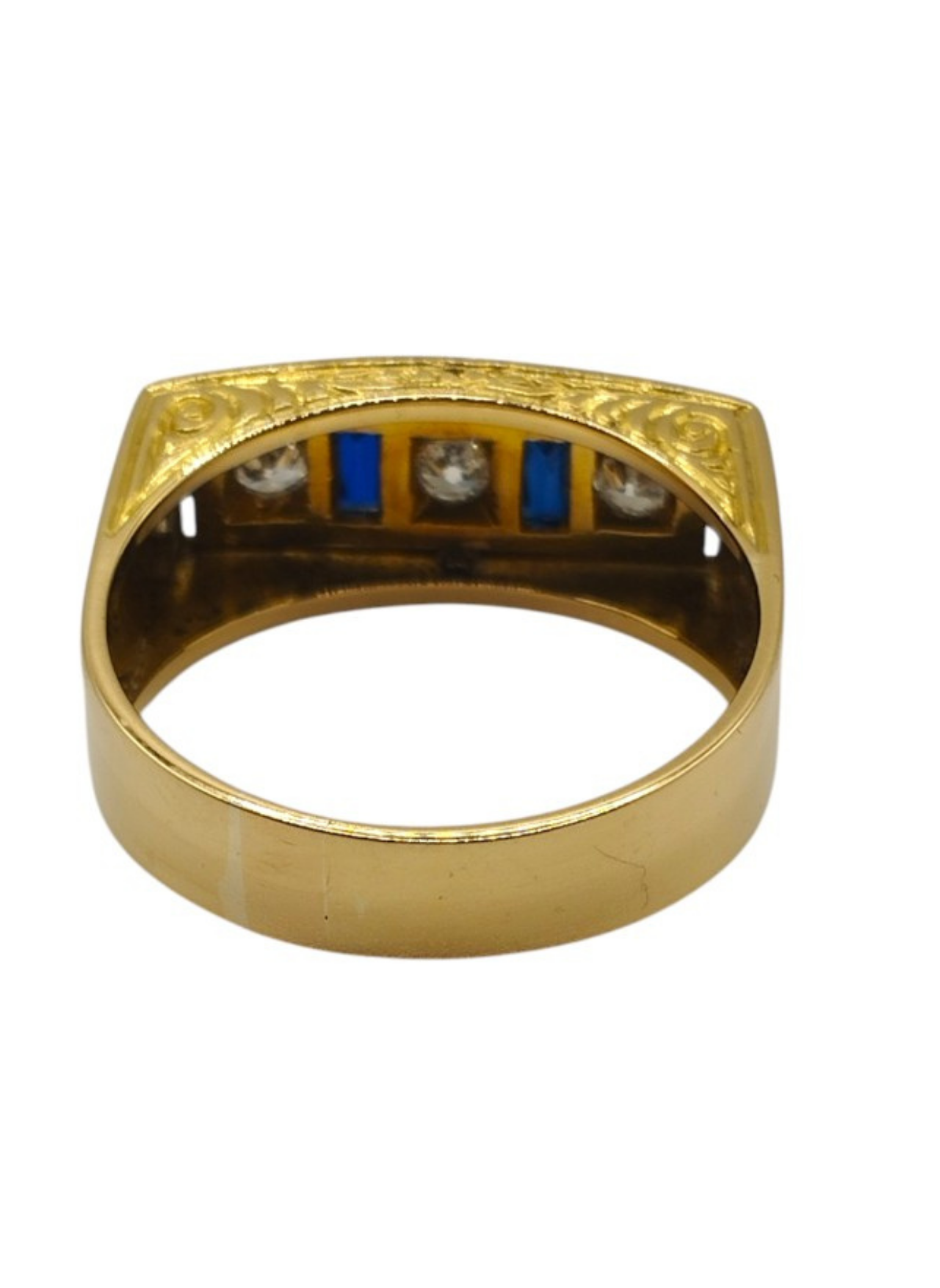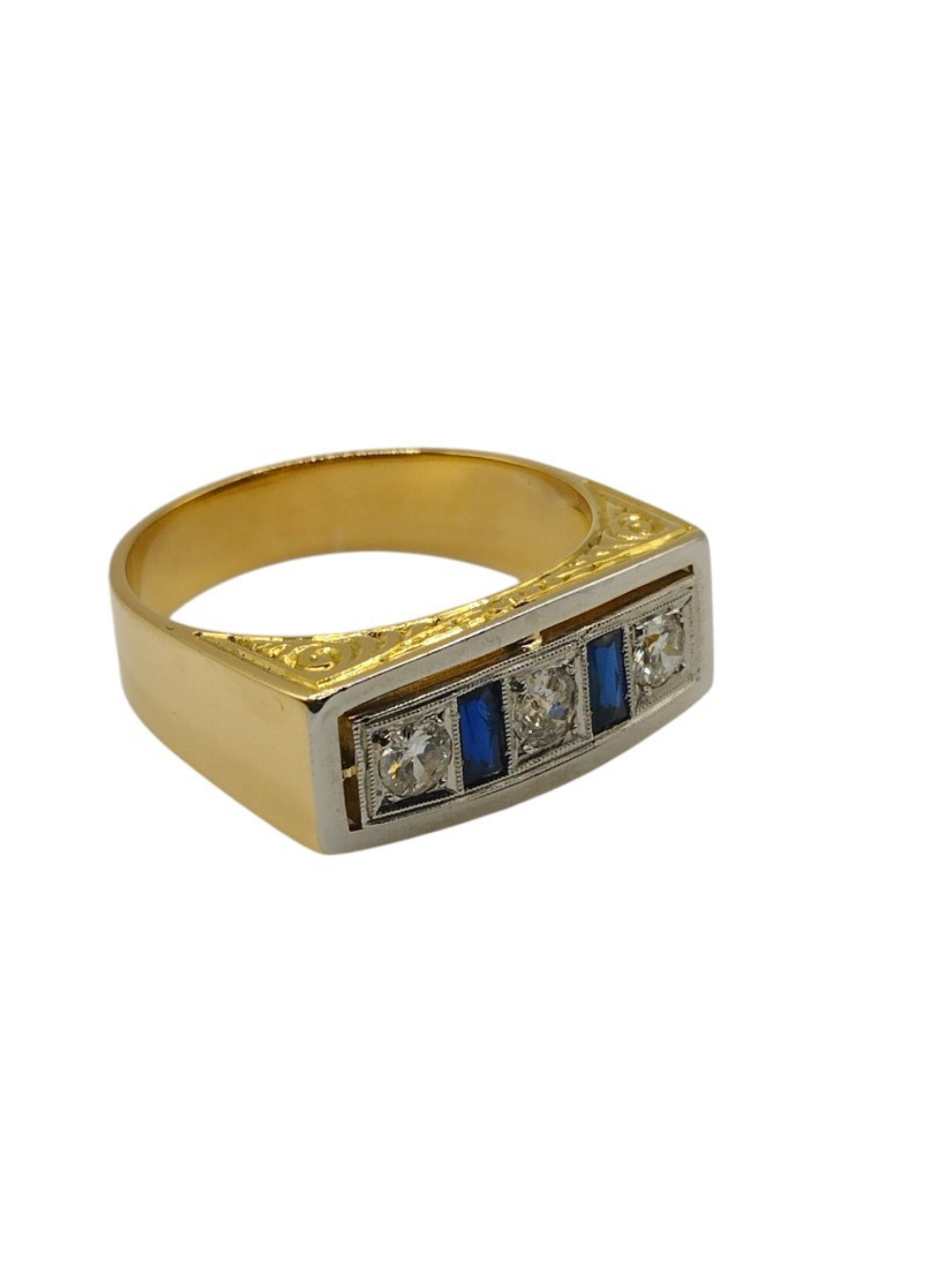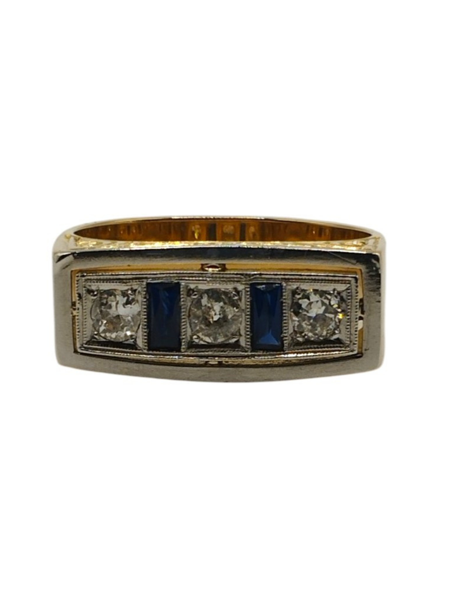 Sortija tipo tresillo de brillantes con zafiros en oro amarillo de 18 Kts con vistas en oro blanco de 18 Kts.Tres brillantes de 0,20 Qts cada uno y dos zafiros talla baguette.Es un numero 24,5.Pesa en total 9,7 grs.Con un peso en brillantes de 0,60 Qts.Es vintage,años 50.Muy buen estado.